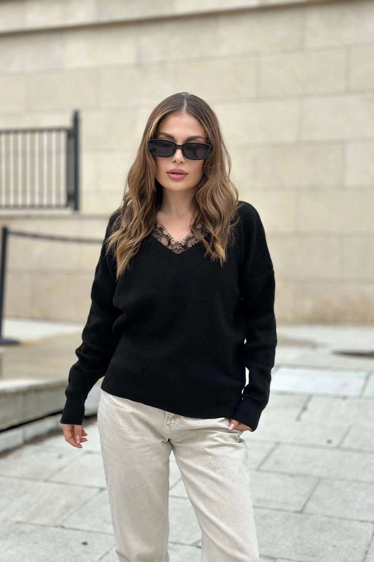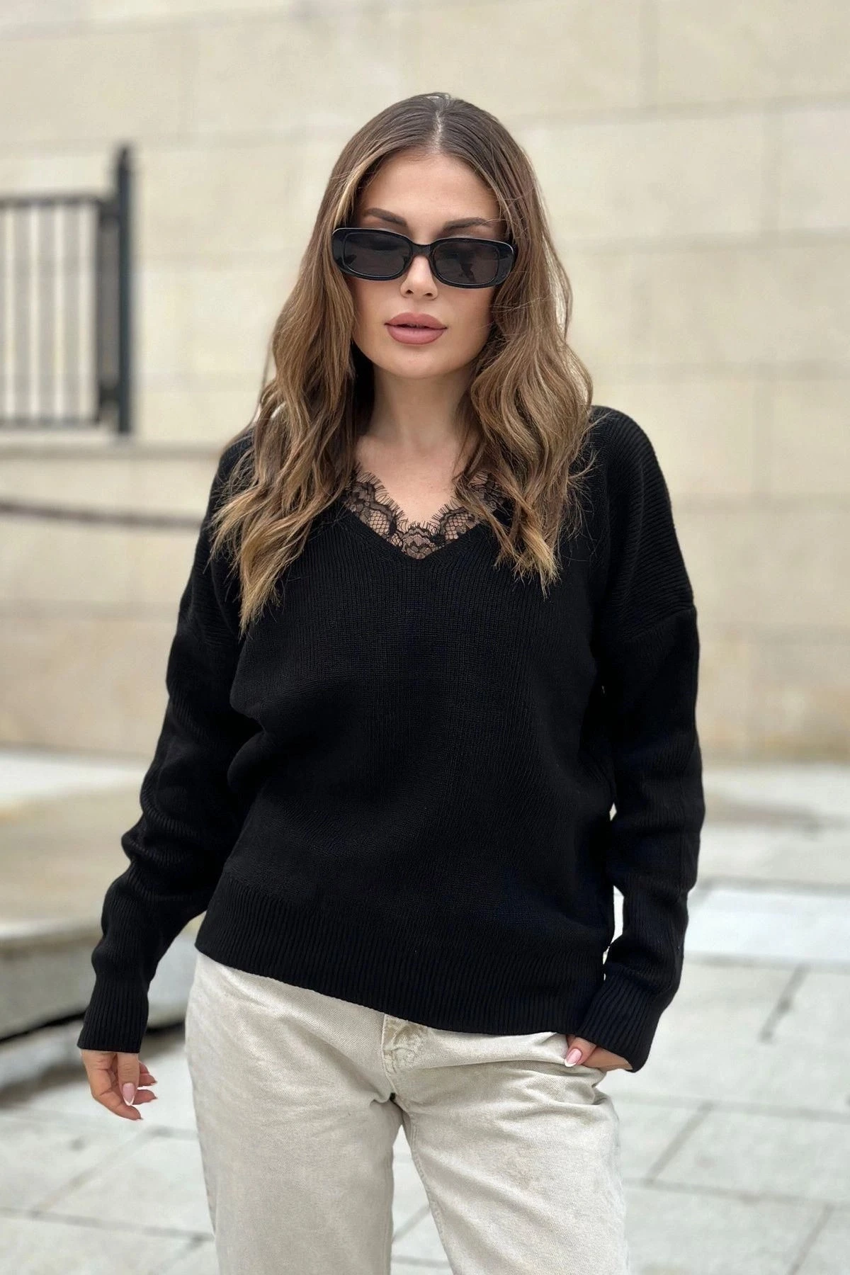 Kadın Siyah V Yaka, Dantel Detaylı Uzun Kol Yumuşak Dokulu Triko Kazak