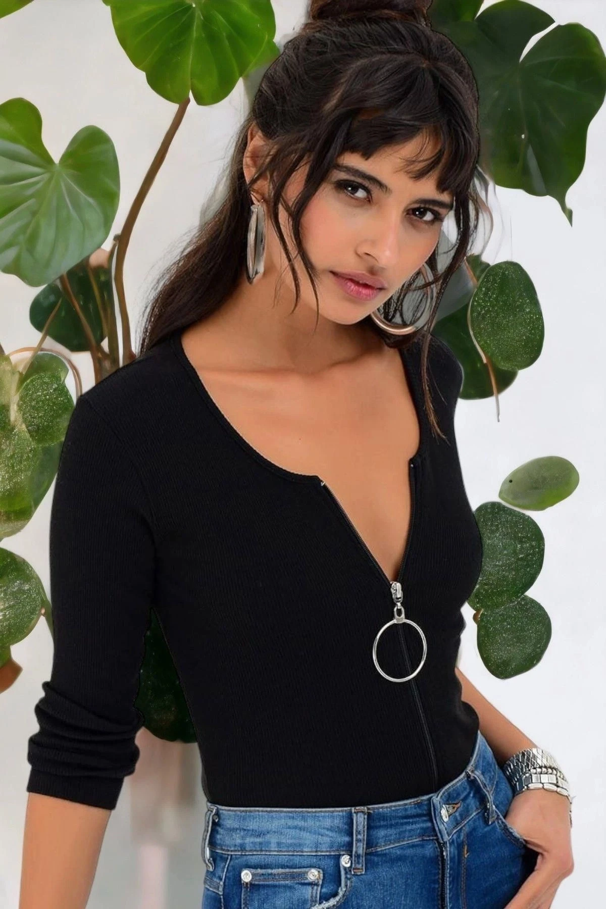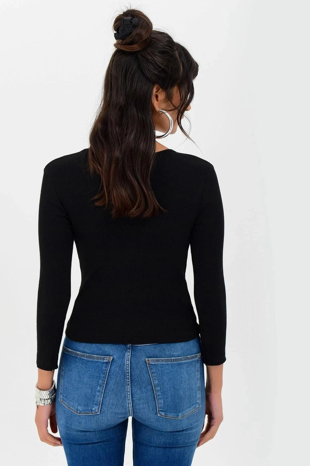 Kadın Siyah V Yaka Fermuar Detaylı Uzun Kol Regular Kesim Standart Boy Bluz