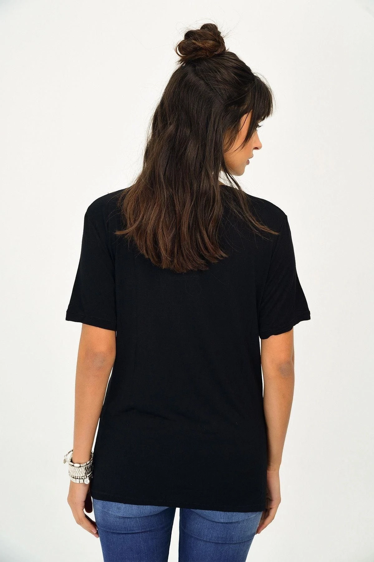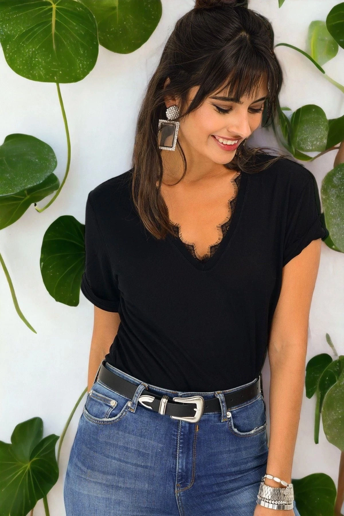Bu zarif ve şık bluz, gardırobunuzun vazgeçilmez bir parçası olacak! Siyah renkli V yaka ve kısa kollu tasarımıyla öne çıkan bu bluz, dantel detaylarıyla da büyüleyici bir hava katıyor.; Regular kesimi ve standart boyu sayesinde her bedene uyum sağlayan bir seçenek sunuyor.; Bu bluzun kumaş içeriği, %95 polyester ve %5 elastandan oluşuyor.; Polyester, dayanıklı ve esnek yapısıyla konforlu bir giyim deneyimi sunarken, elastan da bluzun vücudu saran ve şeklini koruyan bir yapıya sahip olmasını sağlıyor.; Bu sayede bluz, hareket özgürlüğü ve rahatlık sunarken, uzun süreli kullanımlarda da formunu koruyor.; Siyah rengi, her türlü kombinasyon için mükemmel bir seçenek olup, şıklığı ve zarafeti bir araya getiriyor.; Hem günlük hayatta hem de özel etkinliklerde şık bir görünüm elde etmek için ideal bir tercih.; Dantel detayları, bluza sofistike bir dokunuş katıyor.; İnce işçilikle tasarlanmış olan dantel detayları, bluzun üzerinde hoş bir kontrast yaratırken, zarif bir görünüm sunuyor.; Bu bluz, tarzınızı tamamlayacak ve sizi her ortamda öne çıkaracak.; Şıklığı ve rahatlığı bir arada sunan bu bluzu gardırobunuzdan eksik etmeyin!