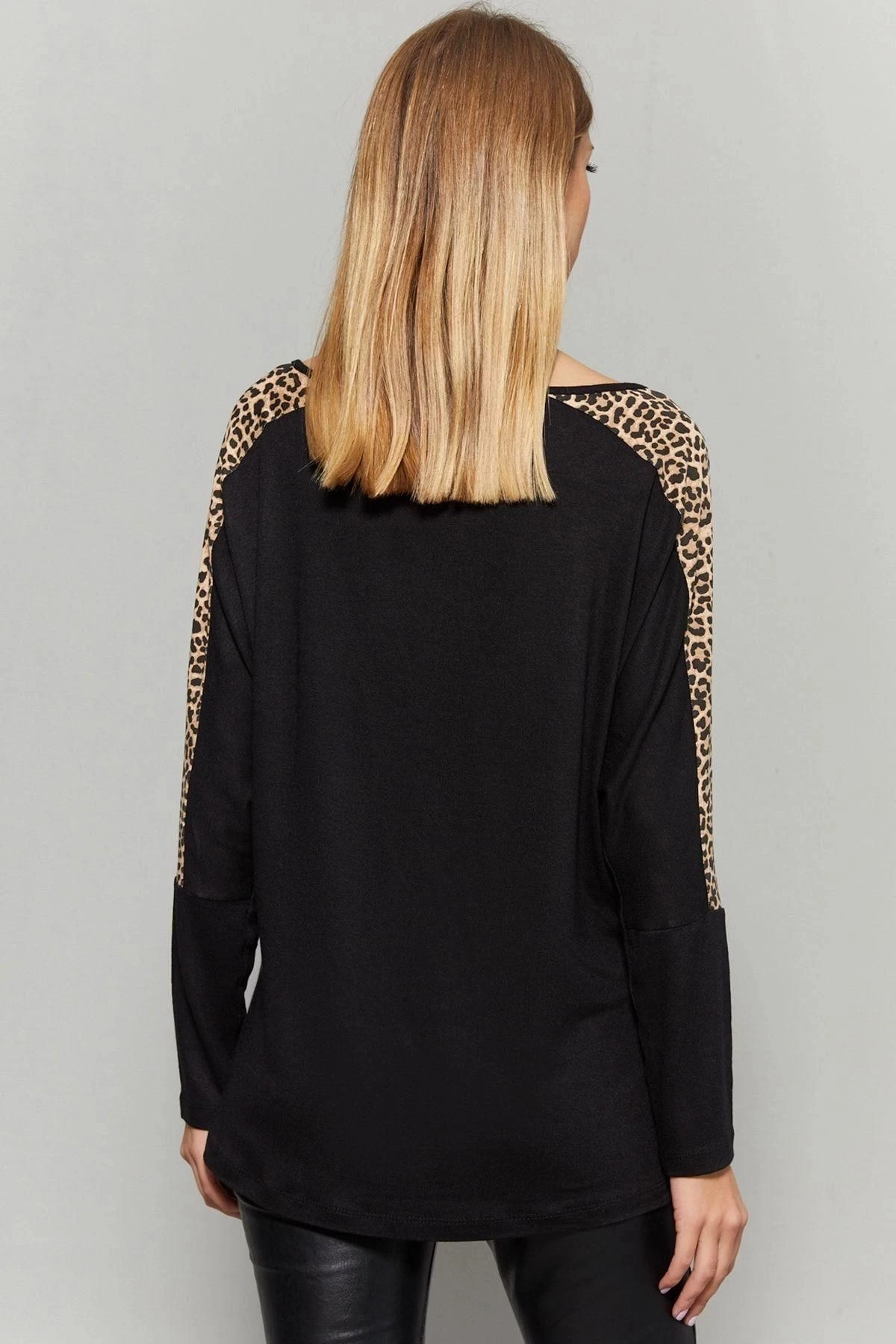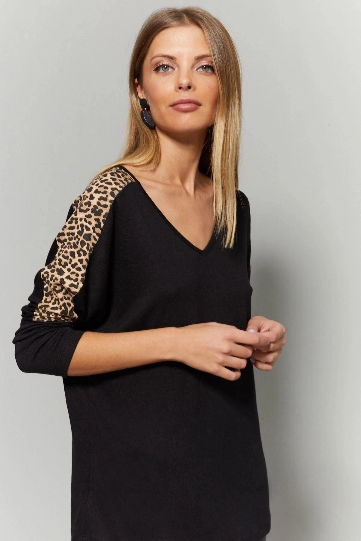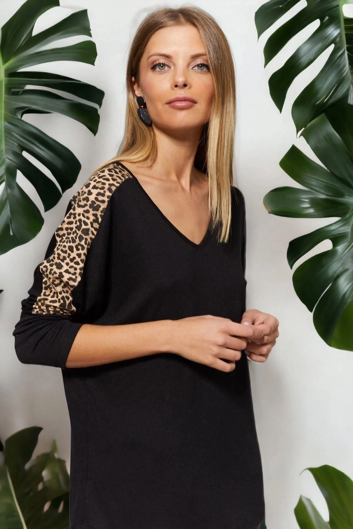 Bu şık ve modern Siyah Renk V Yaka Leopar Desenli Uzun Kol Bluz, gardırobunuza hareketli ve göz alıcı bir dokunuş katacak.; Bu bluzun tasarımı, leopard desenin sofistike bir şekilde kullanılmasıyla öne çıkıyor.; Leopar deseni, zarif ve çarpıcı bir görünüm yaratırken, siyah renklenmesi ise zamansız bir şıklık sunuyor.; Bluz, %95 Polyester ve %5 Elastane kumaş içeriğiyle üretilmiştir.; Bu malzeme kombinasyonu, bluza iyi bir şekil verirken aynı zamanda rahat bir giyim deneyimi sunar.; Polyester, dayanıklılık sağlayarak bluzun uzun ömürlü olmasını garanti ederken, elastane ise hareket özgürlüğü ve esneklik sunar.; Regular kesimi ve standart boyuyla bu bluz, çoğu bedene uyum sağlar ve her vücut tipinde şık bir görünüm elde etmenizi sağlar.; V yaka detayı, feminen bir siluet oluştururken, uzun kolları bluza modern bir tarz katar.; Bu bluz, günlük hayatta rahatlıkla giyebileceğiniz çok yönlü bir parçadır.; Şık bir iş ortamında veya arkadaşlarınızla buluştuğunuz bir akşam yemeğinde stilinizi tamamlayacak mükemmel bir seçimdir.; Tarzınıza biraz cesaret ve enerji katmak isterseniz, Siyah Renk V Yaka Leopar Desenli Uzun Kol Bluz tam size göre!