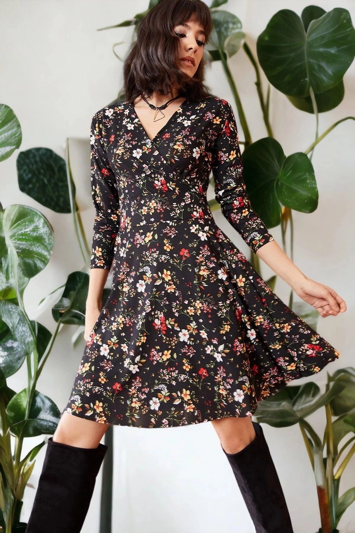 Kadın Siyah V Yaka Uzun Kol Çiçek Desenli Kloş Kaliteli Kumaş A Kesim Midi Boy Diz üstü Elbise