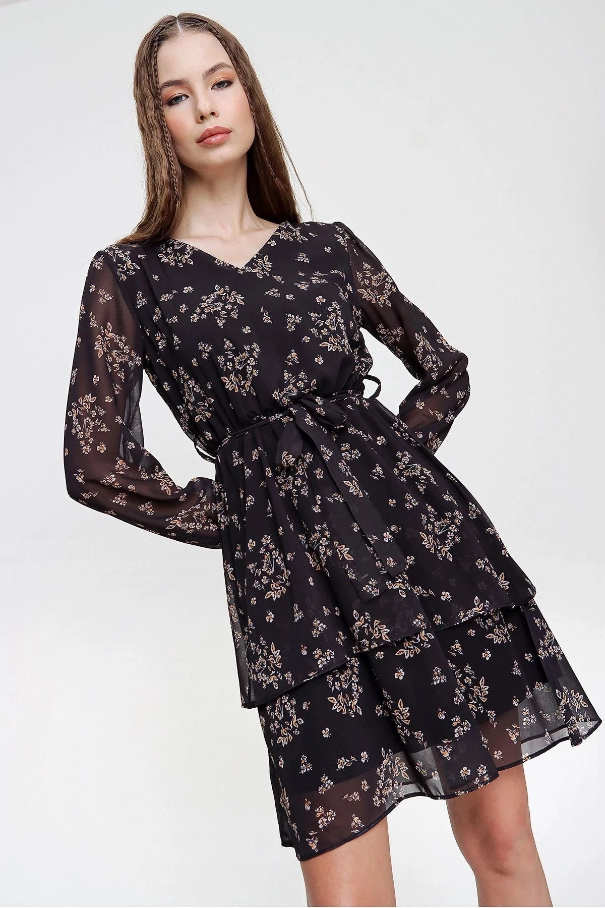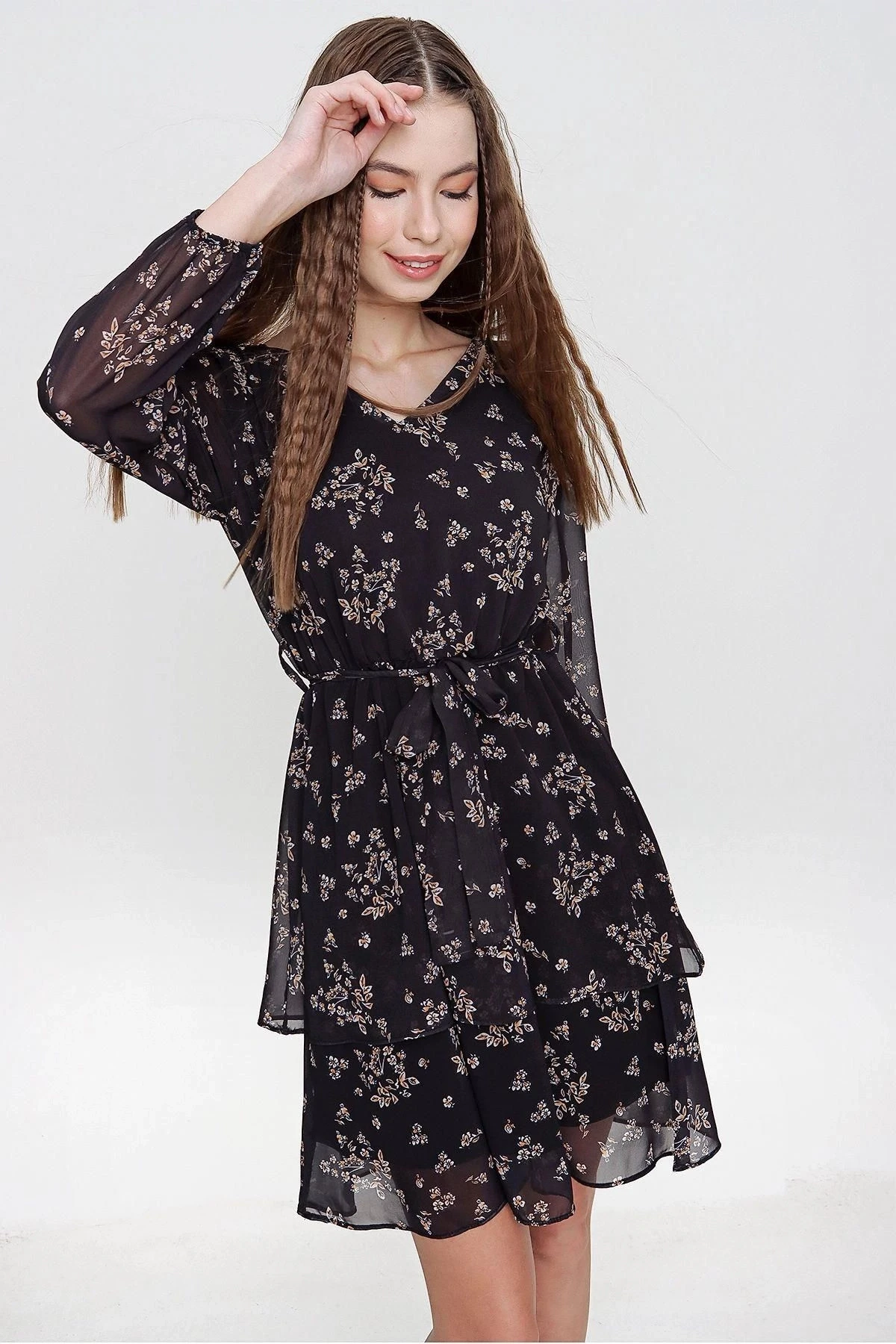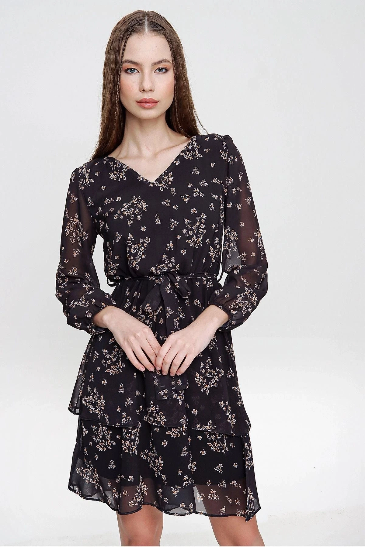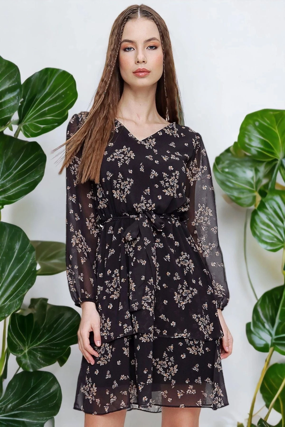 Kadın Siyah V Yaka Uzun Kol Çiçek Desenli Kuşaklı Şifon A Kesim Midi Boy Diz üstü Elbise