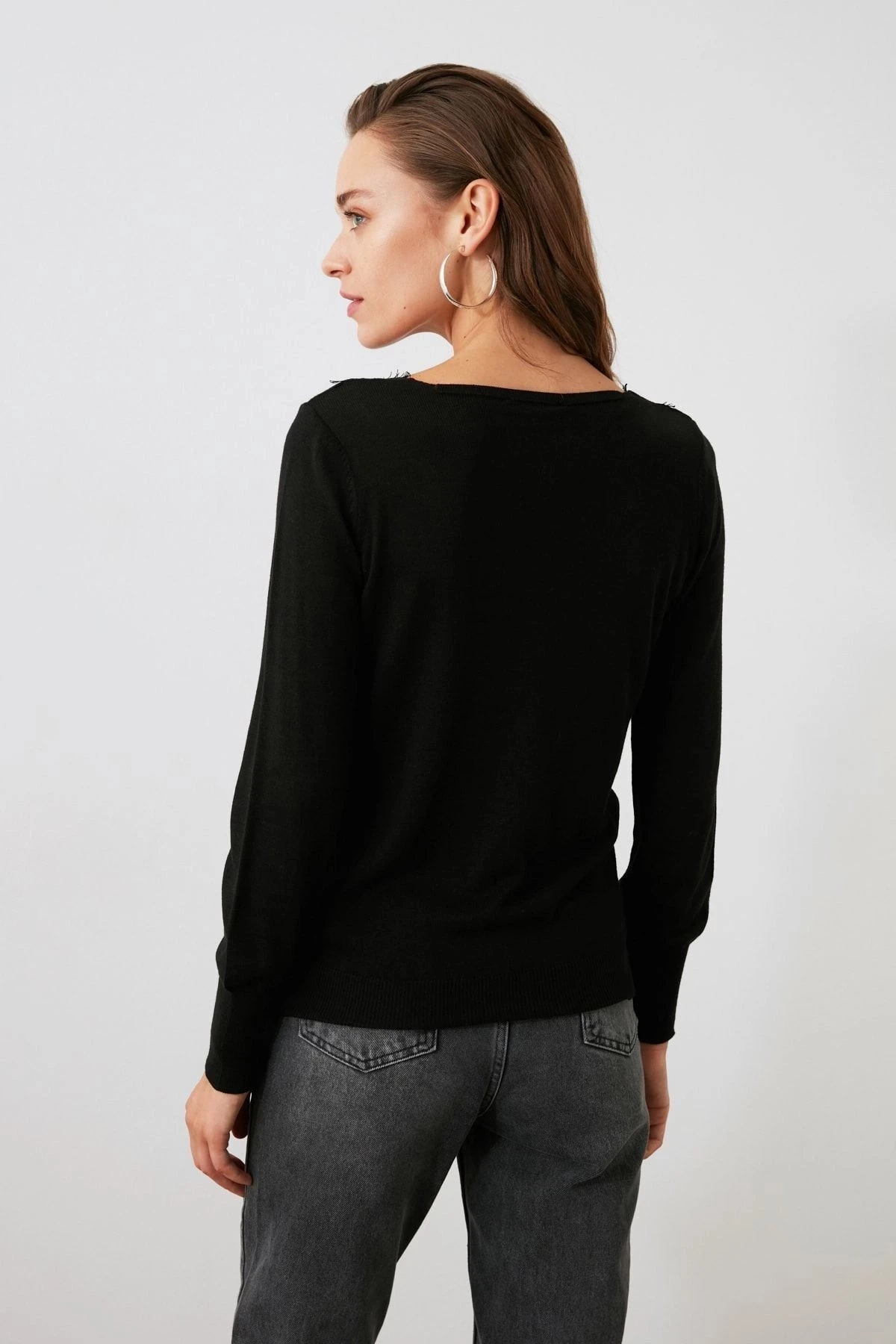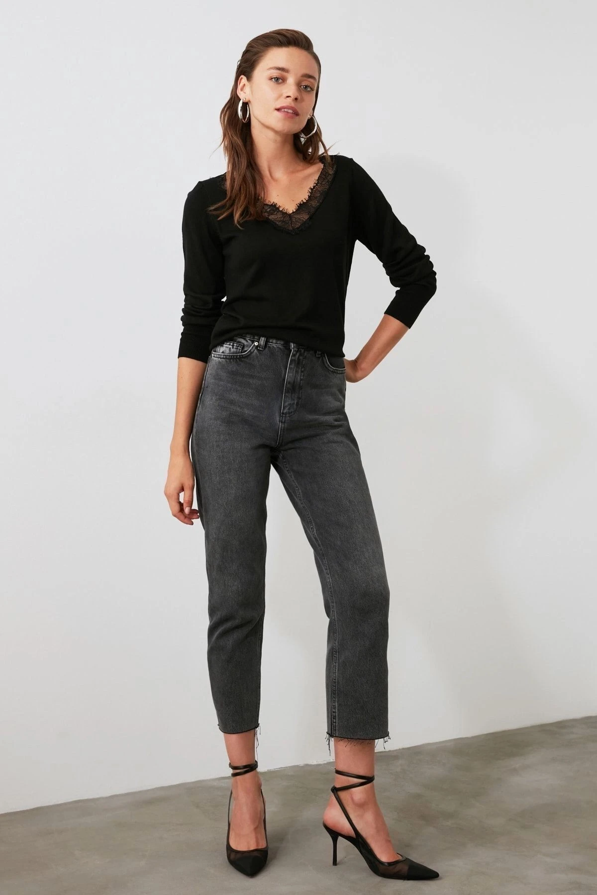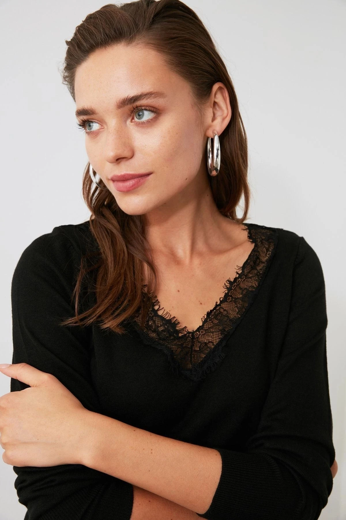 Kadın Siyah V Yaka, Uzun Kol, Dantel Detaylı, Regular Kesim, Standart Boy Triko.