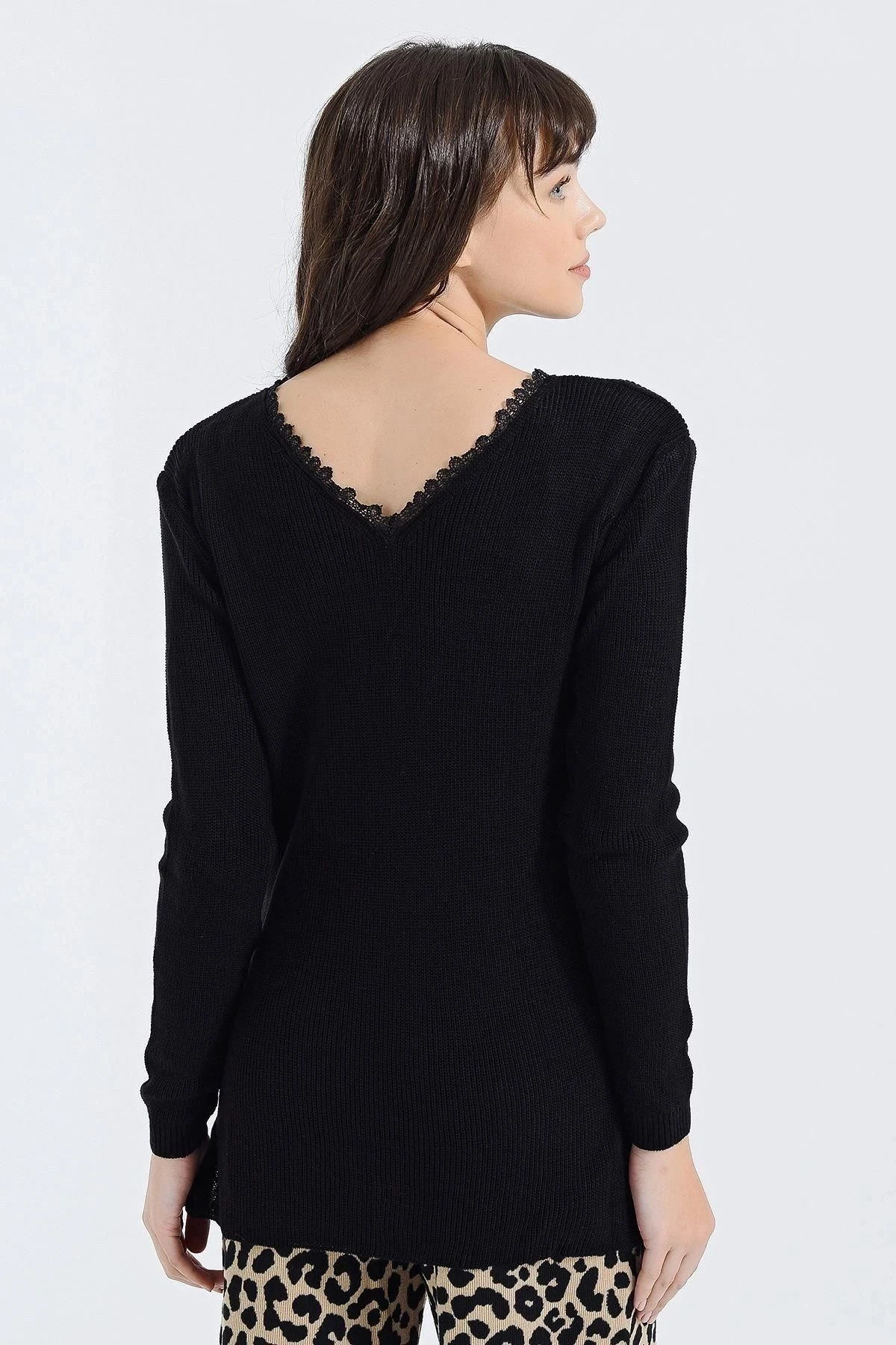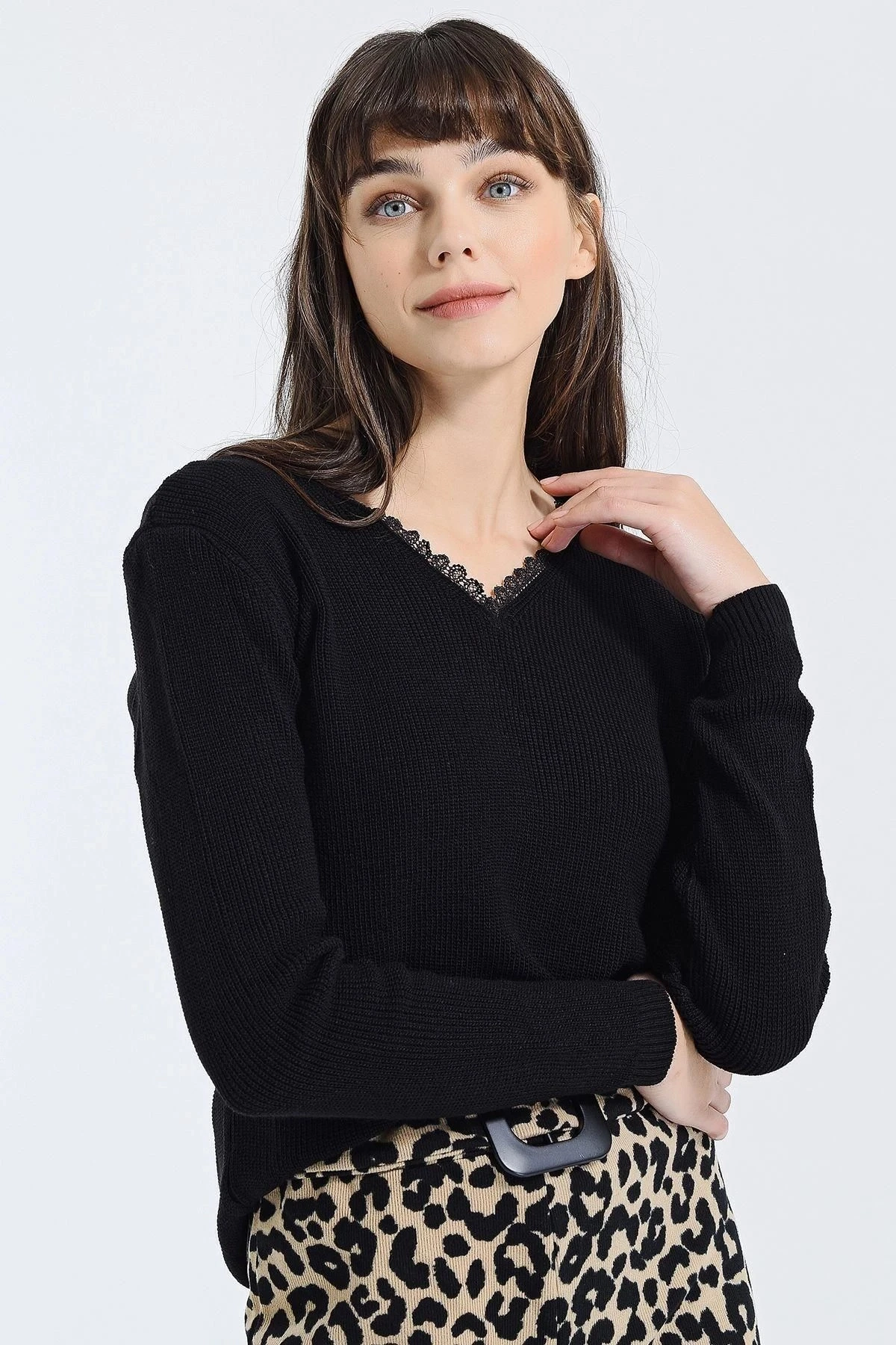 Bu şık triko, siyah renkte ve V yaka tasarıma sahiptir.; Uzun kollu olan trikonun manşetleri dantel detaylıdır, bu da ona zarif bir görünüm katmaktadır.; Regular kesimi ve standart boyuyla, her bedene uyum sağlar.; Bu trikonun kumaşı %50 akrilik ve %50 pamuktan oluşmaktadır.; Bu kumaş karışımı, trikonun yumuşaklığını ve dayanıklılığını bir araya getirir.; Akrilik lifler, trikonun sıcaklık ve esneklik sağlamasına yardımcı olurken, pamuk lifleri ise doğal ve nefes alabilir bir his sağlar.; Siyah rengi, her mevsim ve her stil için mükemmel bir seçimdir.; Şıklığı ve asaletiyle ön plana çıkar, aynı zamanda giyim kombinasyonlarında çok yönlülük sunar.; Bu triko, herhangi bir kıyafeti tamamlamak ve tarzınızı ifade etmek için mükemmel bir seçenektir.; V yaka tasarımı, boynunuzu zarifçe vurgular ve çekici bir görünüm sunar.; Dantel detayları, trikonun feminen ve zarif bir havaya sahip olmasını sağlar.; Bu detaylar, trikoyu özel kılan ve ona benzersiz bir dokunuş katan unsurlardır.; Regular kesim ve standart boyu, rahat bir uyum sağlar ve vücudu saran bir siluet oluşturur.; Triko, hem günlük giyimde hem de özel etkinliklerde mükemmel bir seçenektir.; Herhangi bir pantolon, etek veya şort ile kombinlenebilir ve farklı stillere kolayca uyum sağlar.; Bu triko, kumaş kalitesi, şık tasarımı ve zarif detaylarıyla öne çıkar.; Hem rahat hem de şık bir seçenek arayanlar için mükemmel bir tercihtir.; Gardırobunuzun vazgeçilmez bir parçası olacak ve tarzınızı her seferinde tamamlayacaktır.
