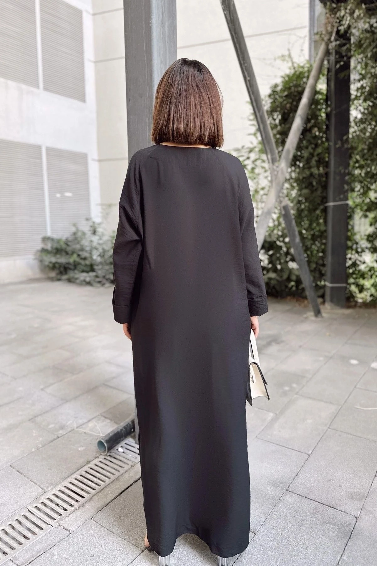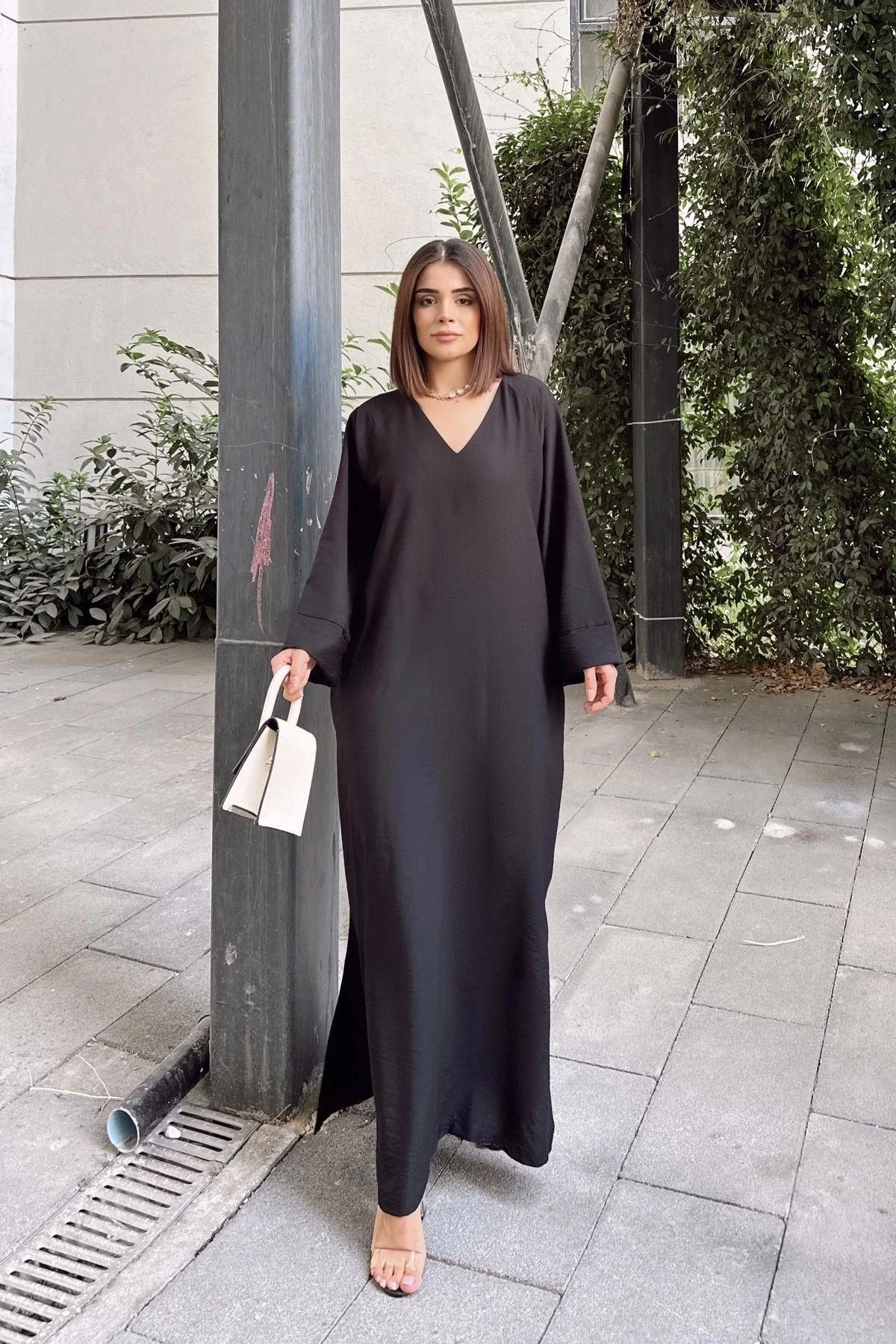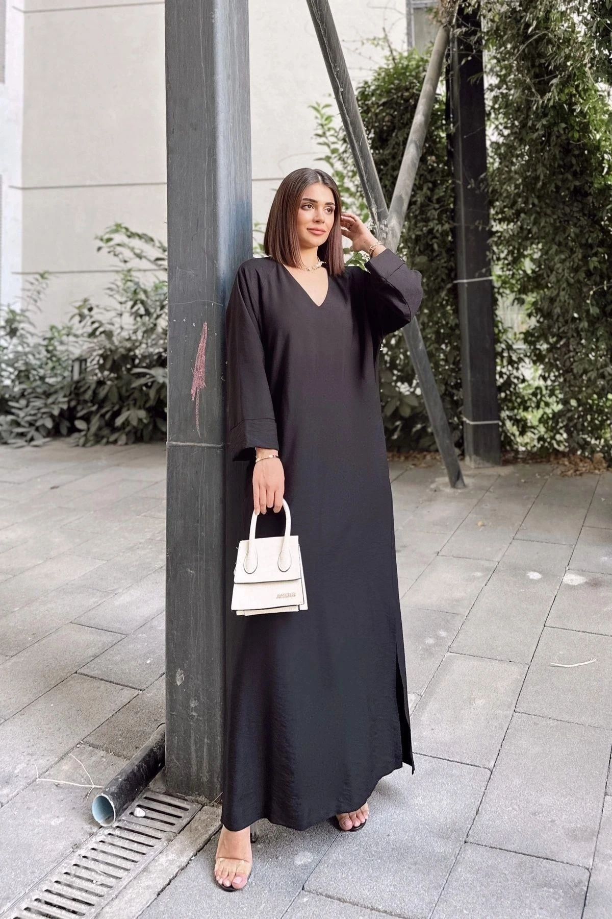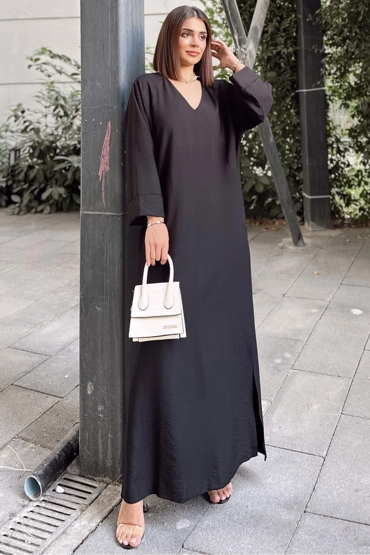 Kadın Siyah V Yaka, Uzun Kol, Duble Manşet, Yırtmaçlı, Basic A Kesim, Oversize Uzun Elbise