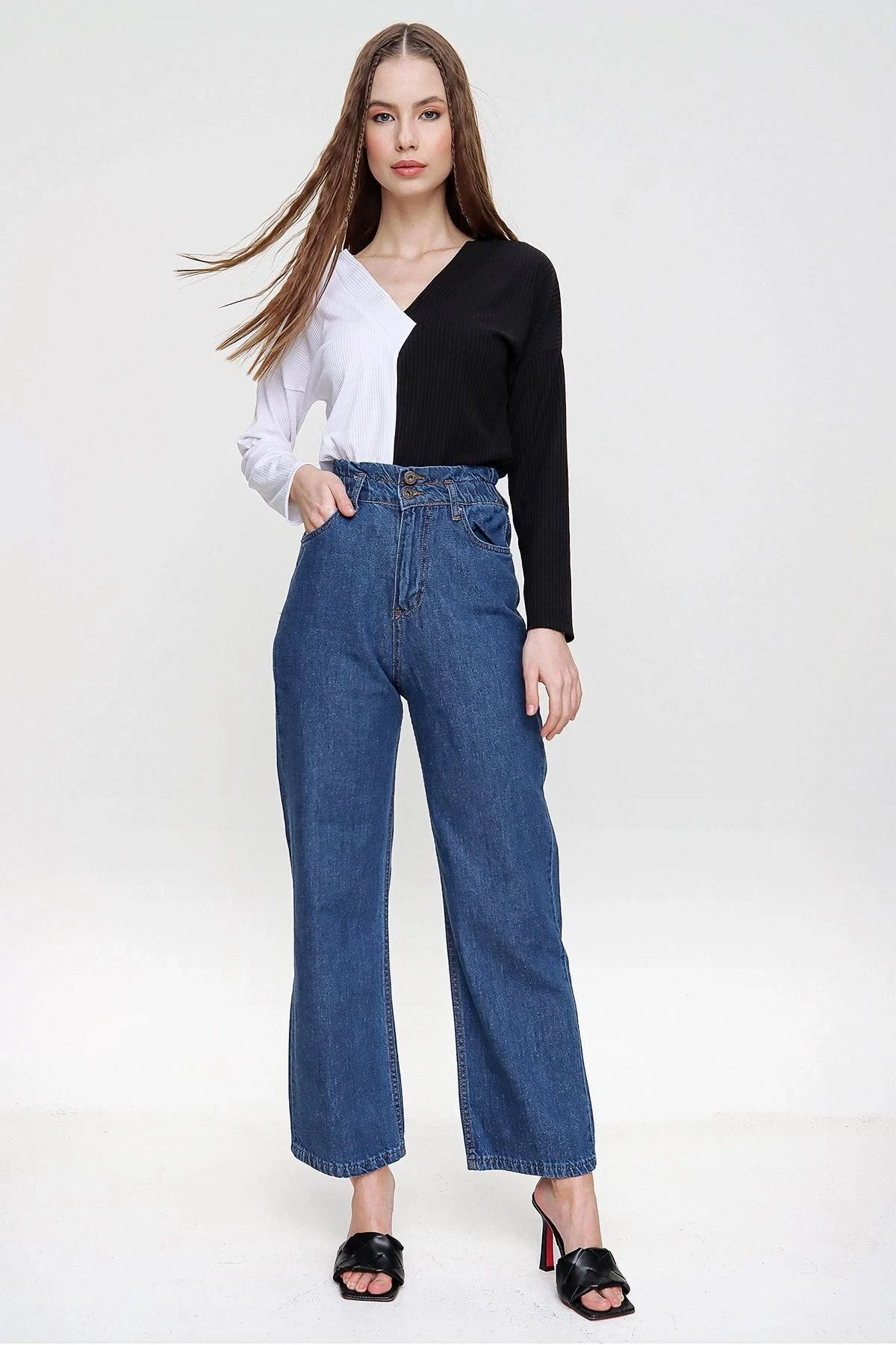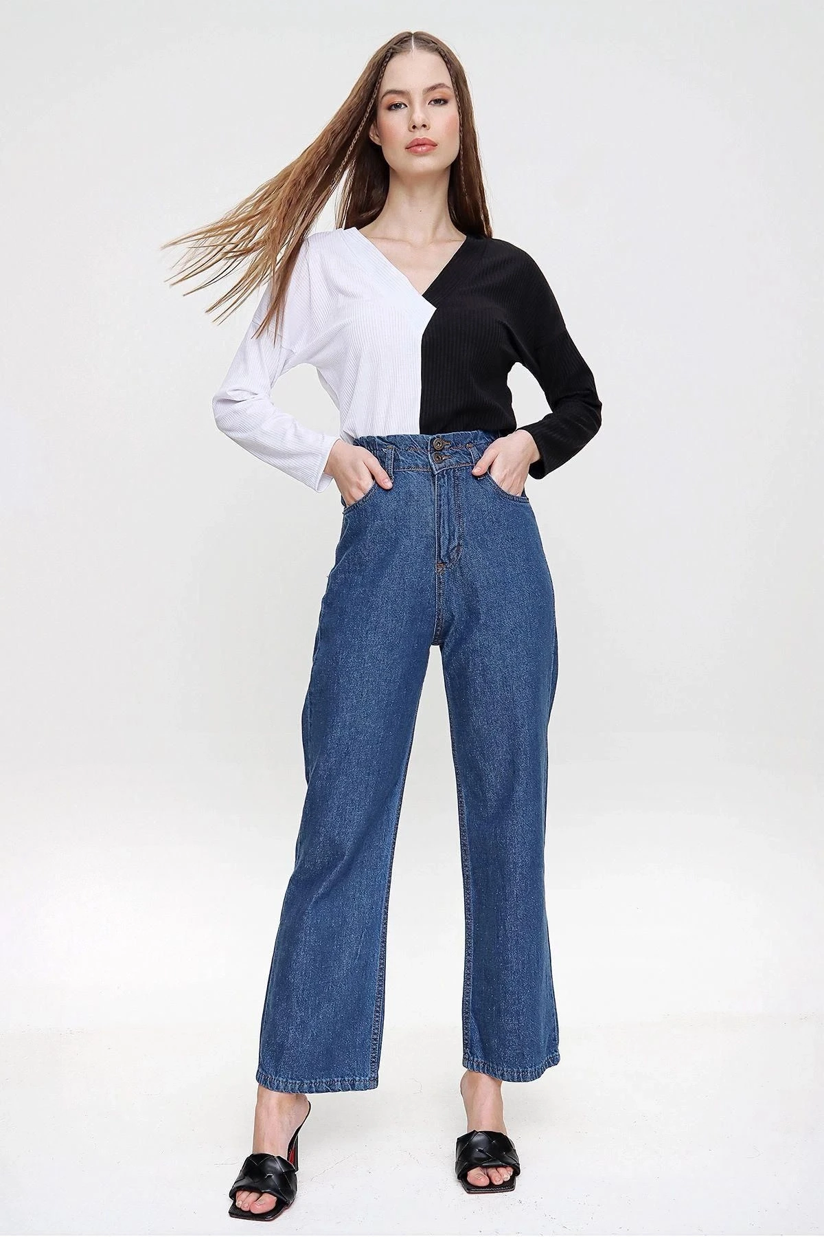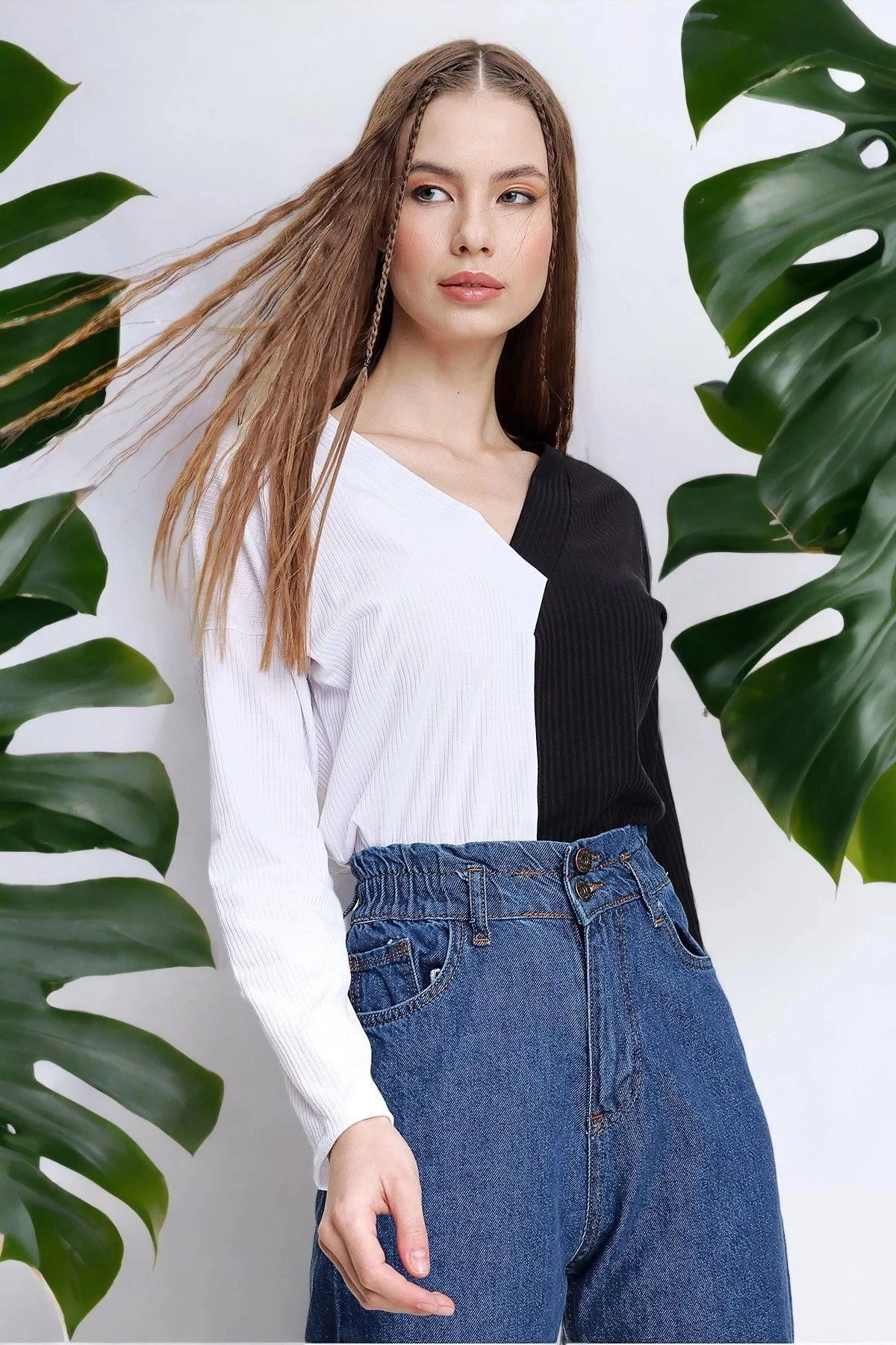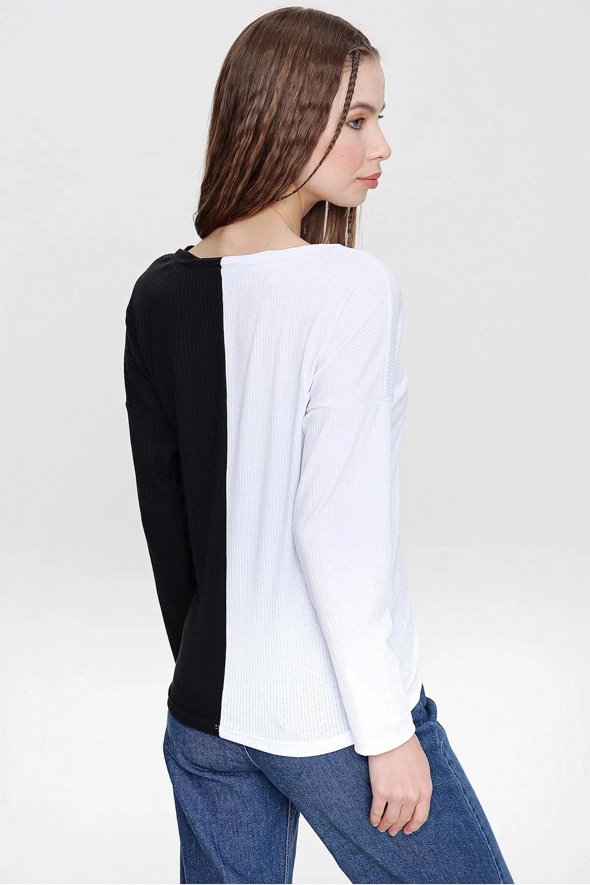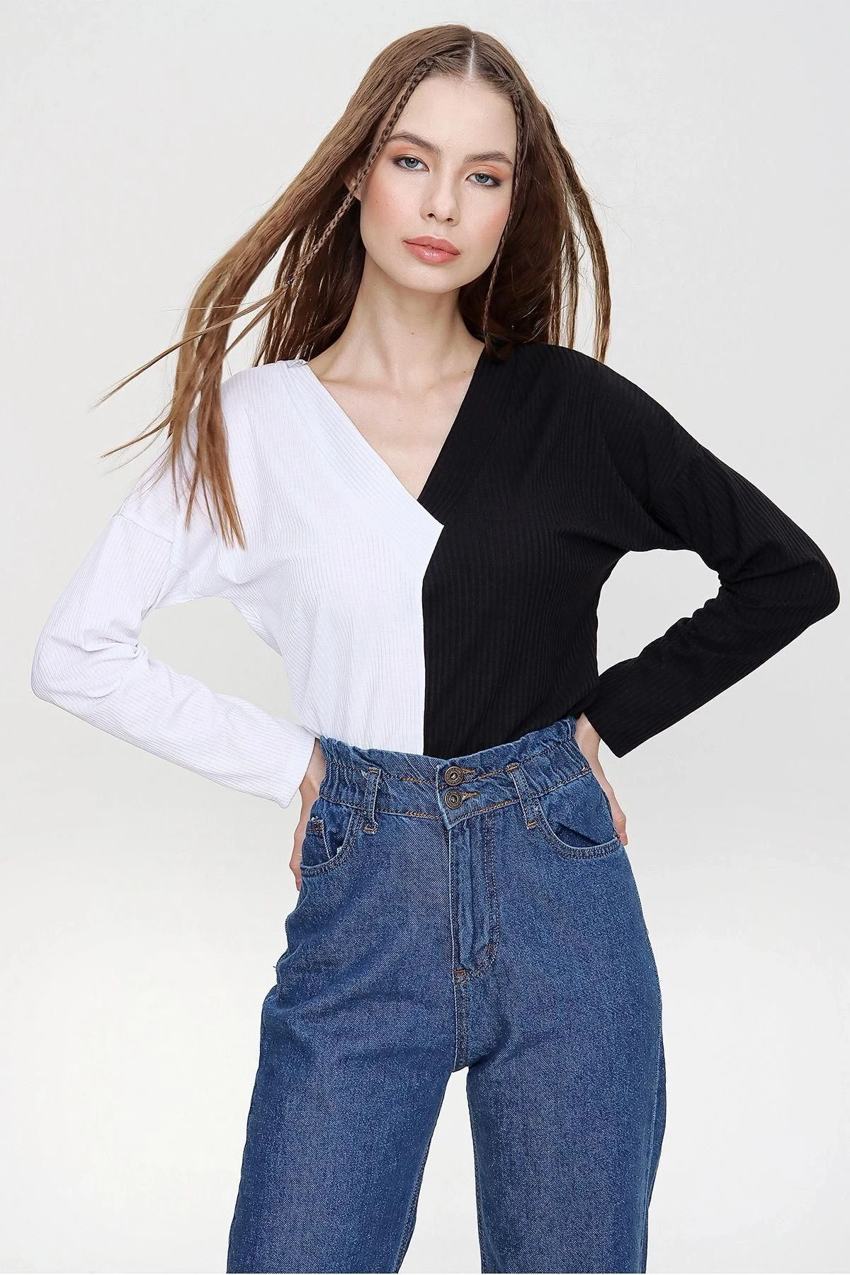 Bu şık Siyah Renk V Yaka Uzun Kol İki Renkli Bluz, her kadının gardırobunda olması gereken bir parça! Regular kesimi ve standart boyuyla her bedene mükemmel uyum sağlar.; Bluzun kumaşı %95 pamuk ve %5 likra karışımıdır, bu da hem rahatlık hem de esneklik sunar.; Pamuk, nefes alabilen ve cildinizin rahatça hava almasını sağlayan bir malzemedir.; Lycra ise bluzun esnekliğini artırır, böylece hareket özgürlüğünüzü kısıtlamadan gün boyu konfor sağlar.; Siyah rengin klasik ve zarif görünümü, her mevsim ve her fırsatta giymenizi sağlar.; V yaka tasarımı, şıklık katarken boyun bölgesini zarif bir şekilde vurgular.; Uzun kollu yapısı, soğuk günlerde sizi sıcak tutarken, serin havalarda da stilinizi tamamlar.; Bu bluzun özel bir özelliği, iki renkli tasarımıdır.; Ön kısmı ve kolları farklı bir renkte olan bu bluz, modern ve trend bir görünüm sunar.; Bu detay, bluzu sıradanlıktan uzaklaştırır ve tarzınıza özgün bir dokunuş katar.; Bu Siyah Renk V Yaka Uzun Kol İki Renkli Bluz, her zaman şık ve rahat olmanızı sağlayacak mükemmel bir seçimdir.; Herhangi bir şık etkinlikte, günlük hayatta veya özel bir gece dışarı çıkarken stilinizi tamamlayacak.; Tarzınızı ifade etmek ve kendinizi özel hissetmek için bu bluzu tercih edin!