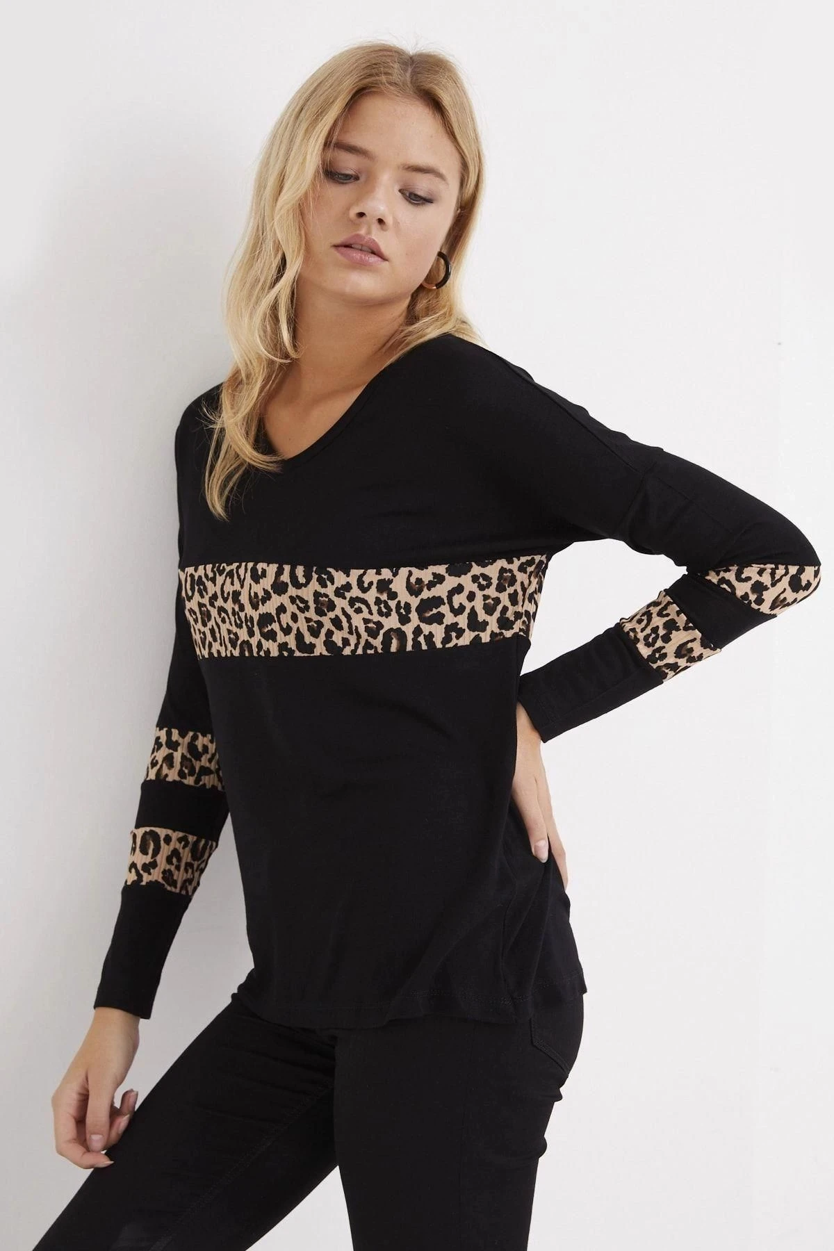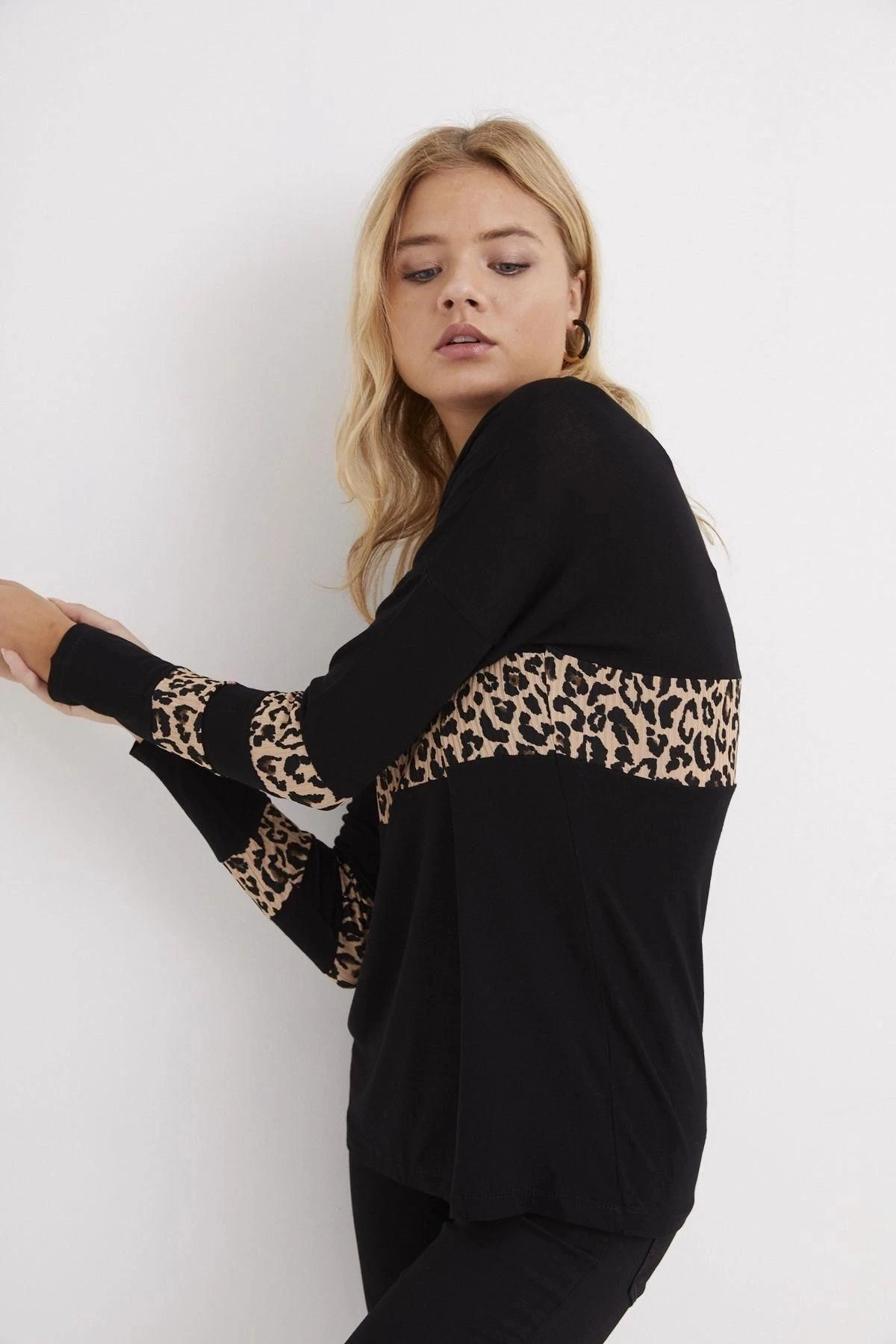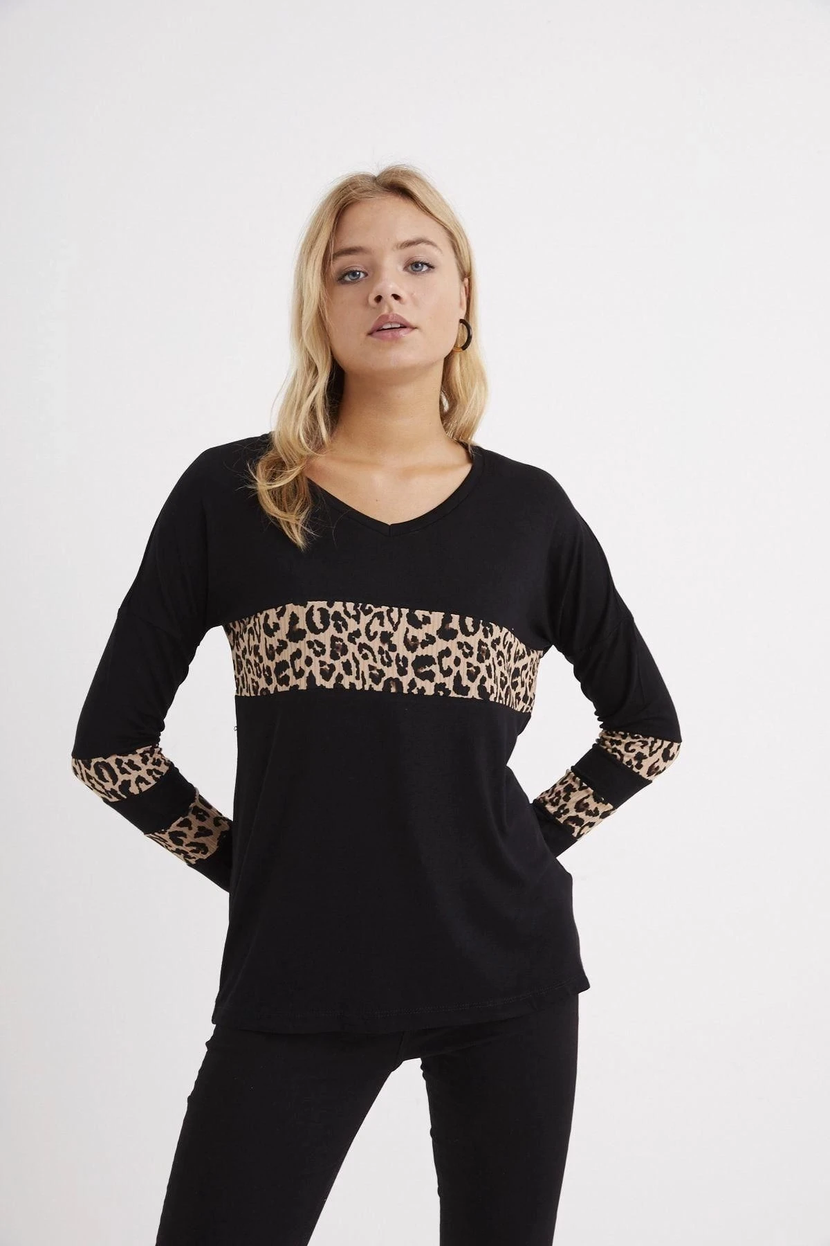 Kadın Siyah V Yaka, Uzun Kol, Leopar Detaylı, Geçişli, Regular Kesim, Standart Boy Bluz.
