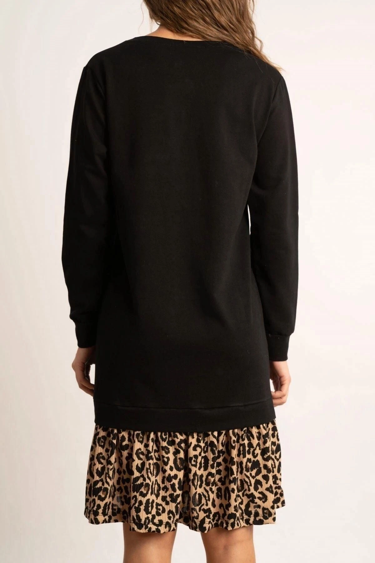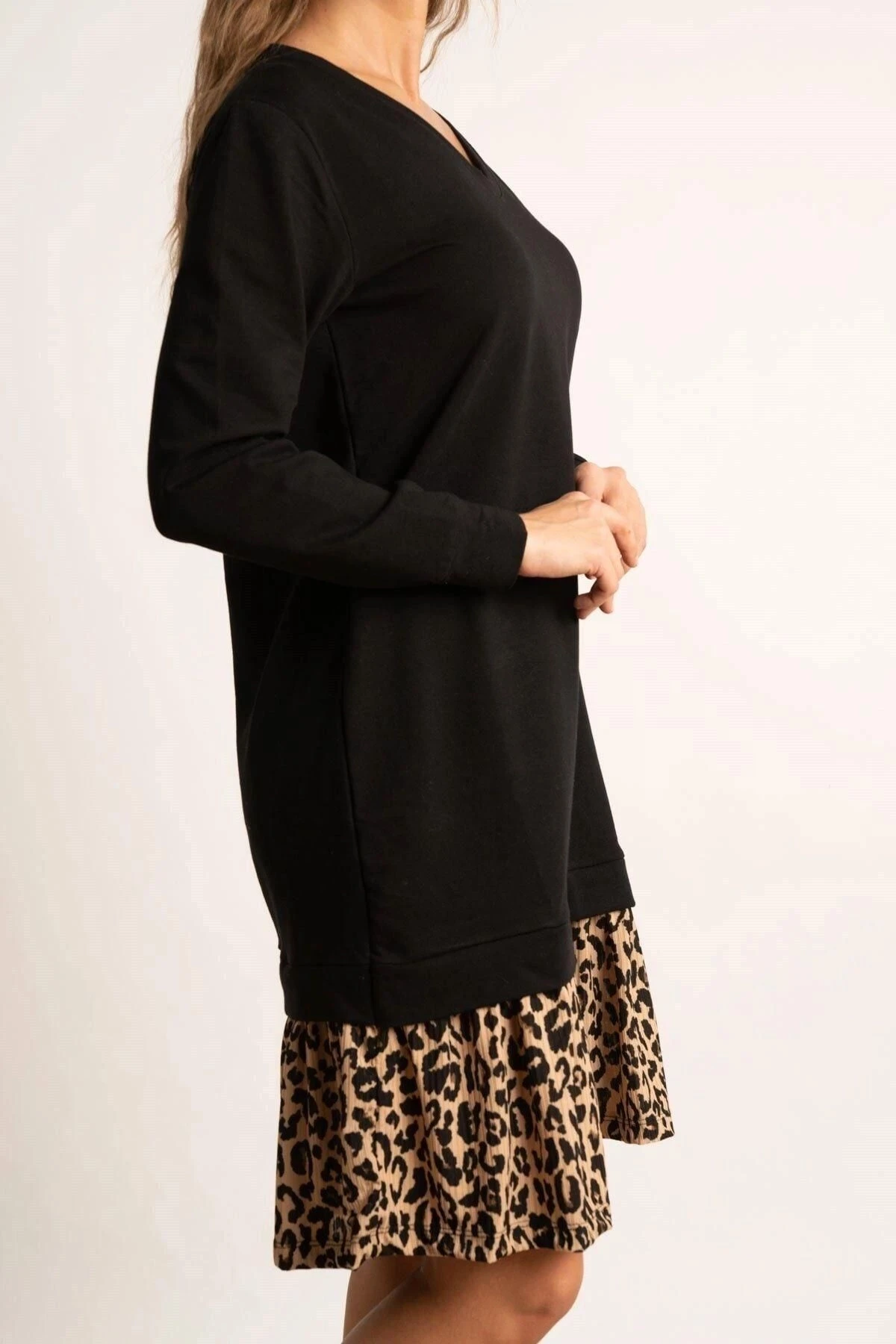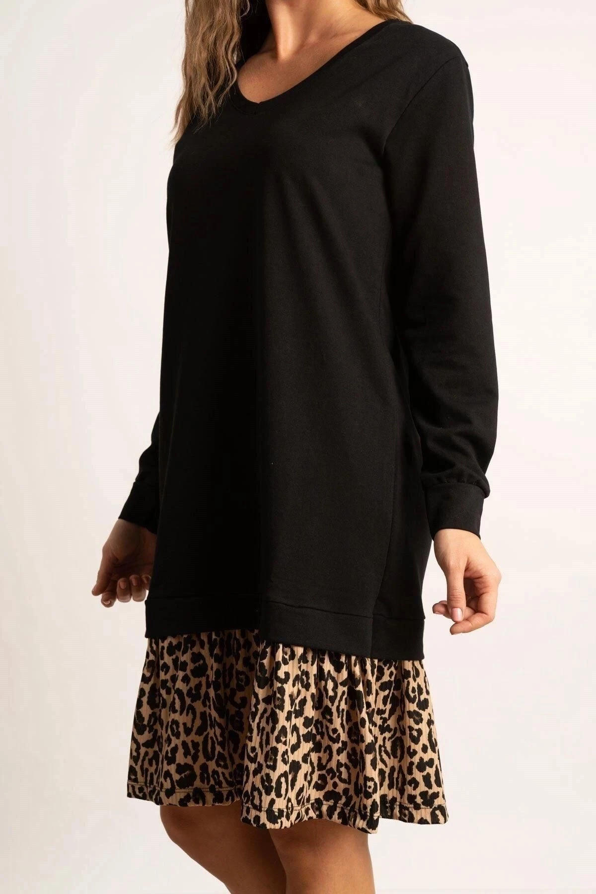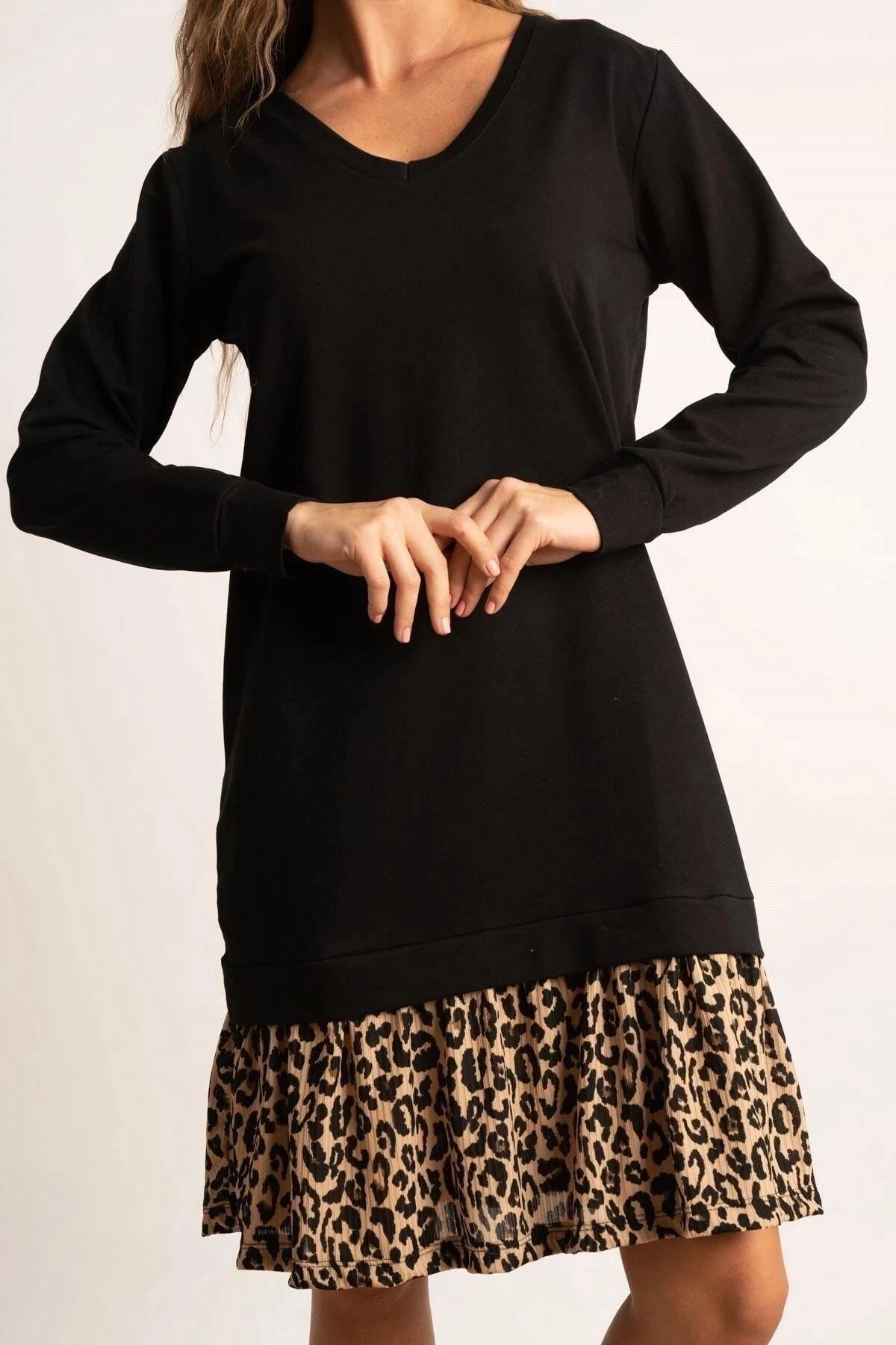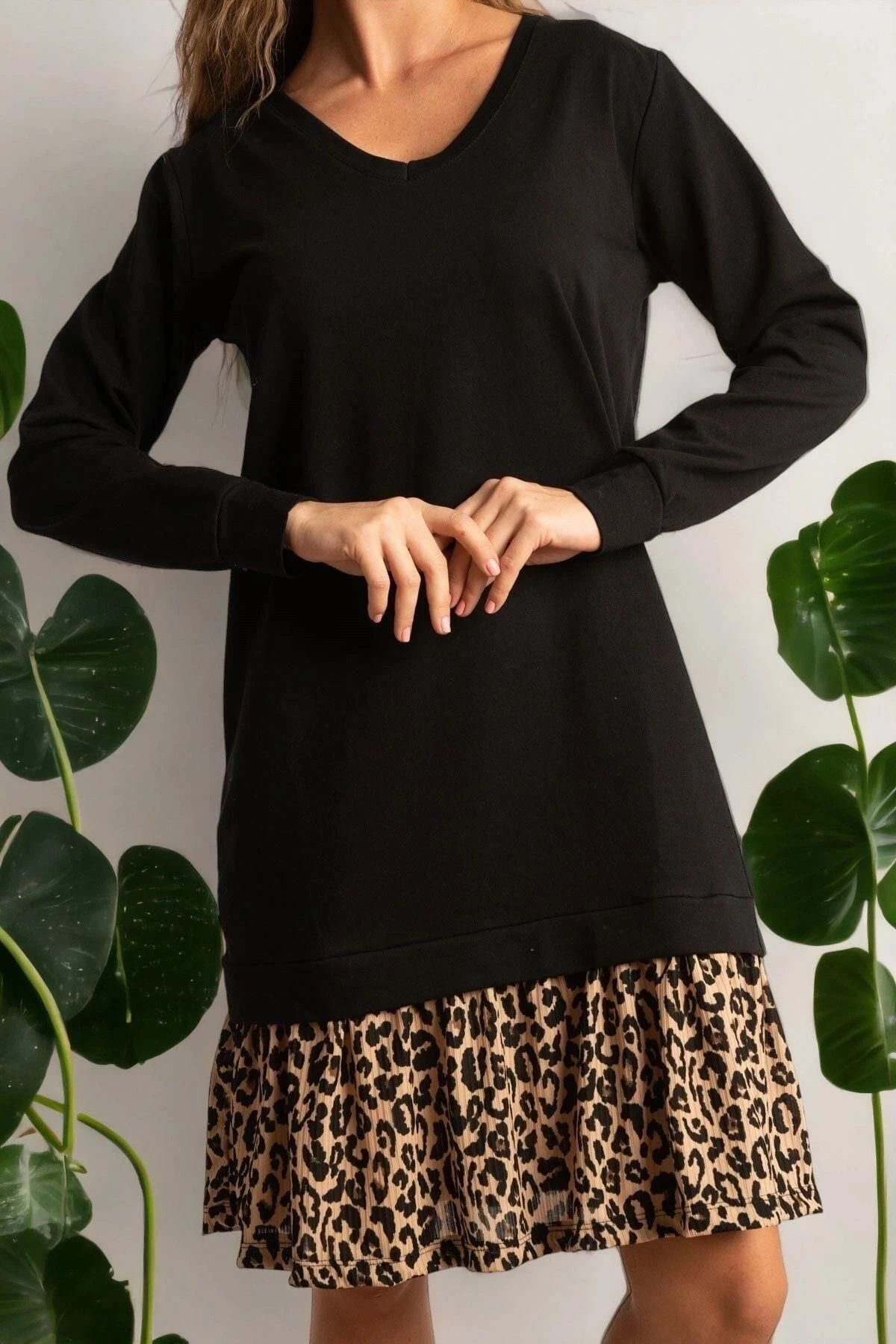 Kadın Siyah V Yaka Uzun Kol Pili Detaylı Leopar Desenli Kaliteli Kumaş Oversize Kesim Elbise