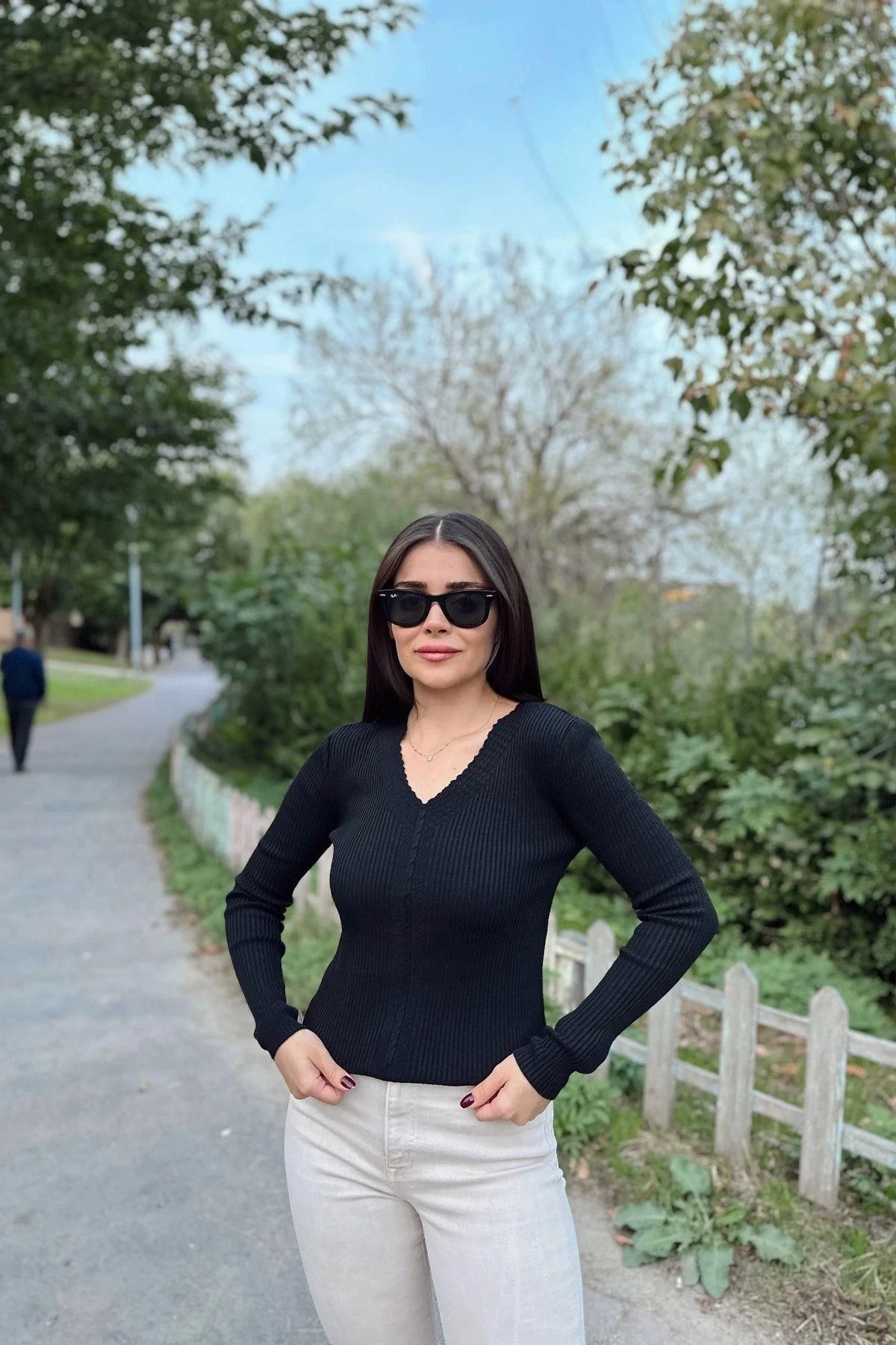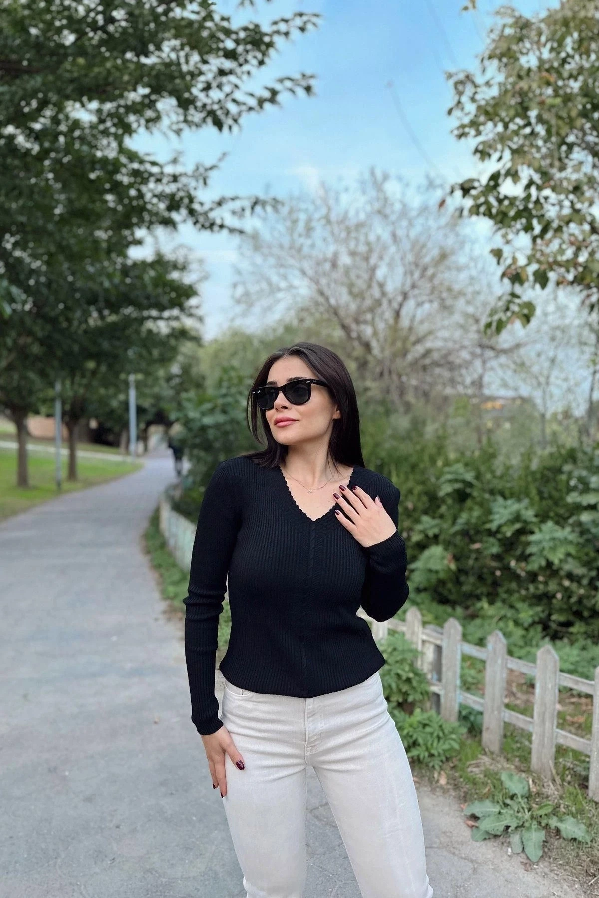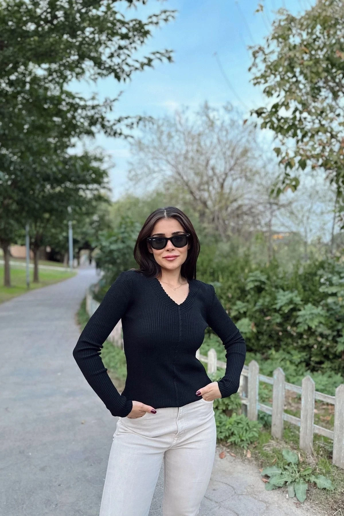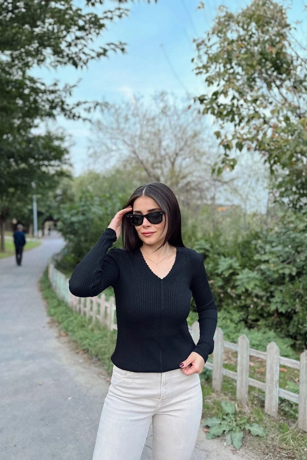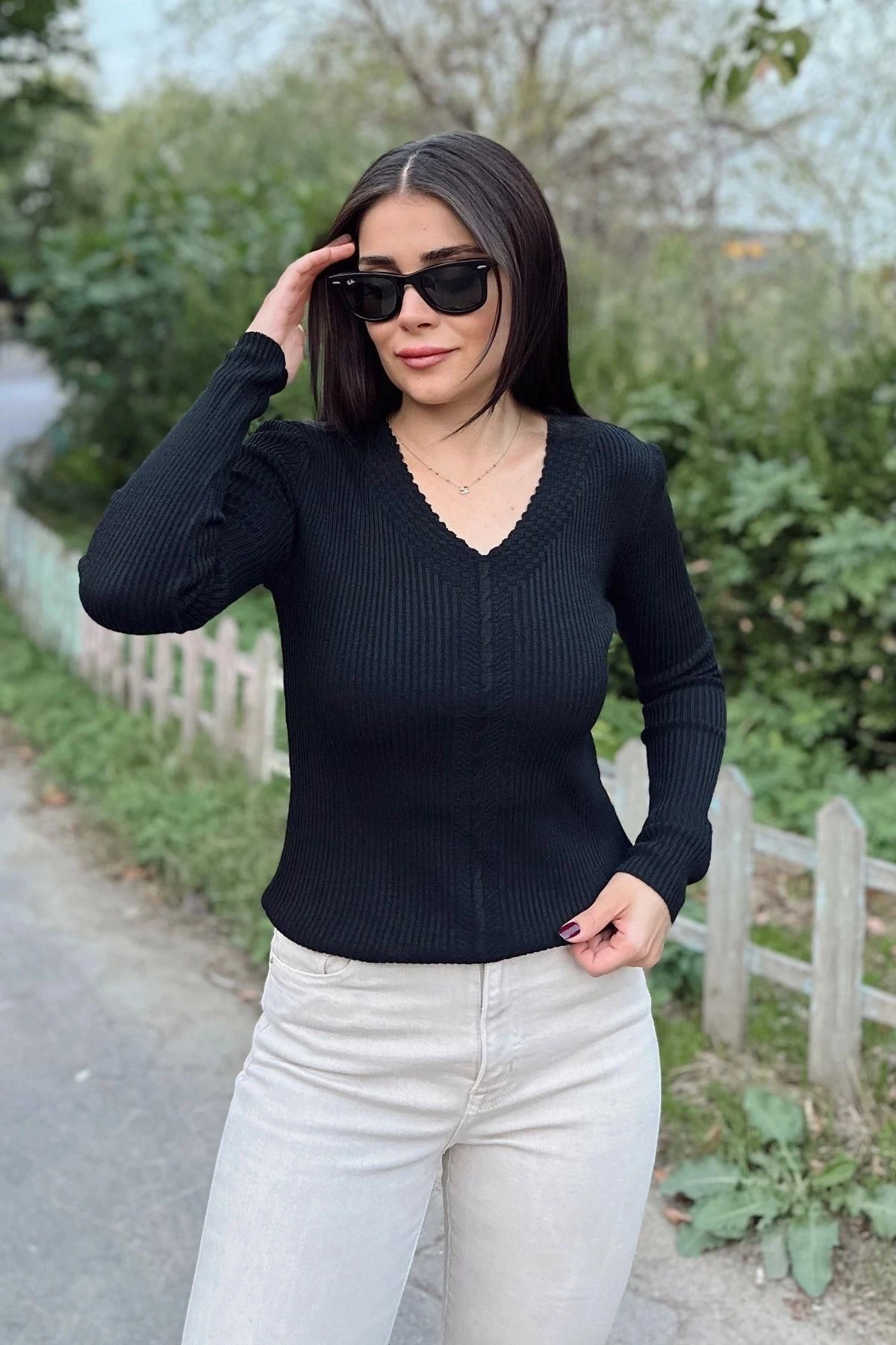 Kadın Siyah V Yaka, Uzun Kol, Vucüda Oturan Kalıp, Esnek Kumaş, Örgü Desen Triko Bluz