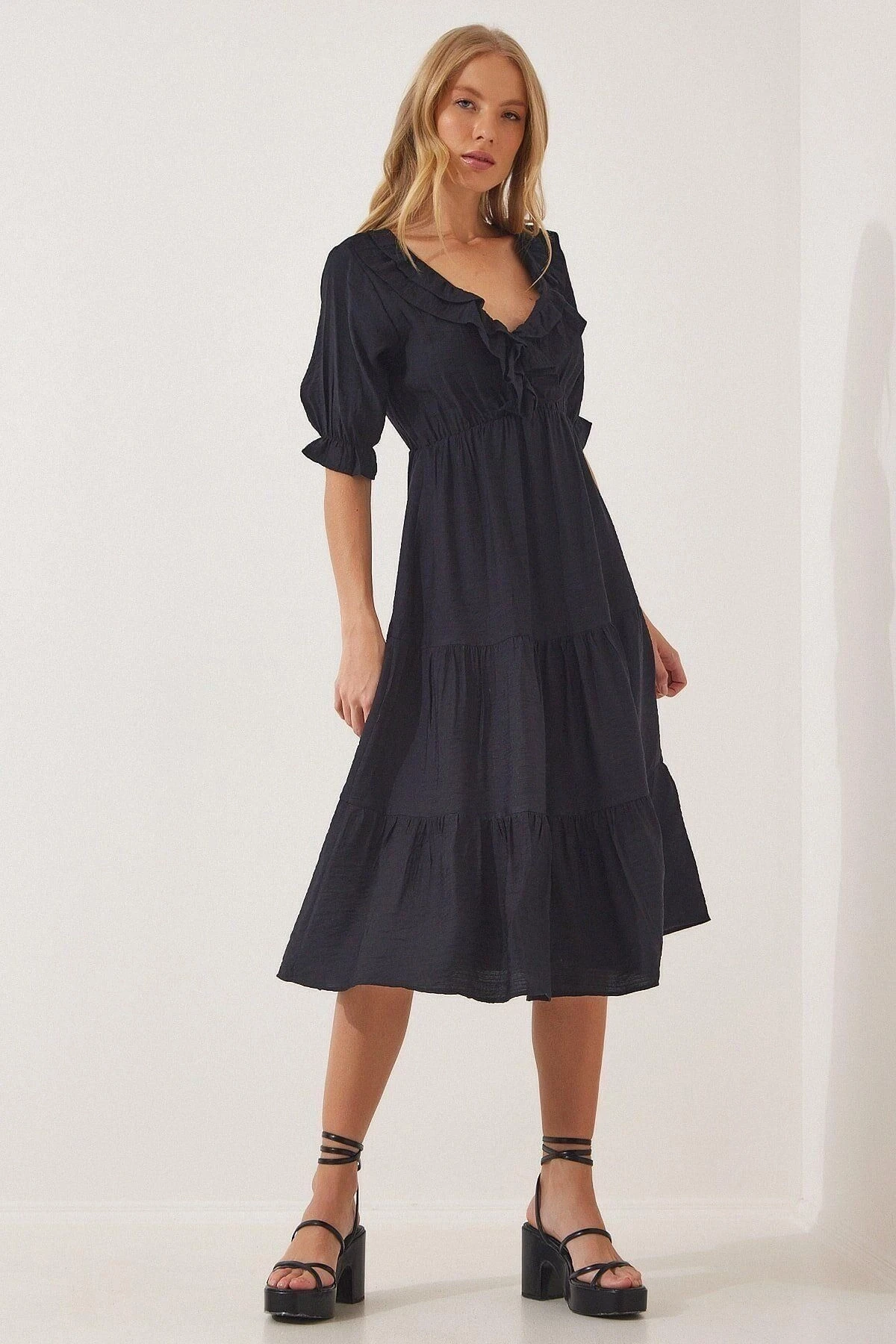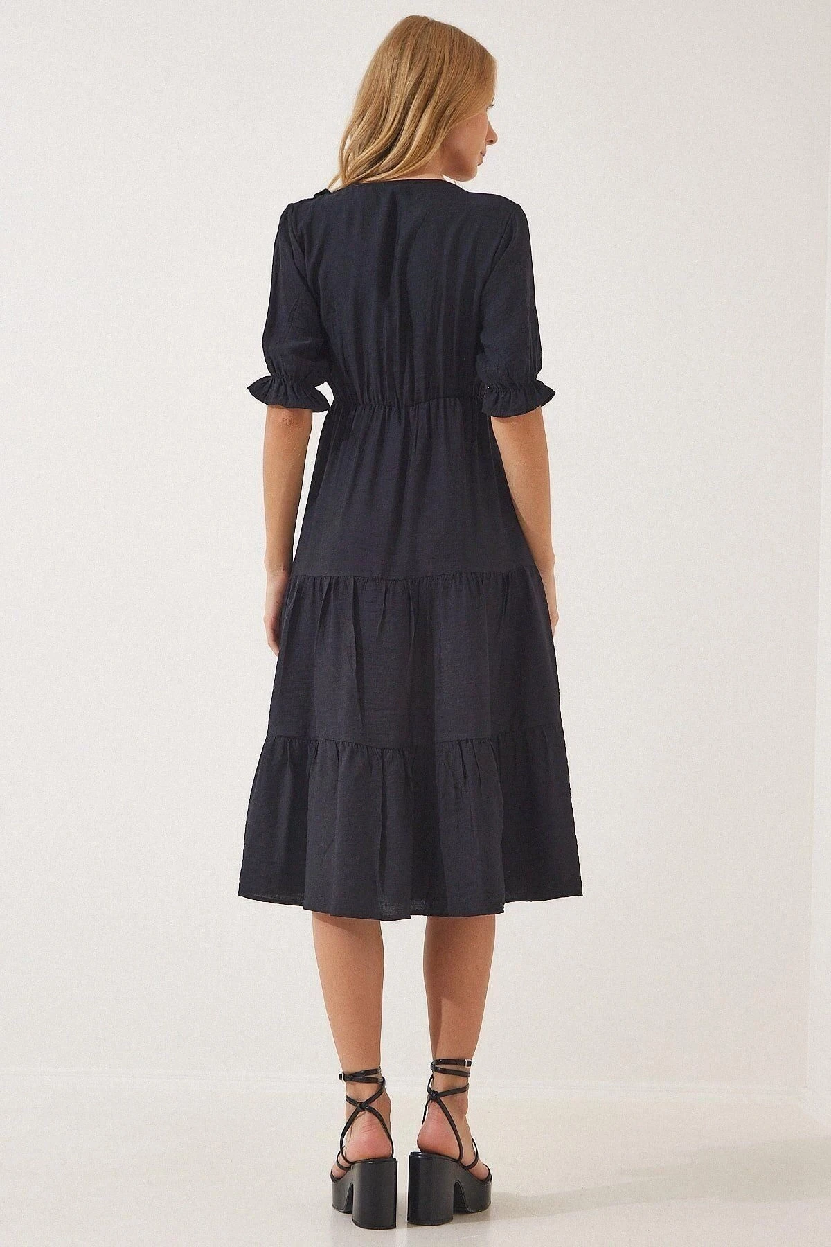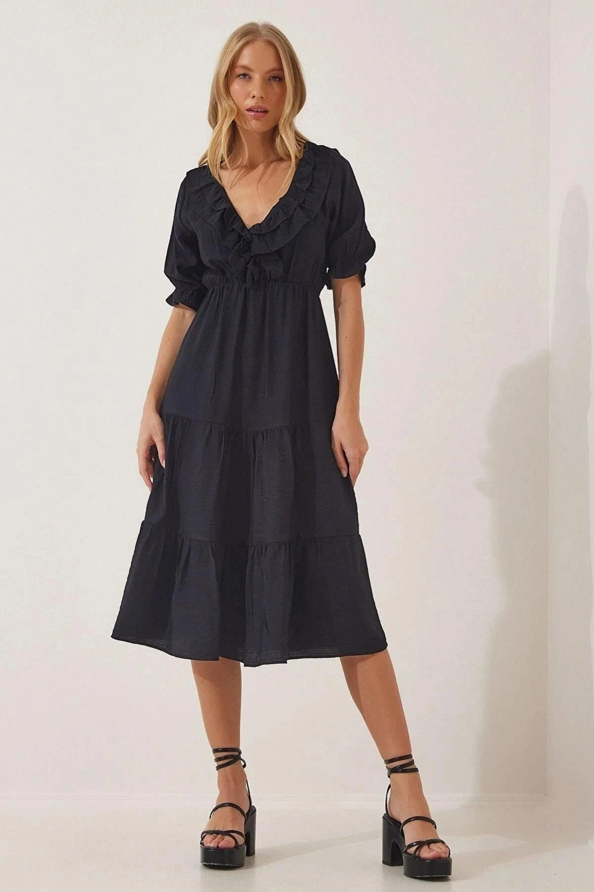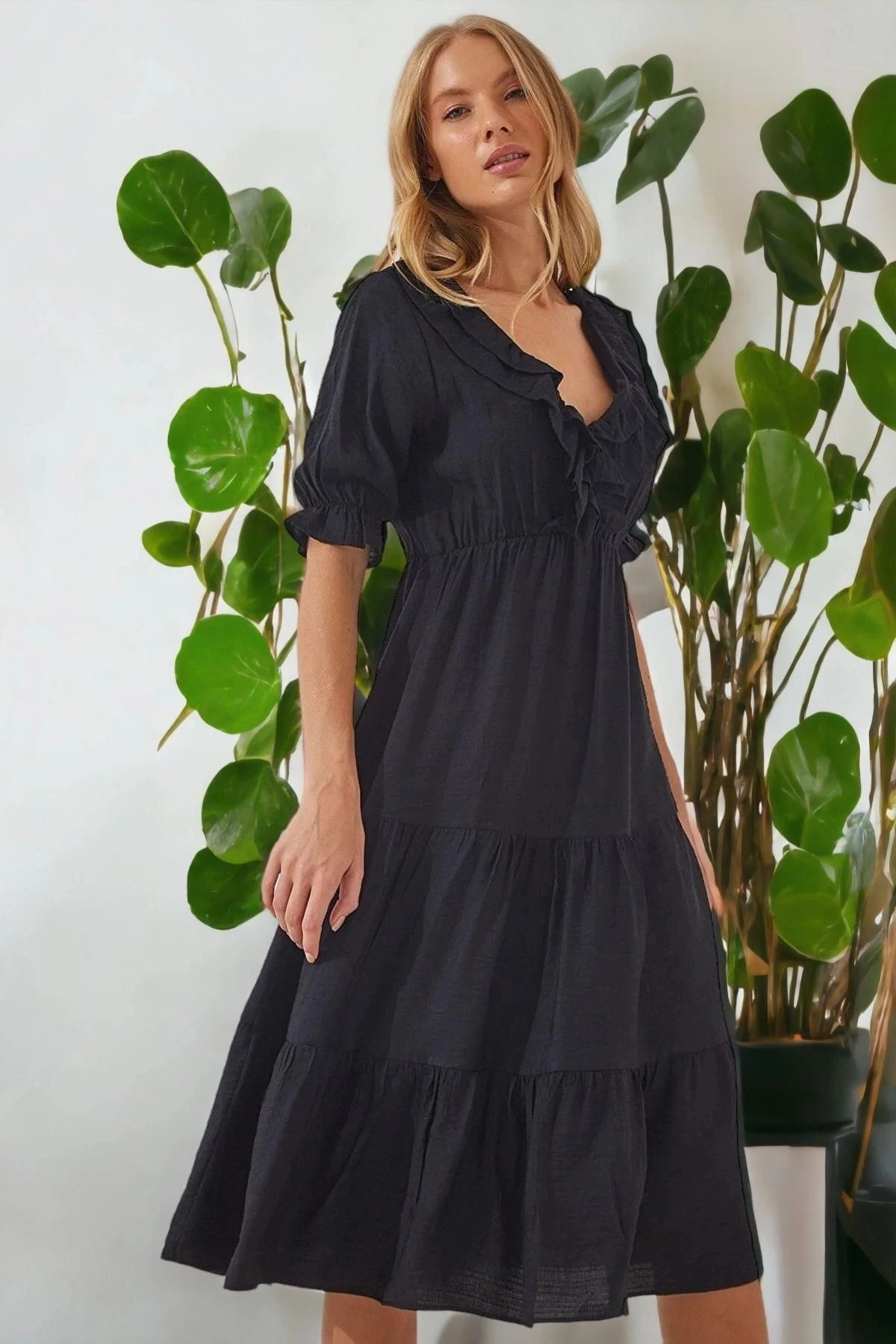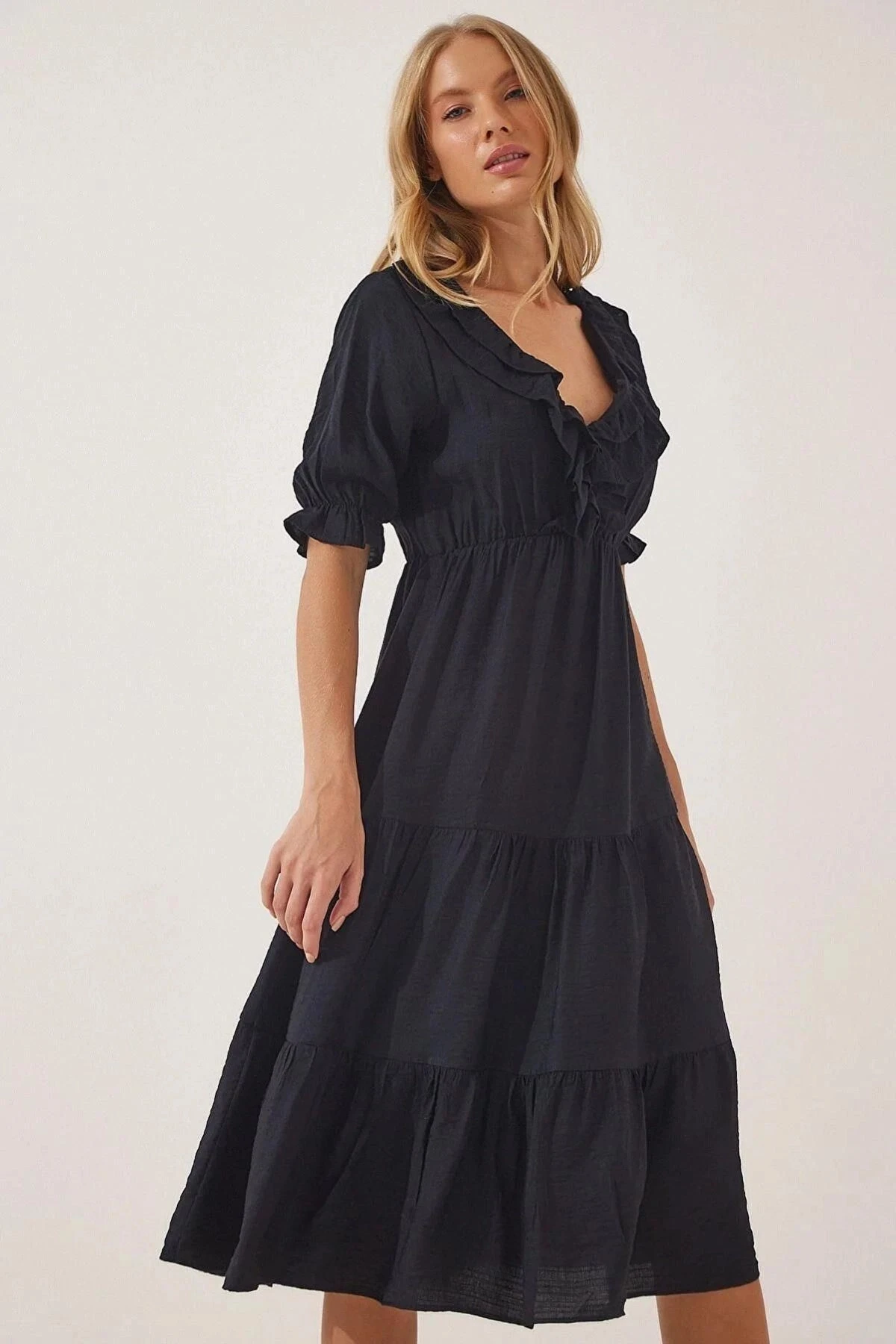 Kadın Siyah V Yaka Yarım Kol Fırfırlı Kolları Lastikli Etek Kat Detaylı A Kesim Elbise