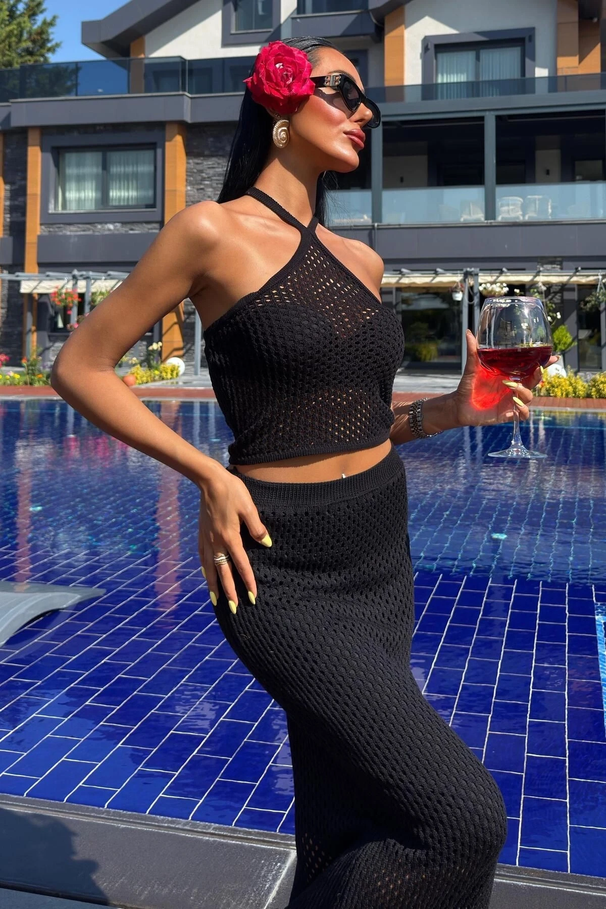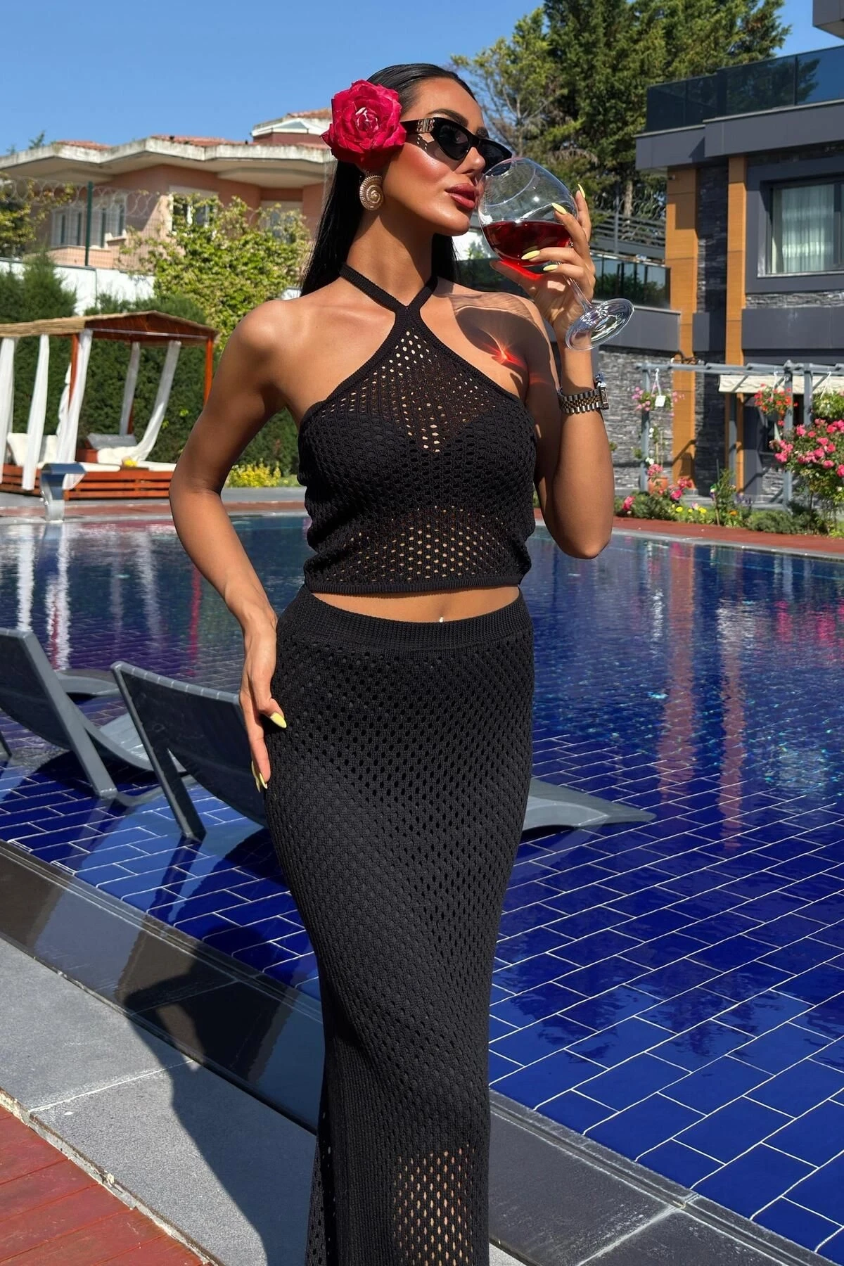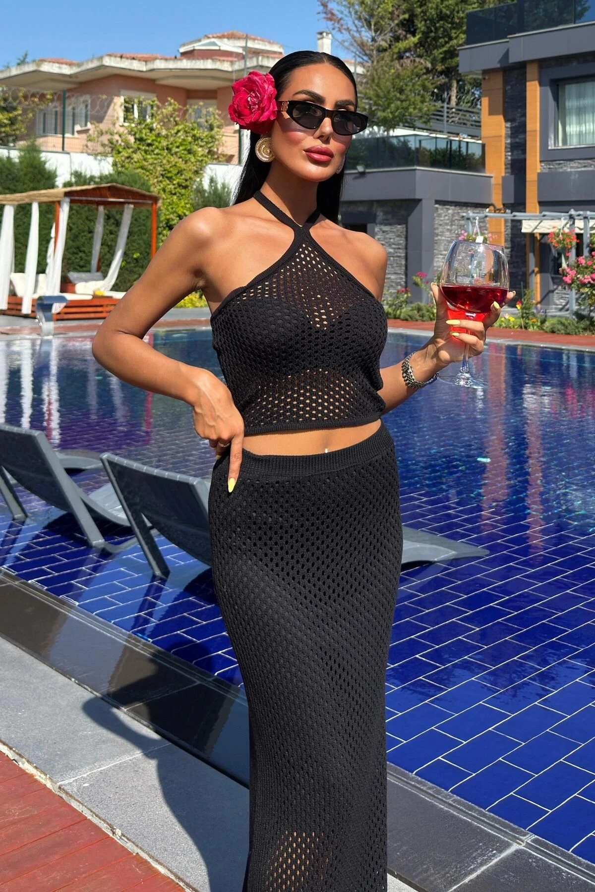 Kadın Siyah Viskon Halter Yaka Kolsuz Takım
