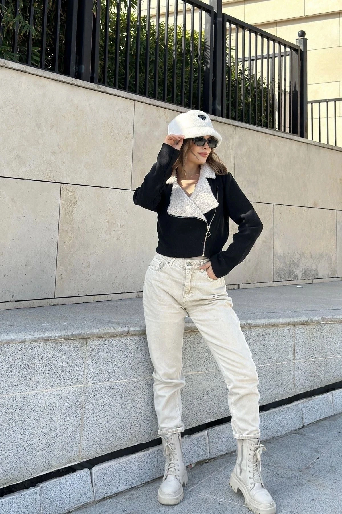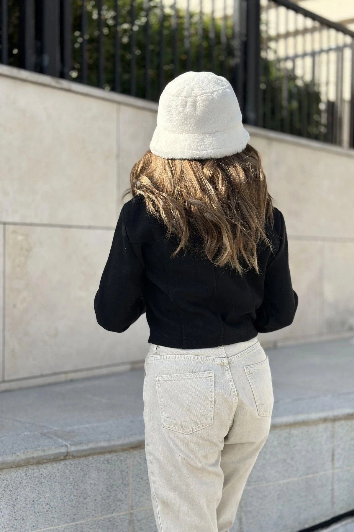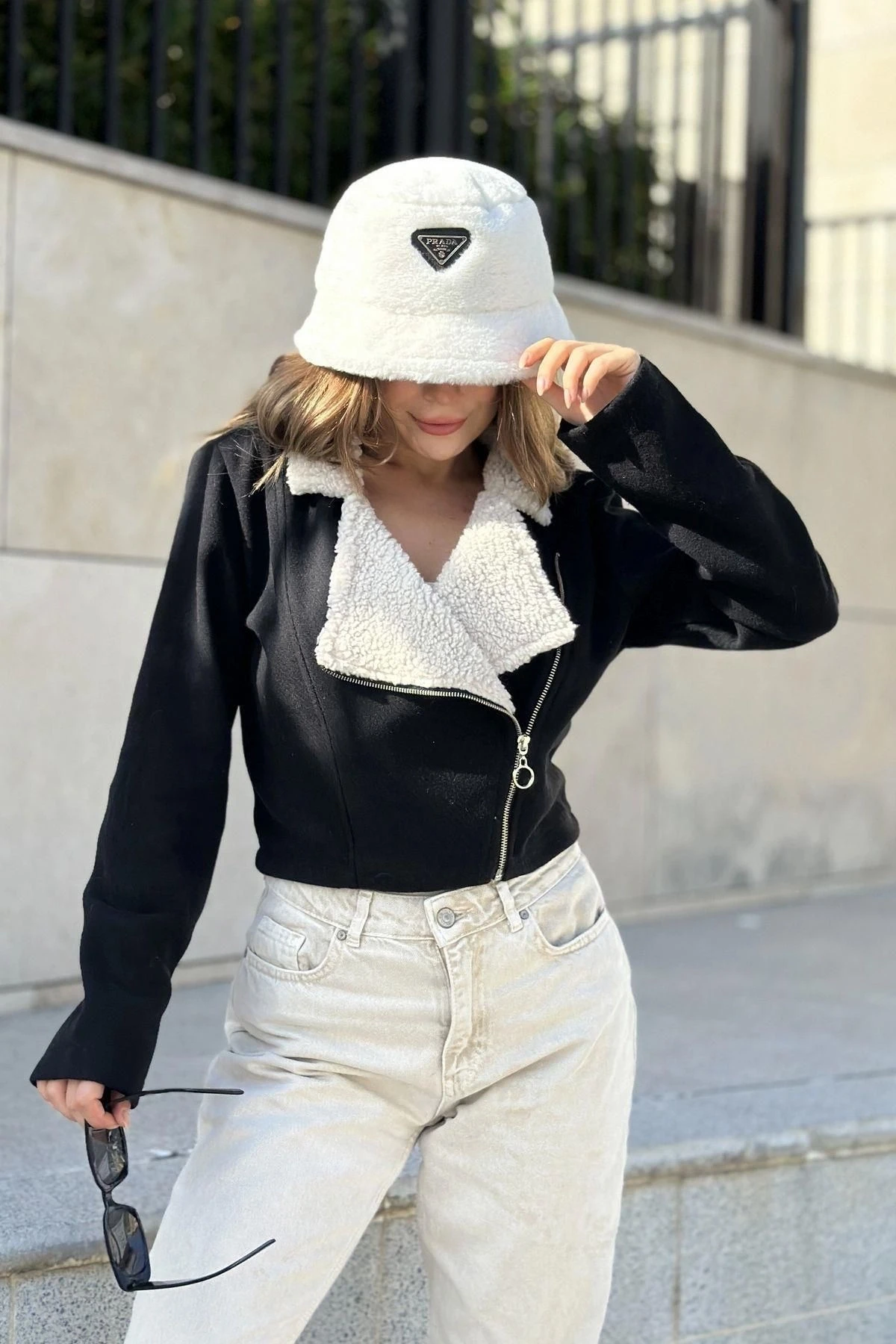 Kadın Siyah Yakası Peluş Detay, Fermuarlı, Crop Fit Kesim, Fitilli Kaşe Kumaş, Kısa Biker Ceket