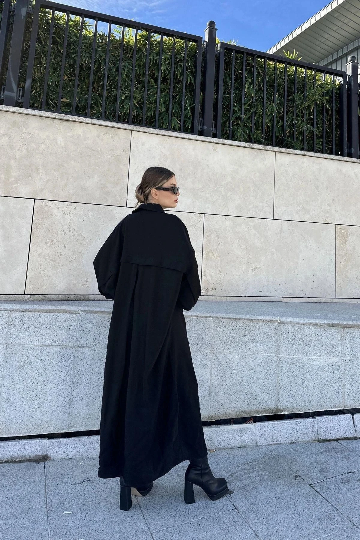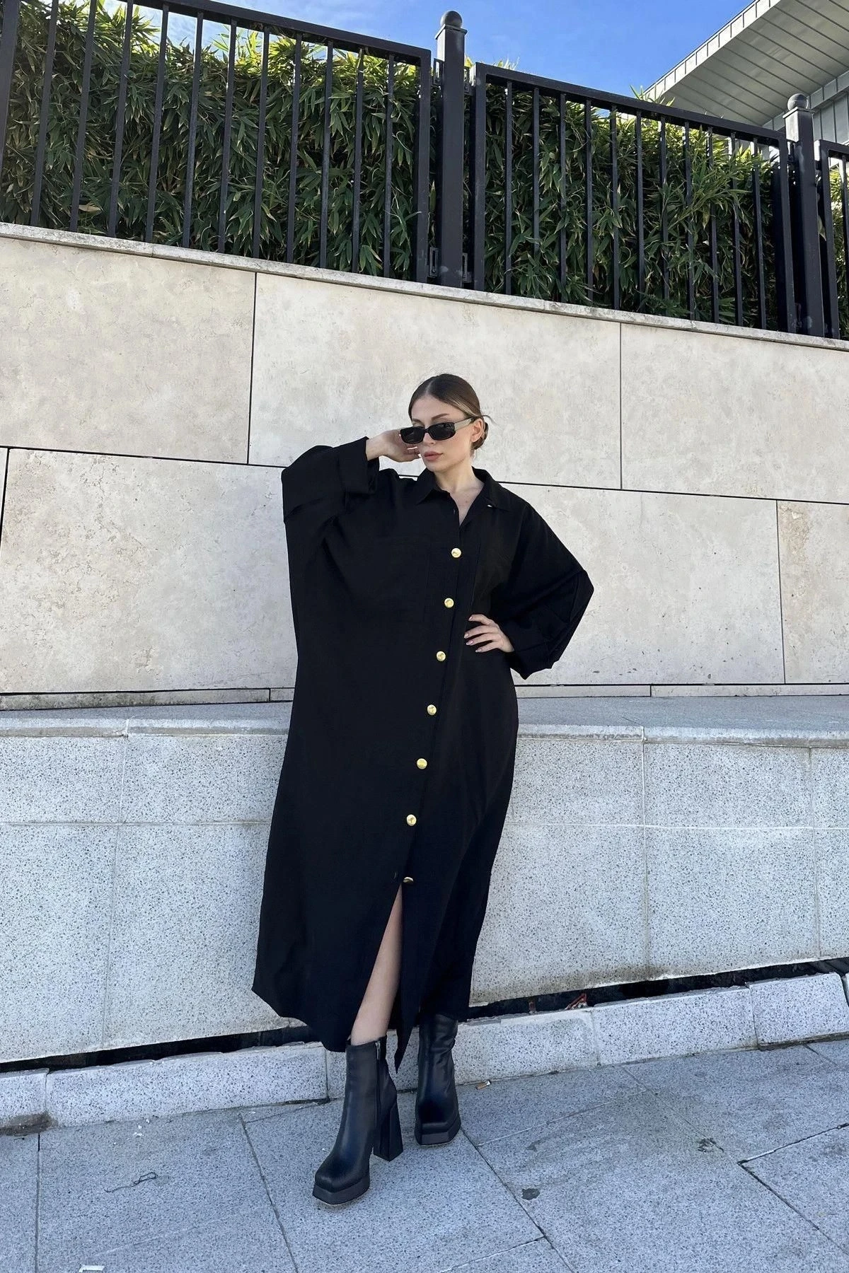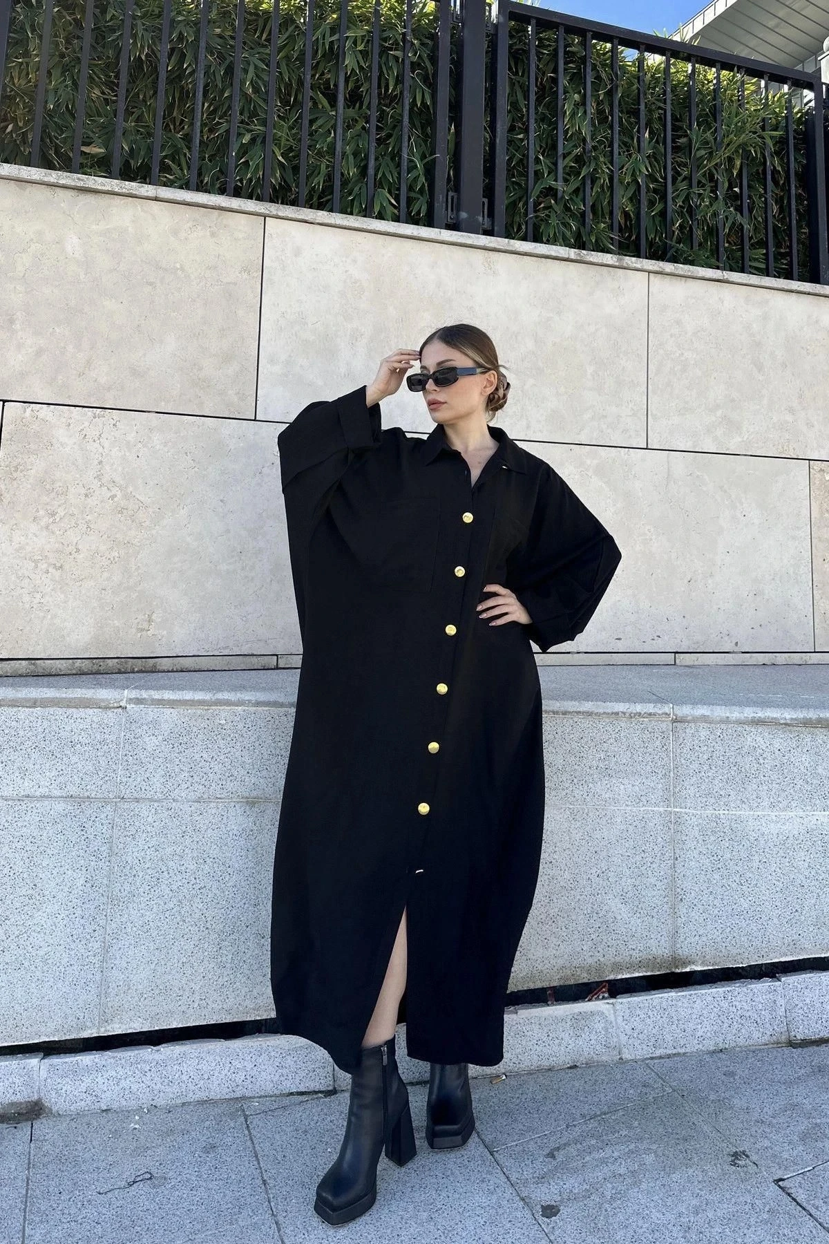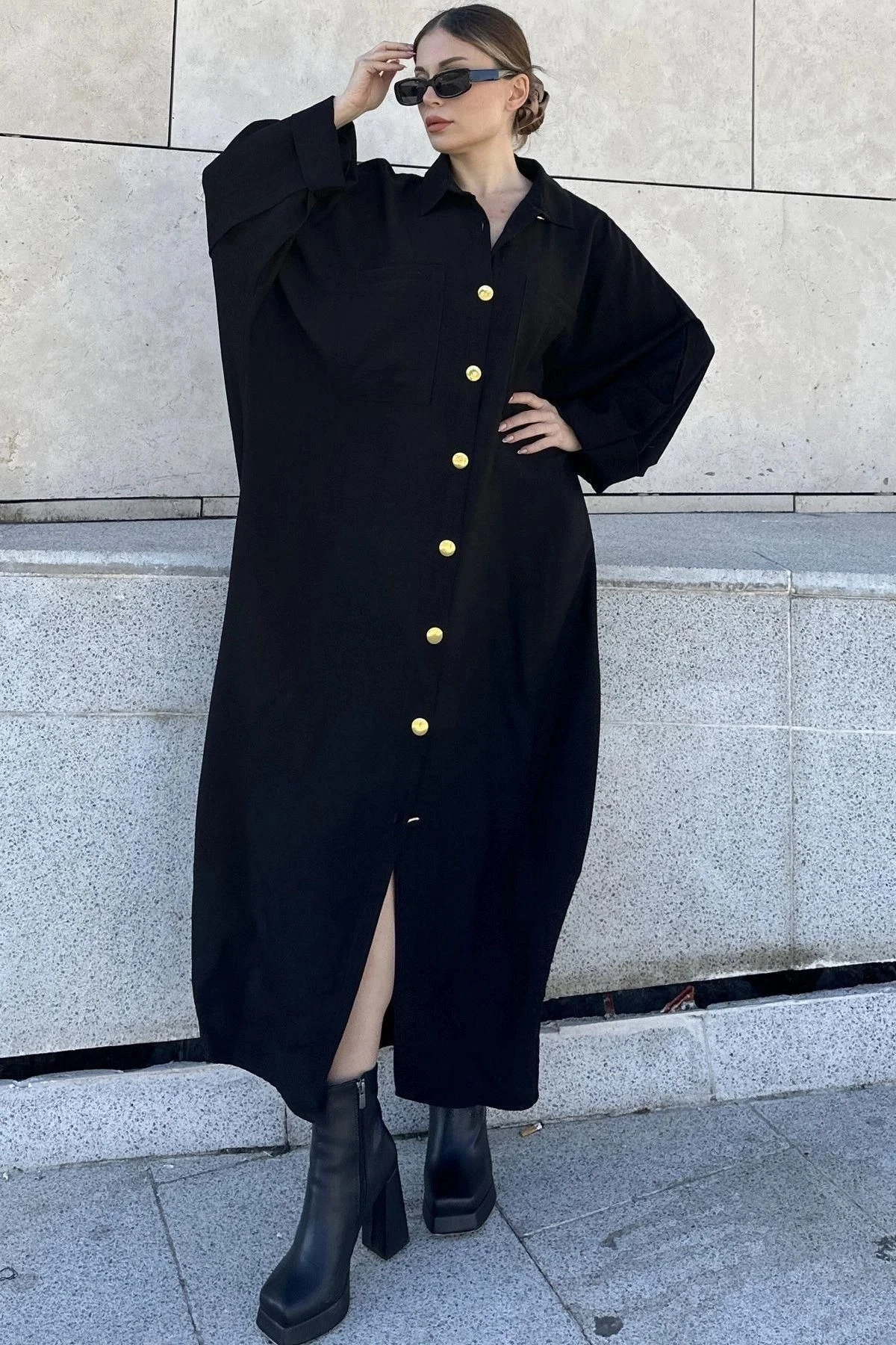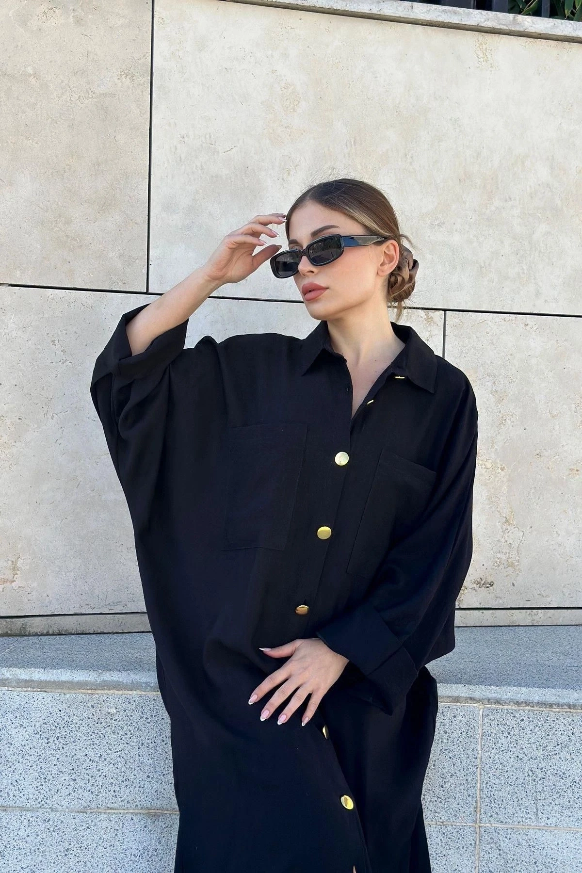 Kadın Siyah Yarasa Kol, Arkası Pliseli, Çift Cepli, Uzun Oversize Salaş Gömlek Elbise