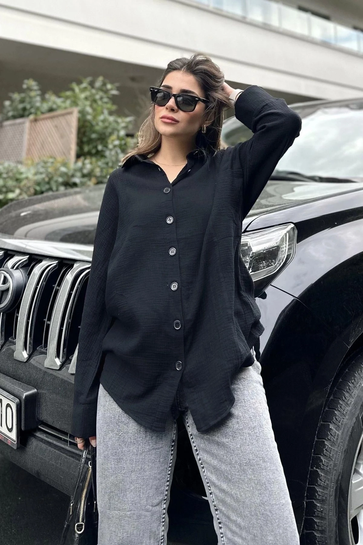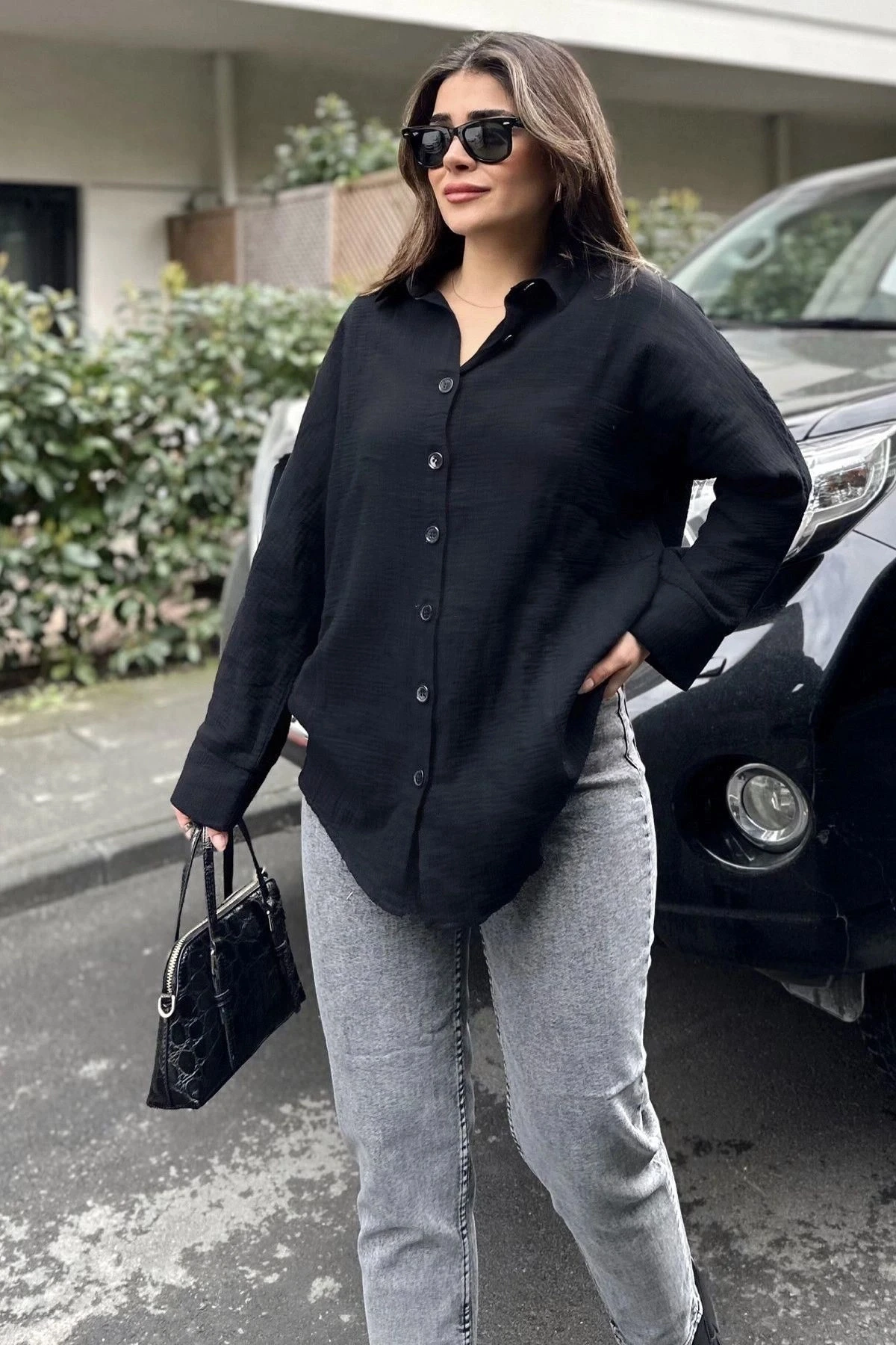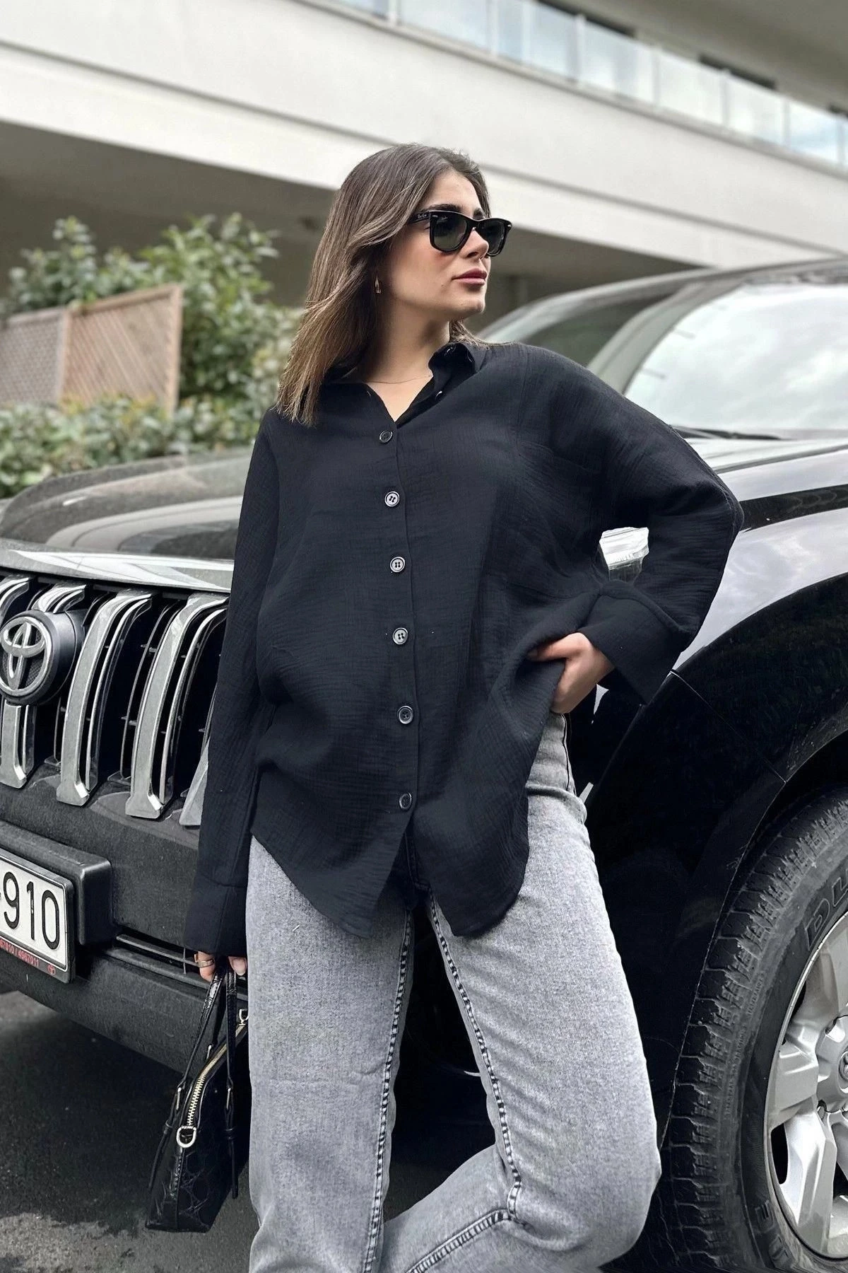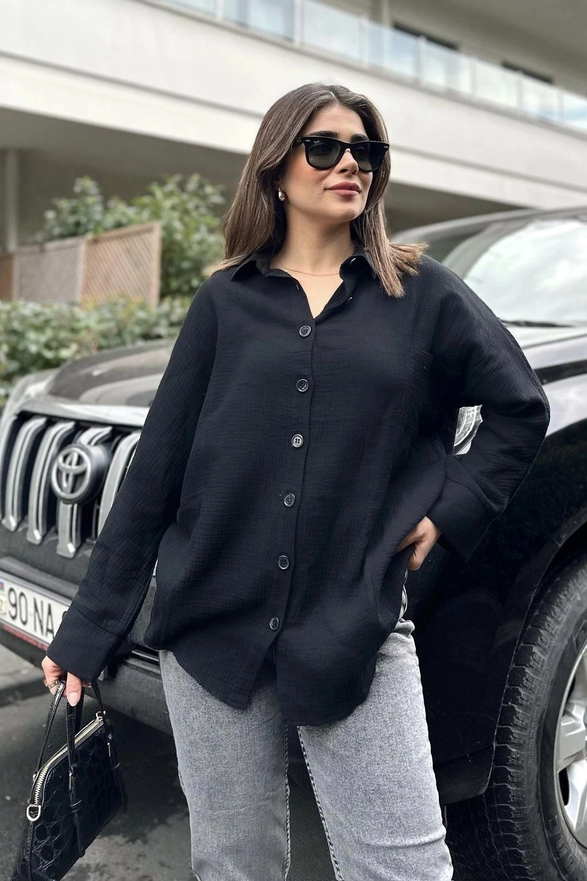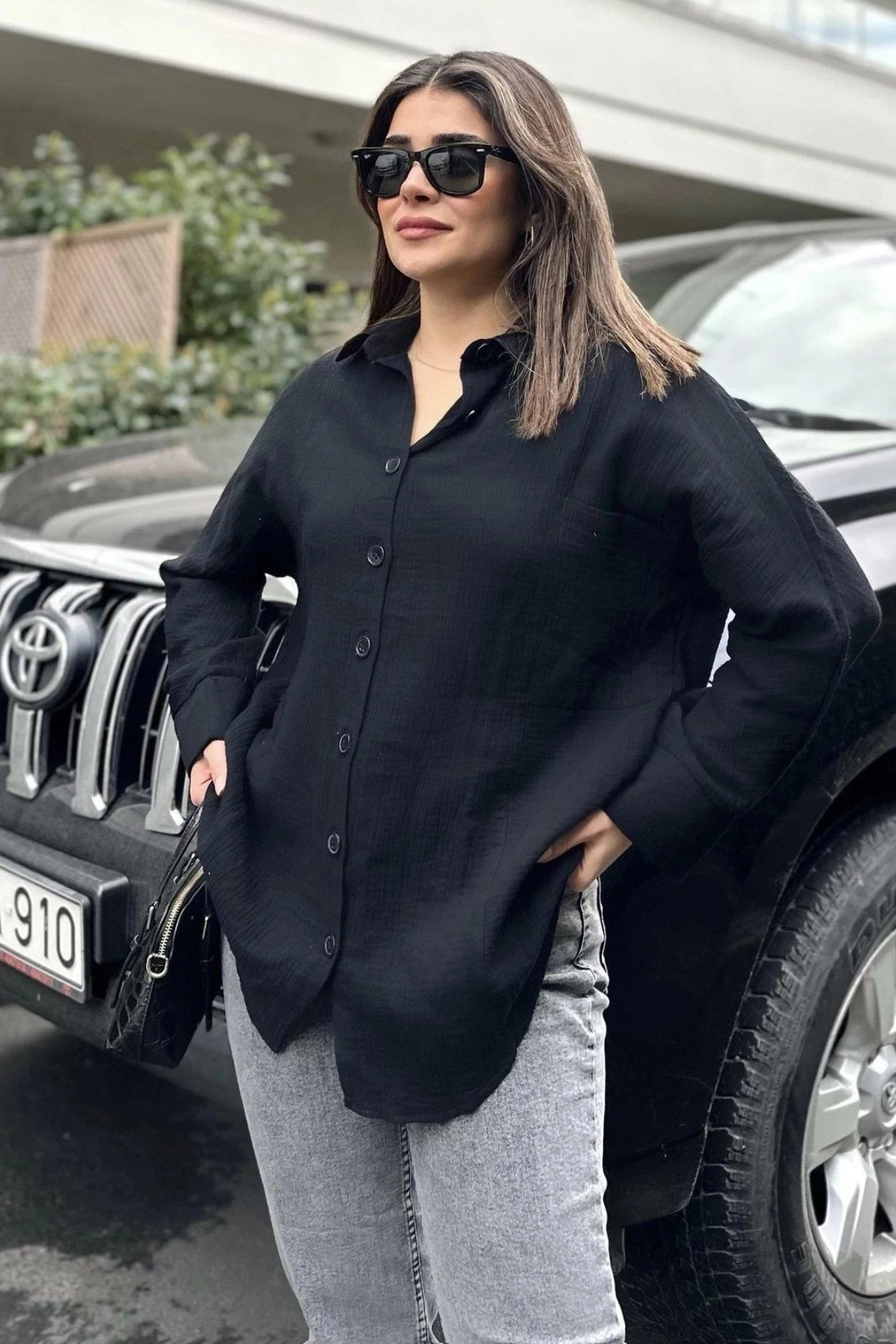 Kadın siyah Yarasa Kol, Cep Detaylı, Salaş Müslin Gömlek