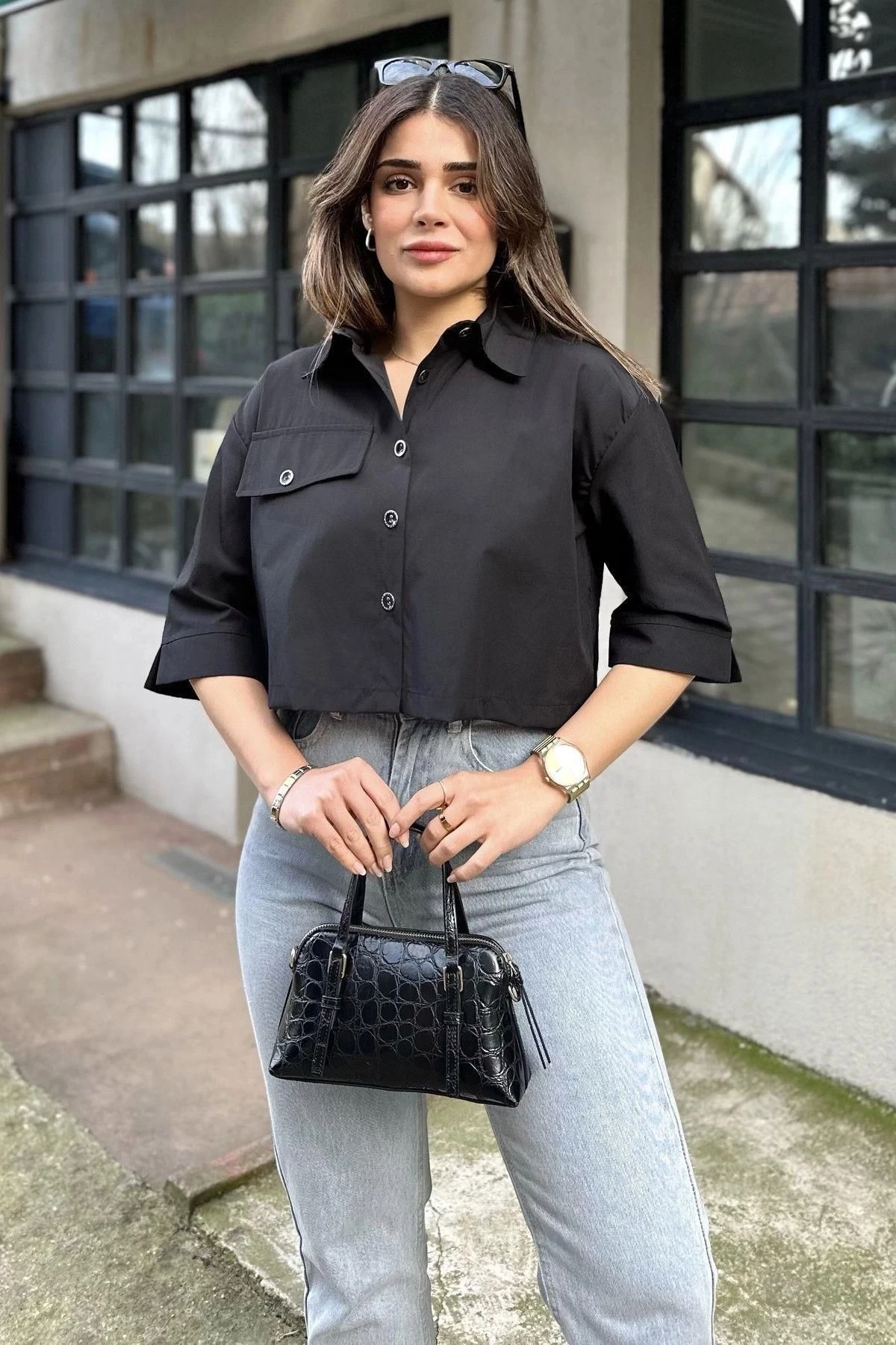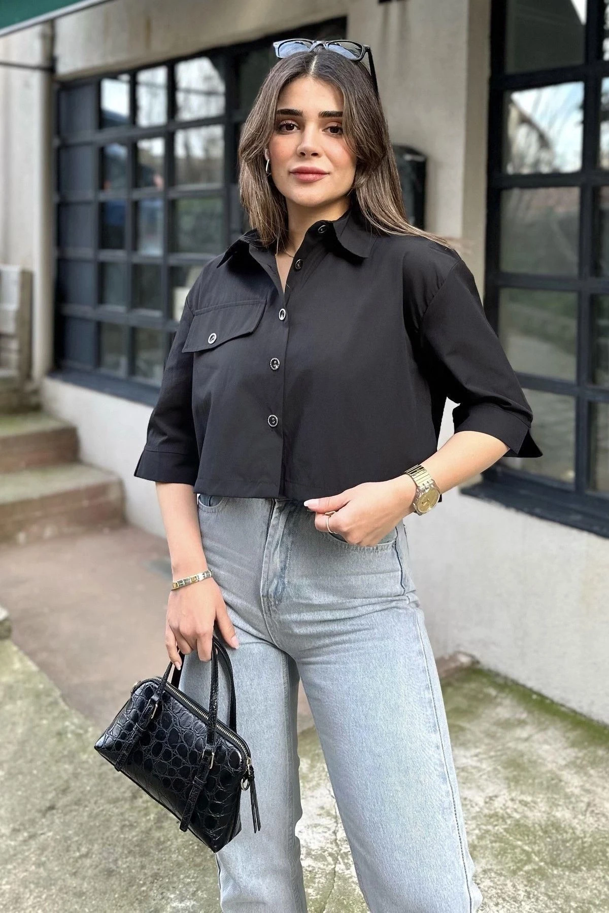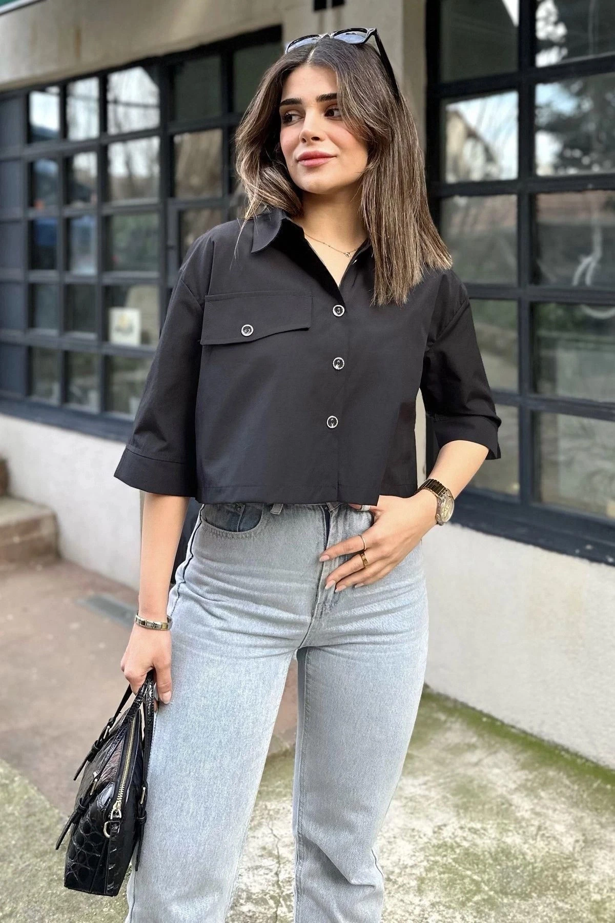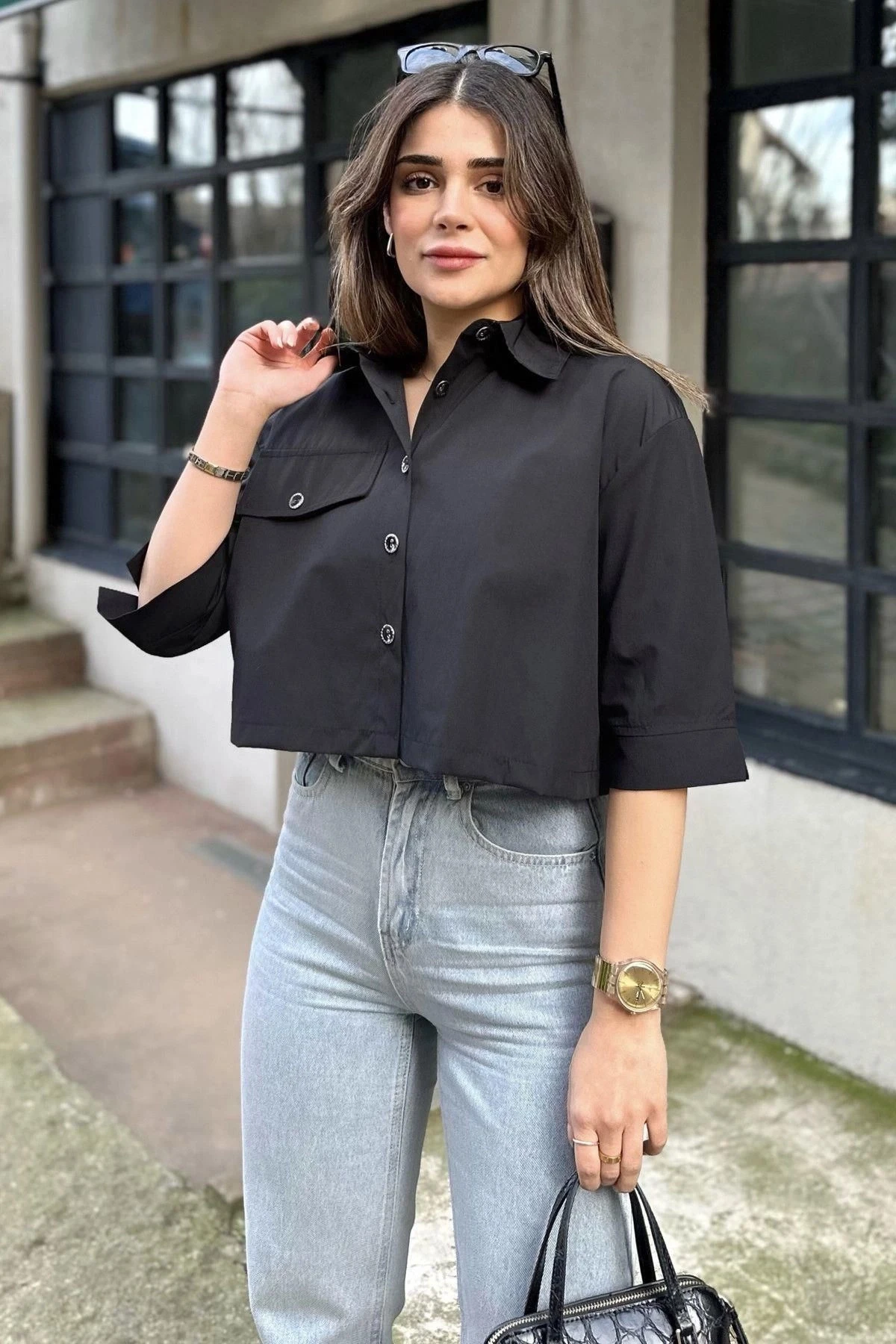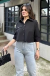 Kadın siyah Yarım Kol, Cep Ve Kol Detaylı, Terikoton Kumaş, Crop Gömlek