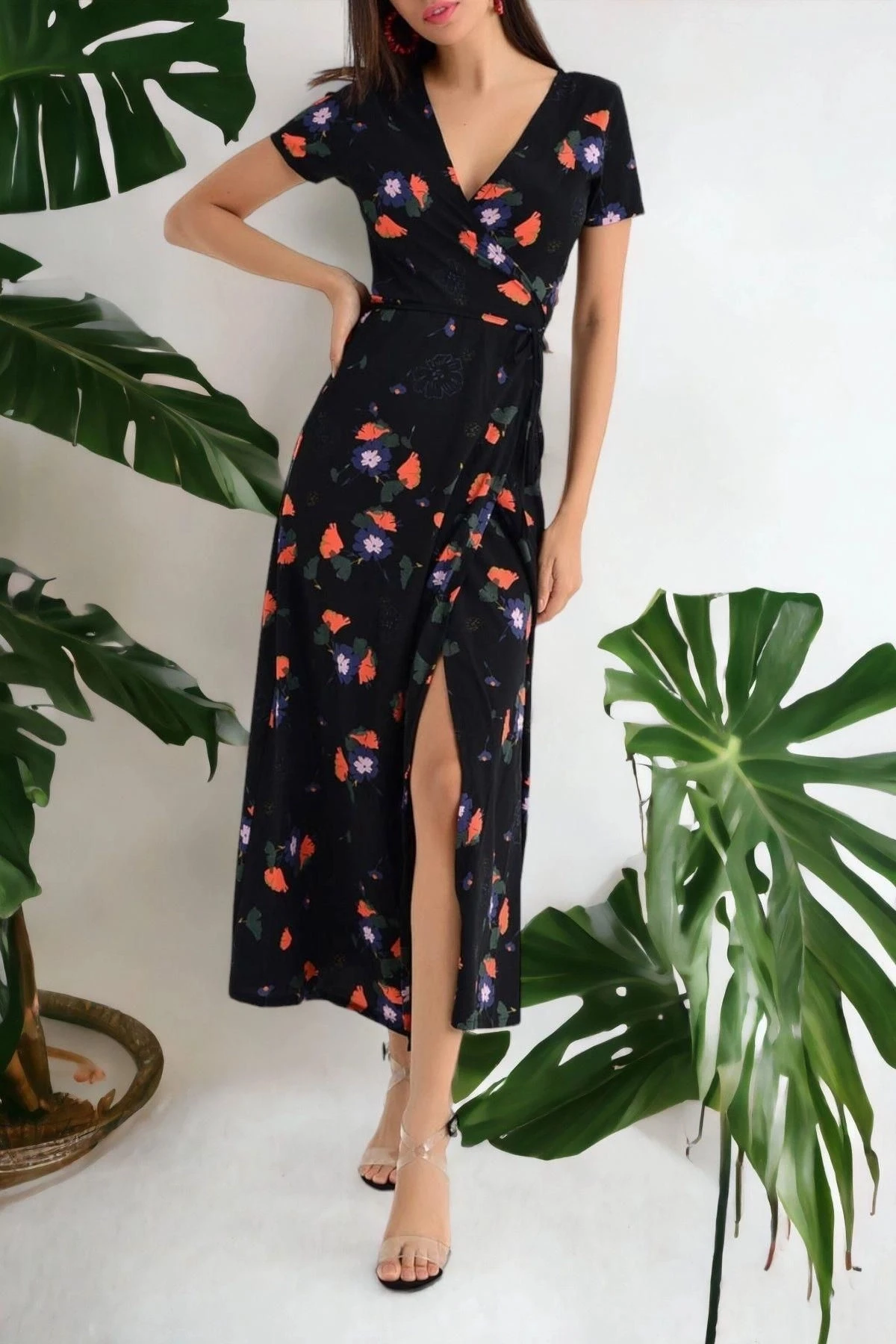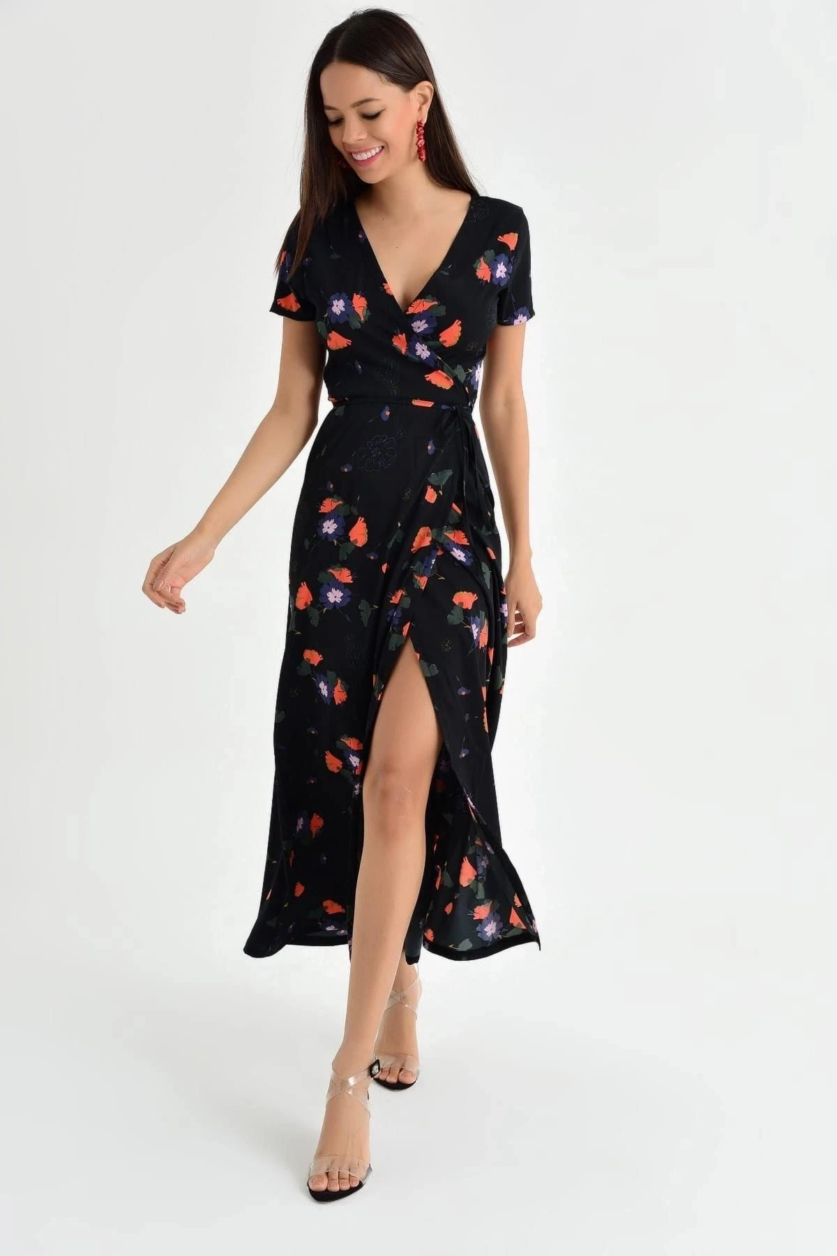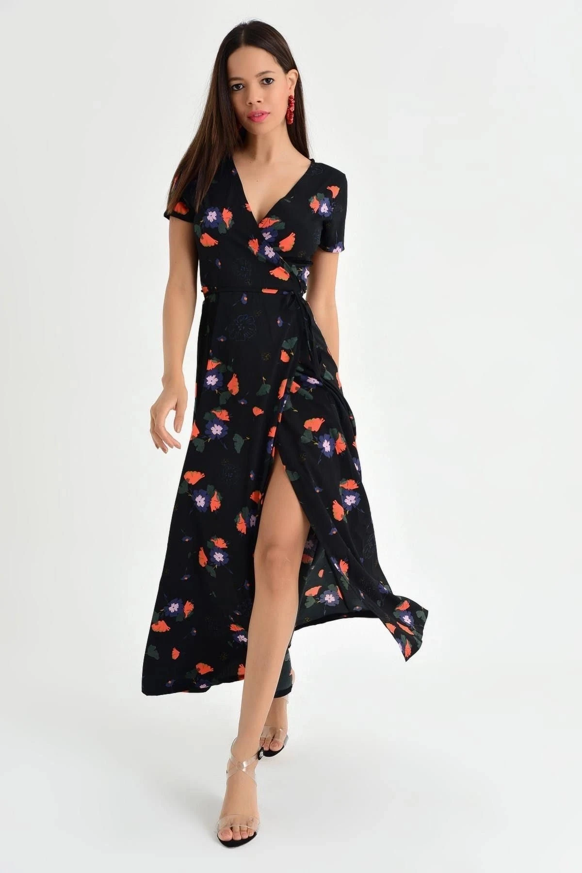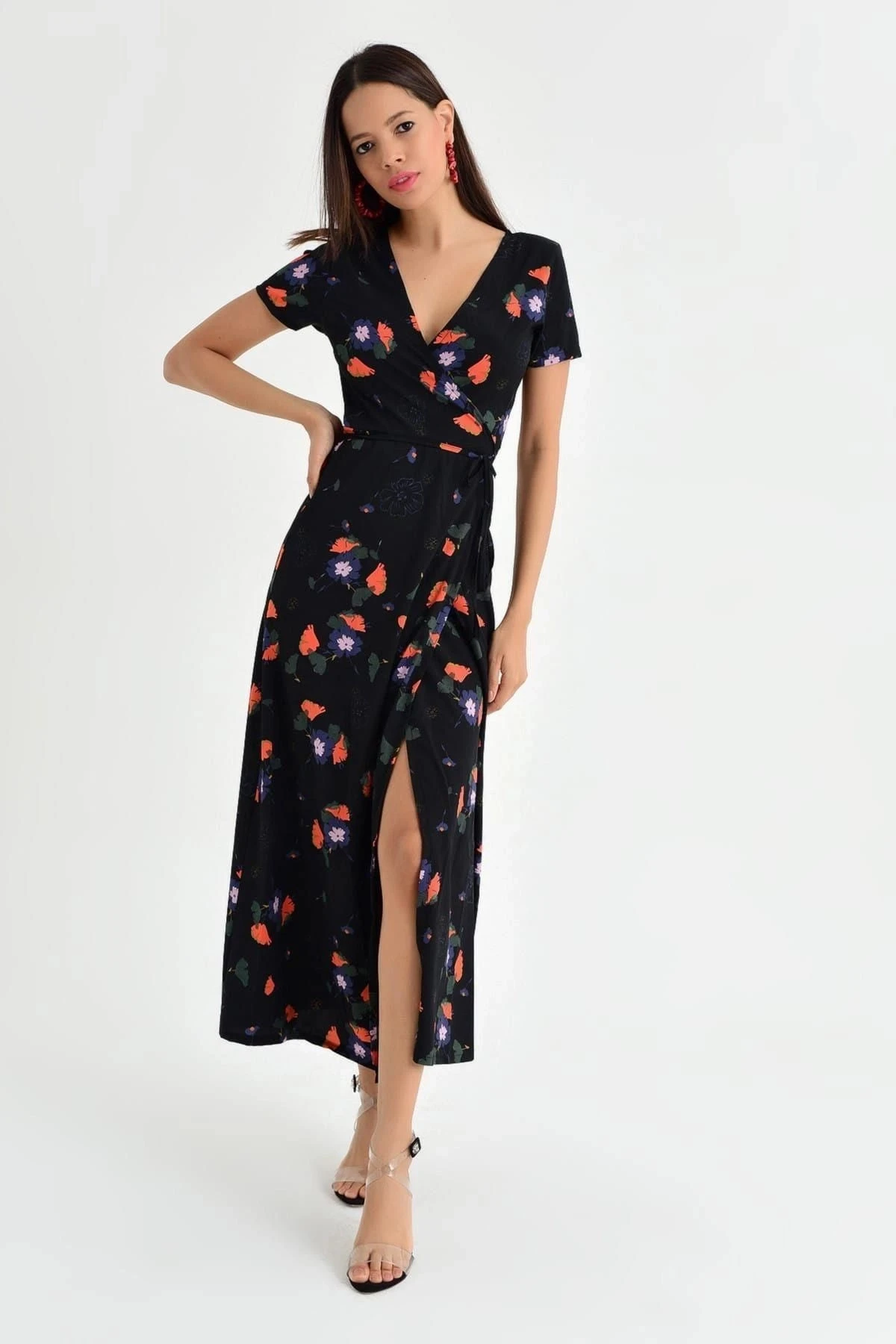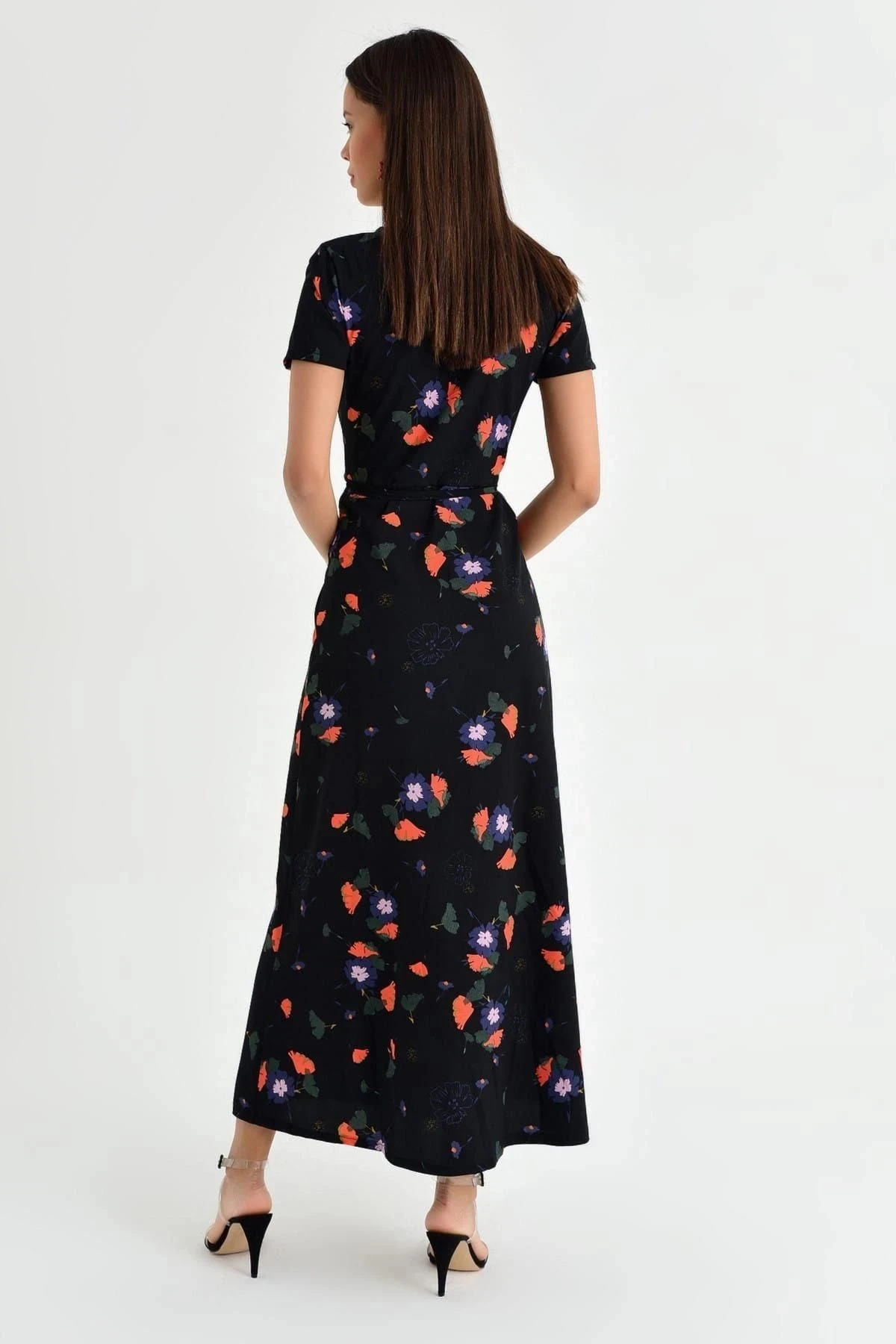 Kadın Siyah Yarım Kol Çiçek Desenli Kruvaze Yaka Maksi Boy Uzun Rahat Ve Günlük Elbise