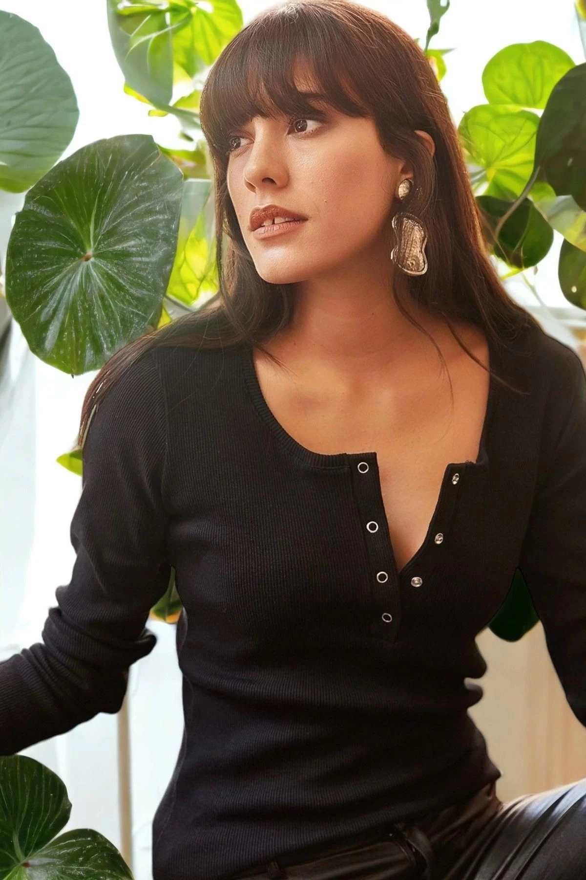 Kadın Siyah Yarım Patlı Uzun Kollu Kaşkorse Bluz Geniş Yuvarlak Yaka ve Çıtçıtlı Detaylı