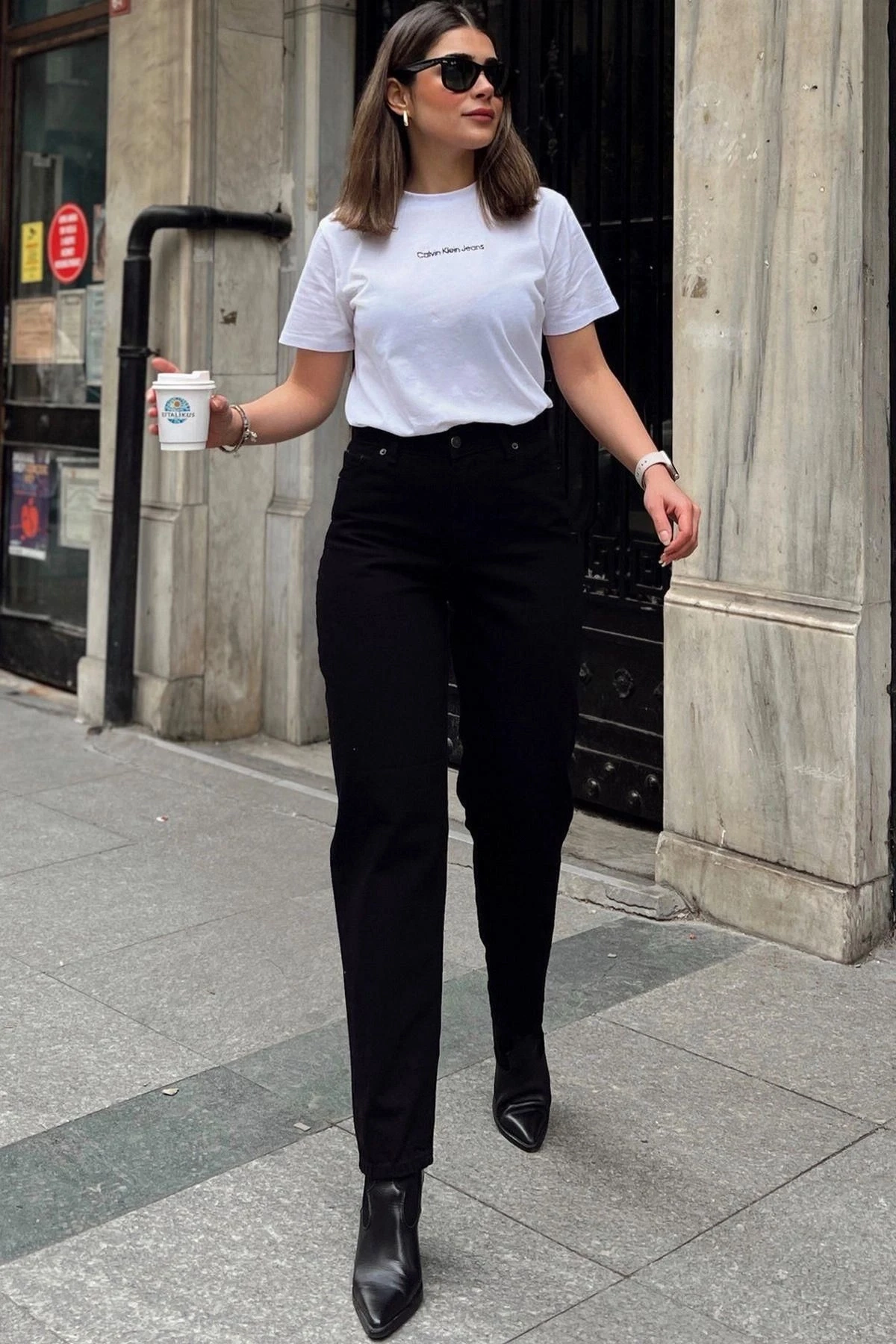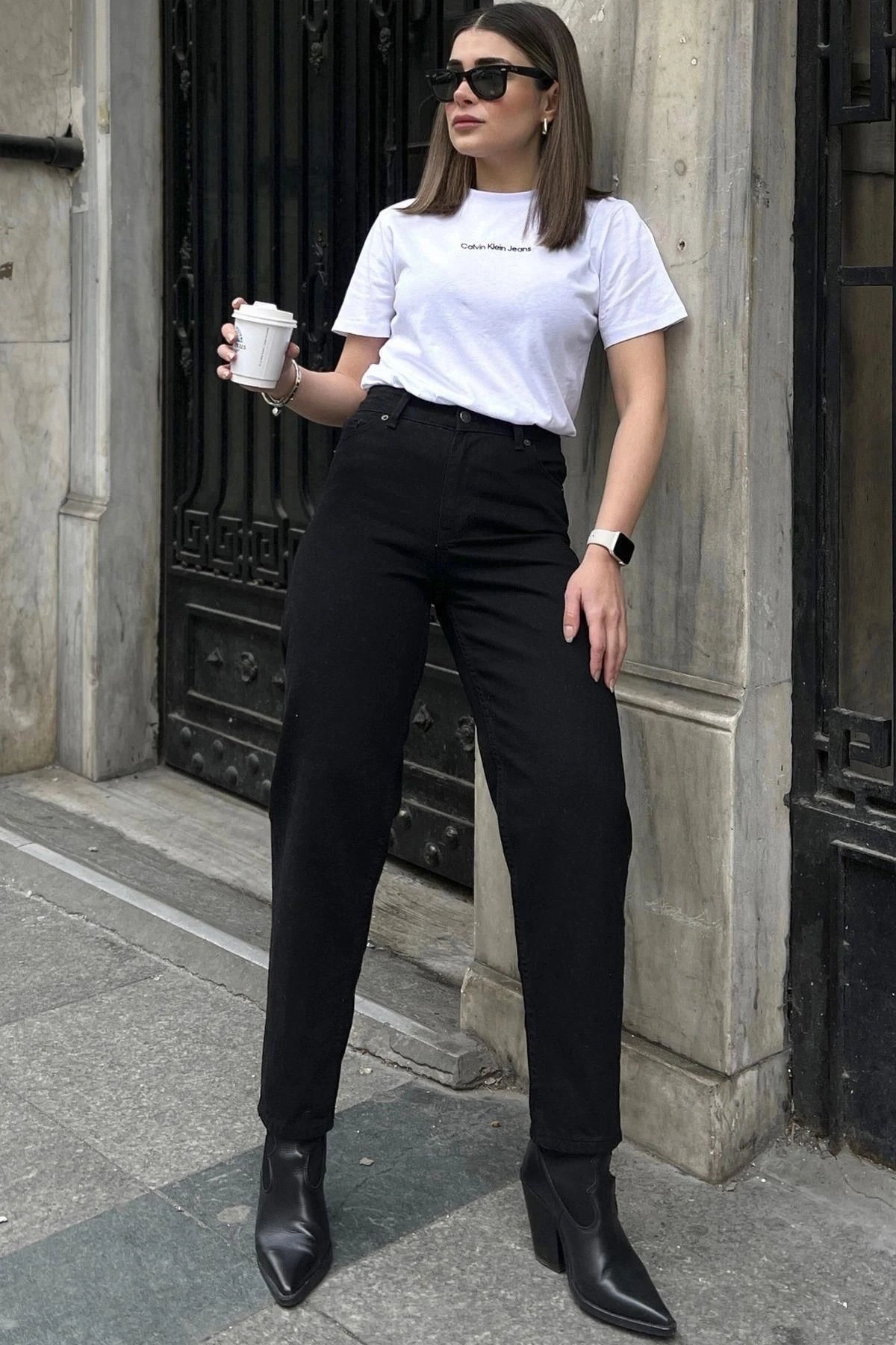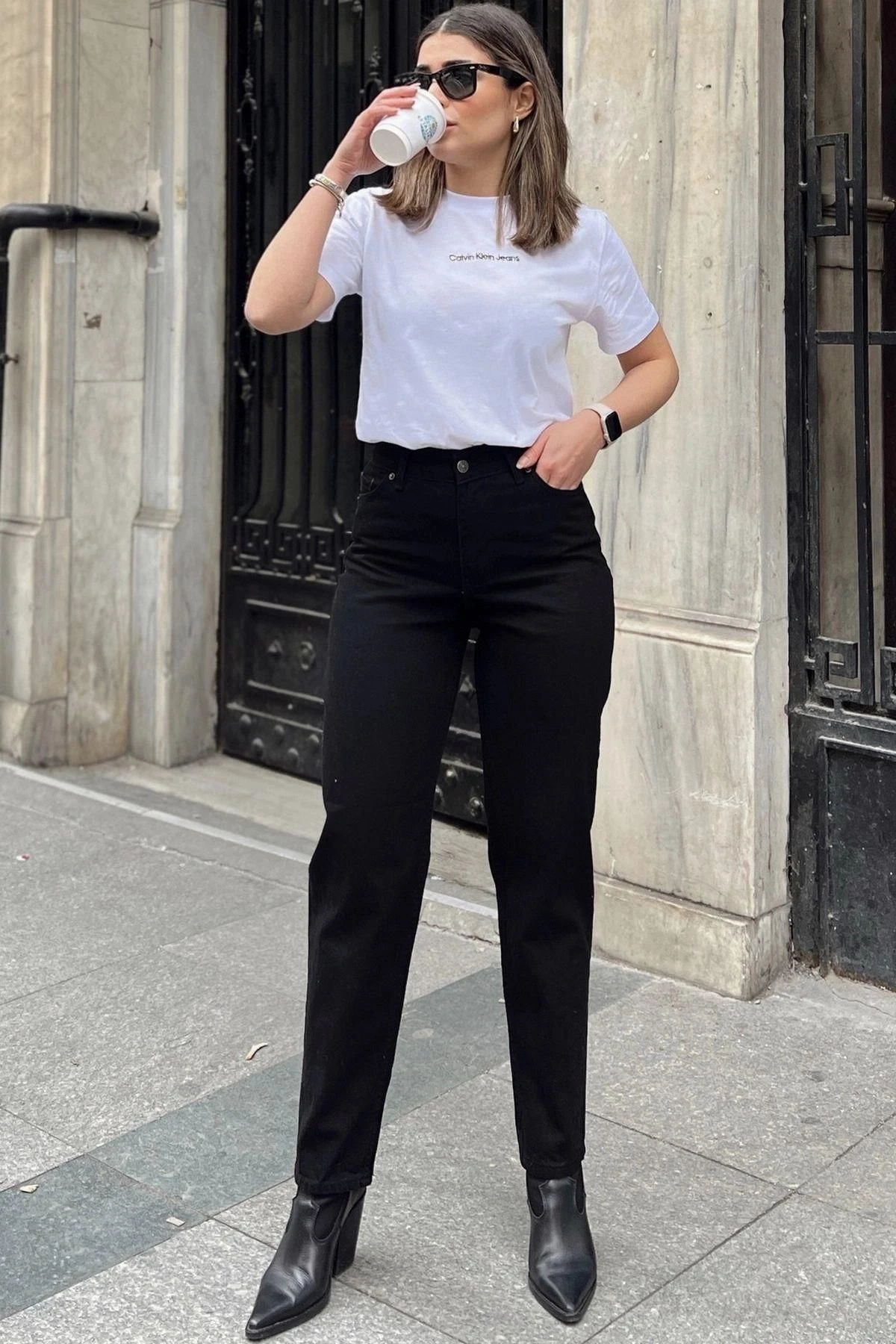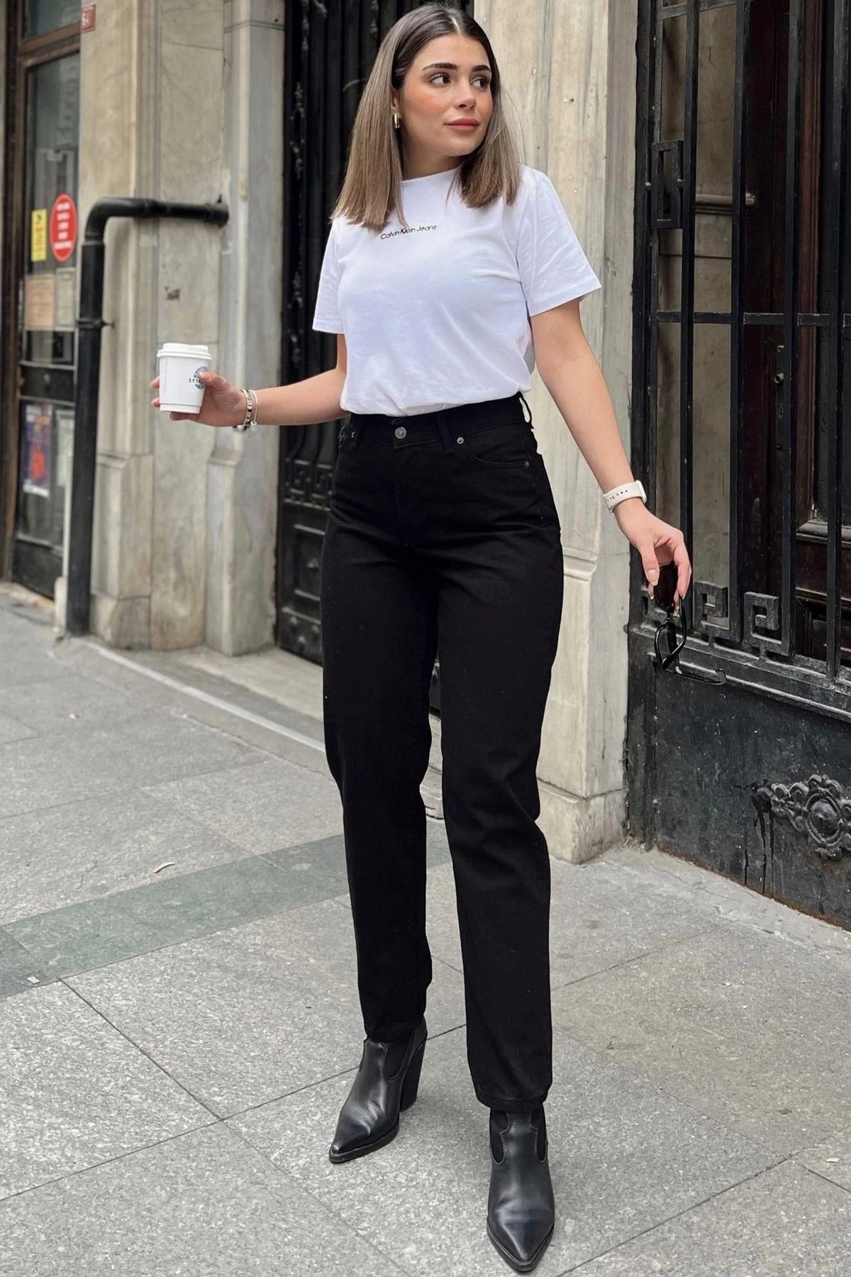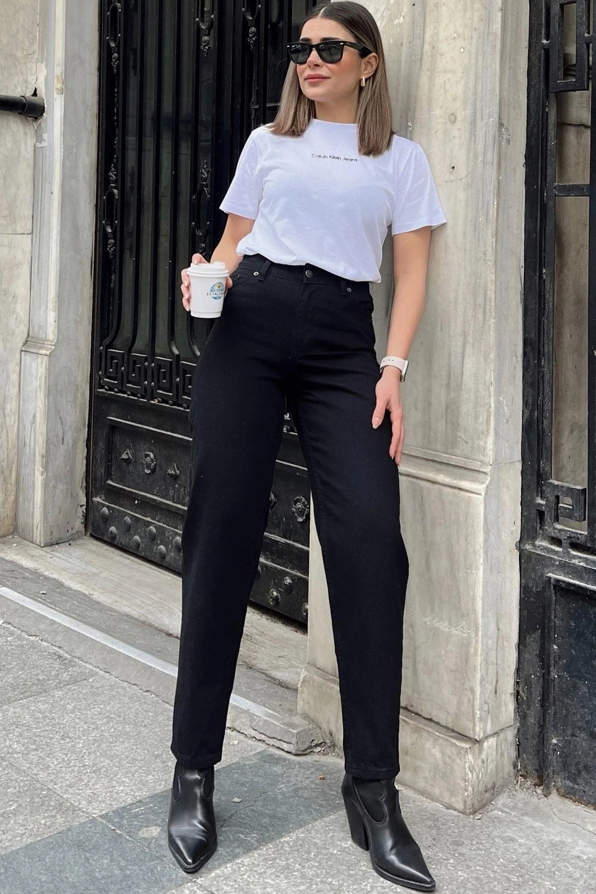 Kadın Siyah Yüksek Bel, Rahat Kesim, Boru Paça, Skinny Kot Pantolon - Jeans