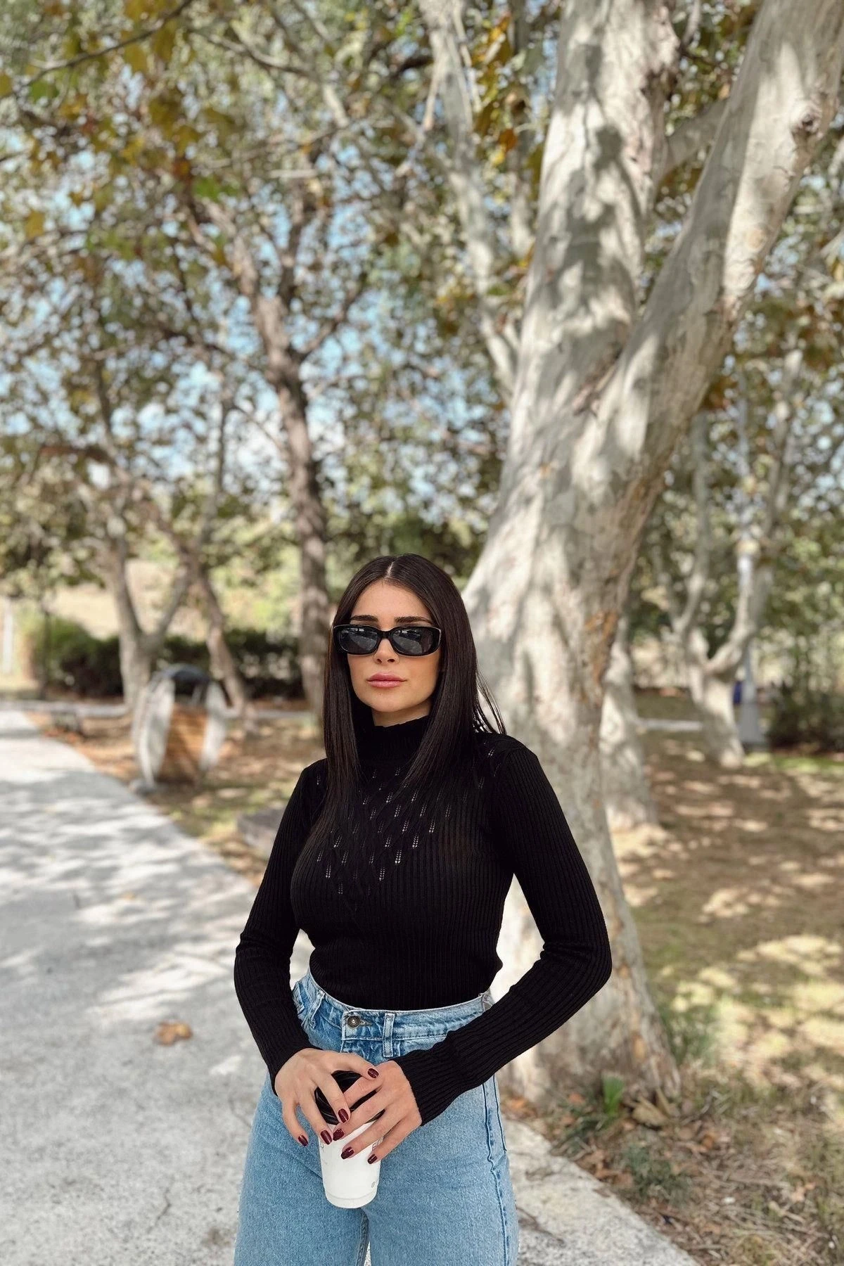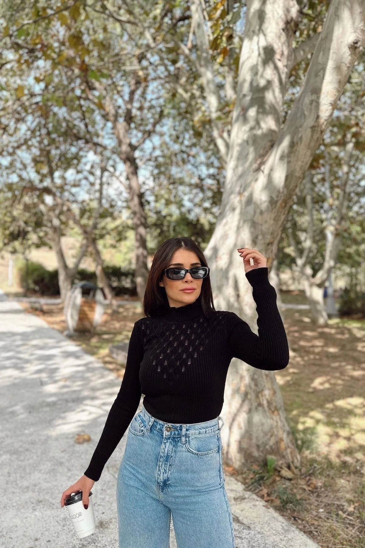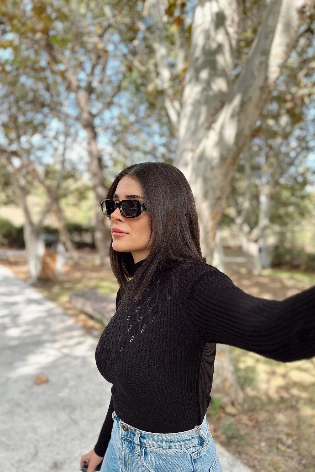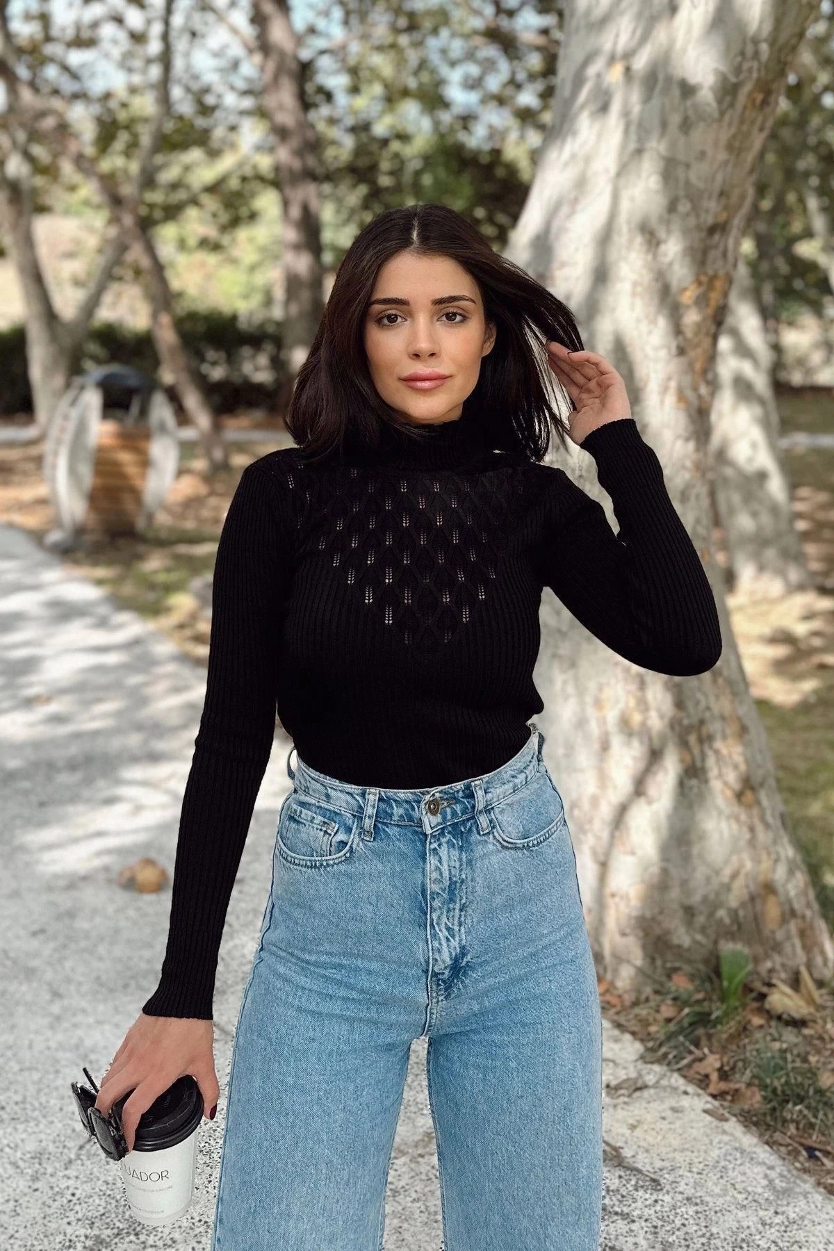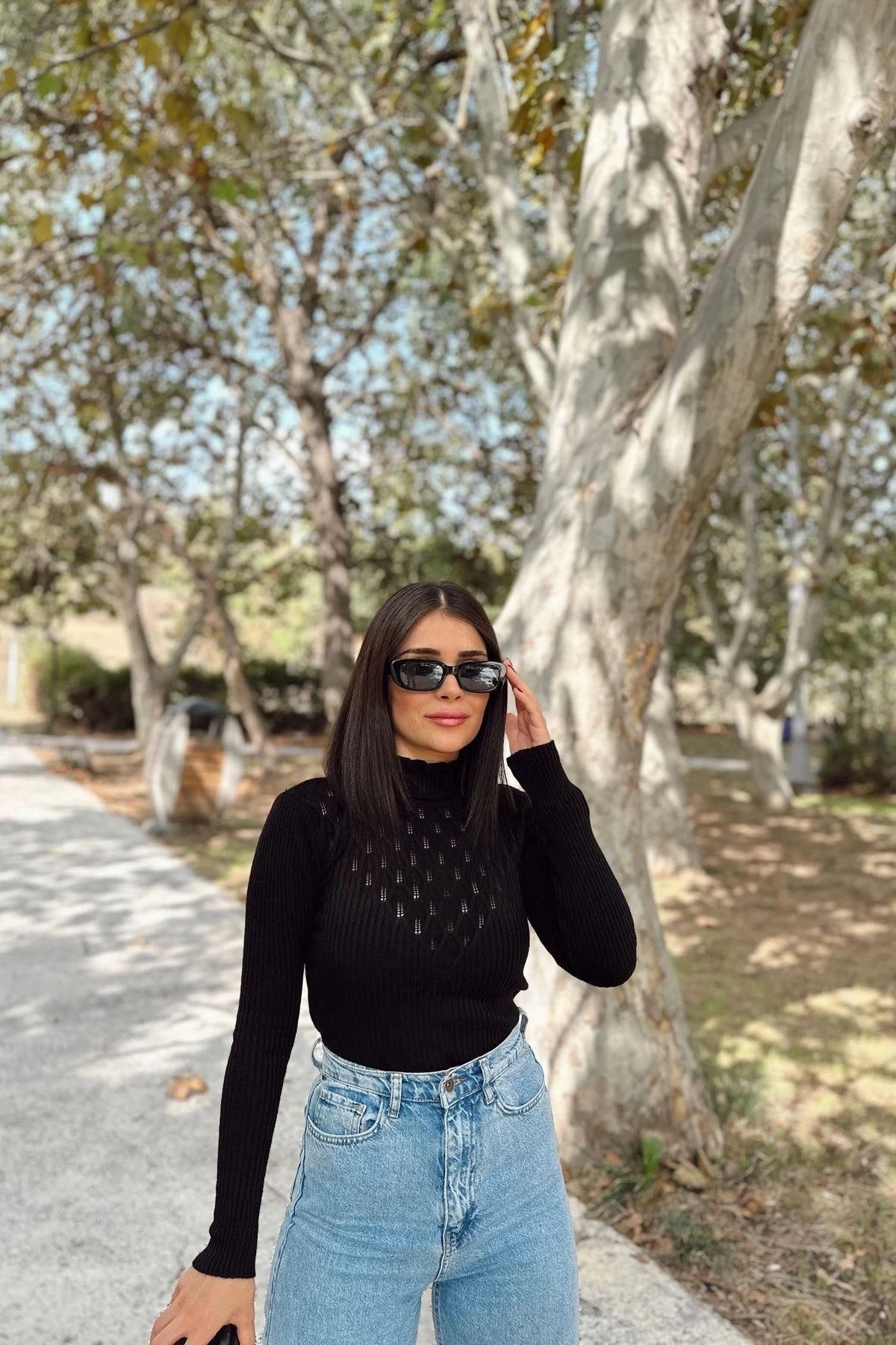 Kadın Siyah Yüksek Yaka, Uzun Kol,Vucüda Oturan Kalıp, Esnek Kumaş, Dekolte Detay, Triko Bluz