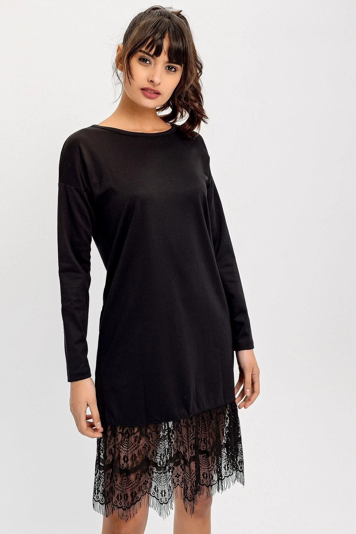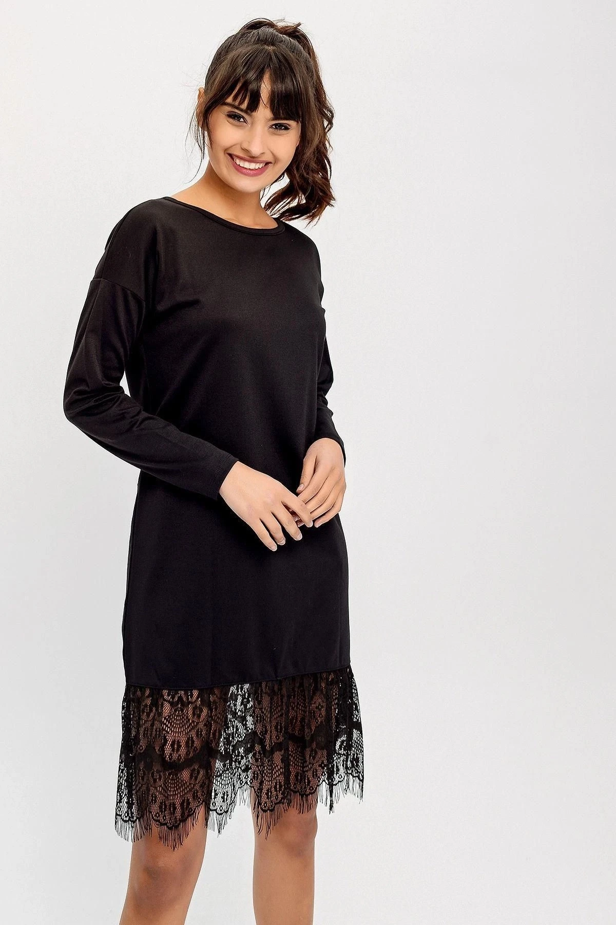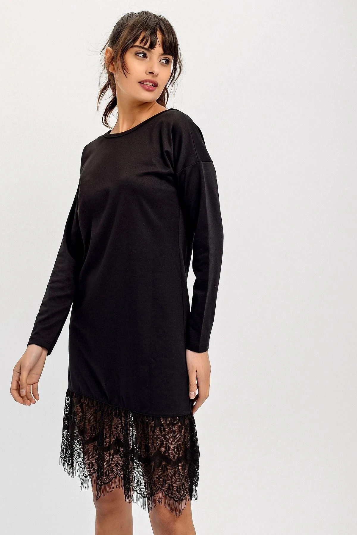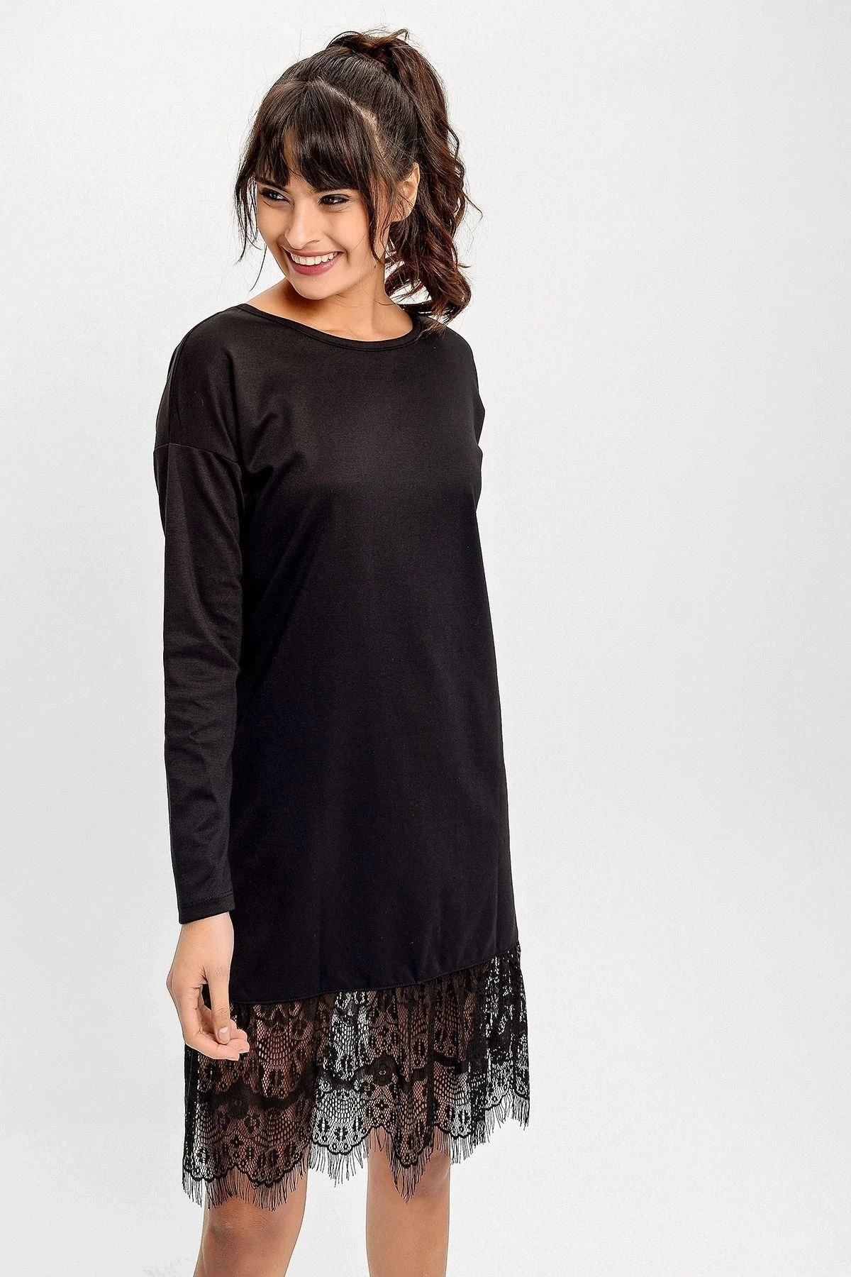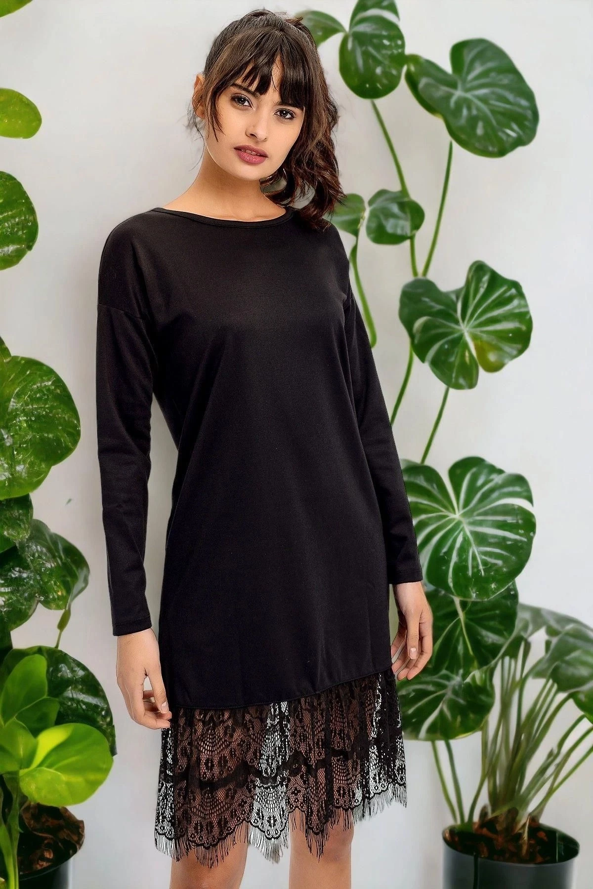 Bu şık siyah elbise, zarif bir tarza sahip olanlar için mükemmel bir seçenektir.; Yuvarlak yaka detayıyla modern bir görünüm sunarken, dantel ayrıntılarıyla da feminen bir dokunuş katmaktadır.; Uzun kollu tasarımıyla, elbise hem ofis hem de günlük kullanım için idealdir.; Elbisenin midi boyu, diz üstüne kadar uzanır ve bu da hem profesyonel ortamlarda şık bir görünüm sağlar hem de günlük aktivitelerinizde rahat bir şekilde hareket etmenizi sağlar.; Kumaş içeriği, % 95 polyester ve % 5 elastan olan bir karışımdan oluşur.; Bu, elbisenin yumuşak ve konforlu bir doku sunmasını sağlar.; Polyester malzeme, dayanıklılık ve kırışıklıklara karşı direnç gibi avantajlar sağlarken, elastan ise esneklik ve hareket özgürlüğü sunar.; Siyah renk, elbisenin klasik ve zamanı geçmeyen bir seçim olmasını sağlar.; Siyah, her türlü ten rengiyle mükemmel uyum sağlar ve kolayca diğer renklerle kombinlenebilir.; Bu elbiseyi istediğiniz tarza ve mekana uyacak şekilde tamamlayıcı aksesuarlarla tamamlayabilirsiniz.; Bu elbise, kalıp ve tasarım açısından özenle tasarlanmıştır.; Yuvarlak yaka, elbisenin şık bir silüete sahip olmasını sağlar ve dantel detayları, zarafetinizi ön plana çıkarmak için mükemmel bir ayrıntıdır.; Midi boyu, klasik ve şık bir görünüm sunarken, uzun kollu tasarımı da elbiseye ek bir sofistike dokunuş katmaktadır.; Bu elbise, ofis ortamlarında profesyonel bir görünüm elde etmek isteyenler için mükemmel bir seçenek olabilir.; Aynı zamanda günlük aktivitelerinizde şık ve rahat bir stil arayanlar için de idealdir.; Kısacası, bu elbise her durumda size şıklık ve rahatlık sunacak bir seçenektir.