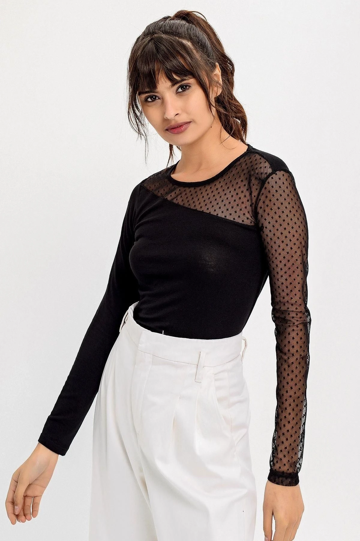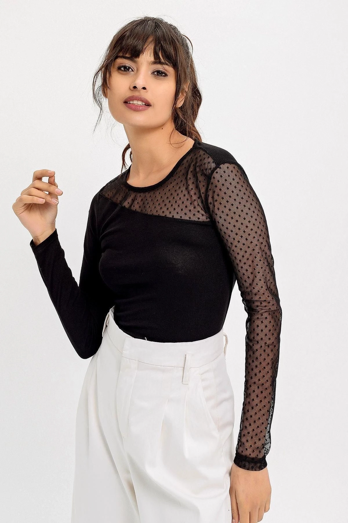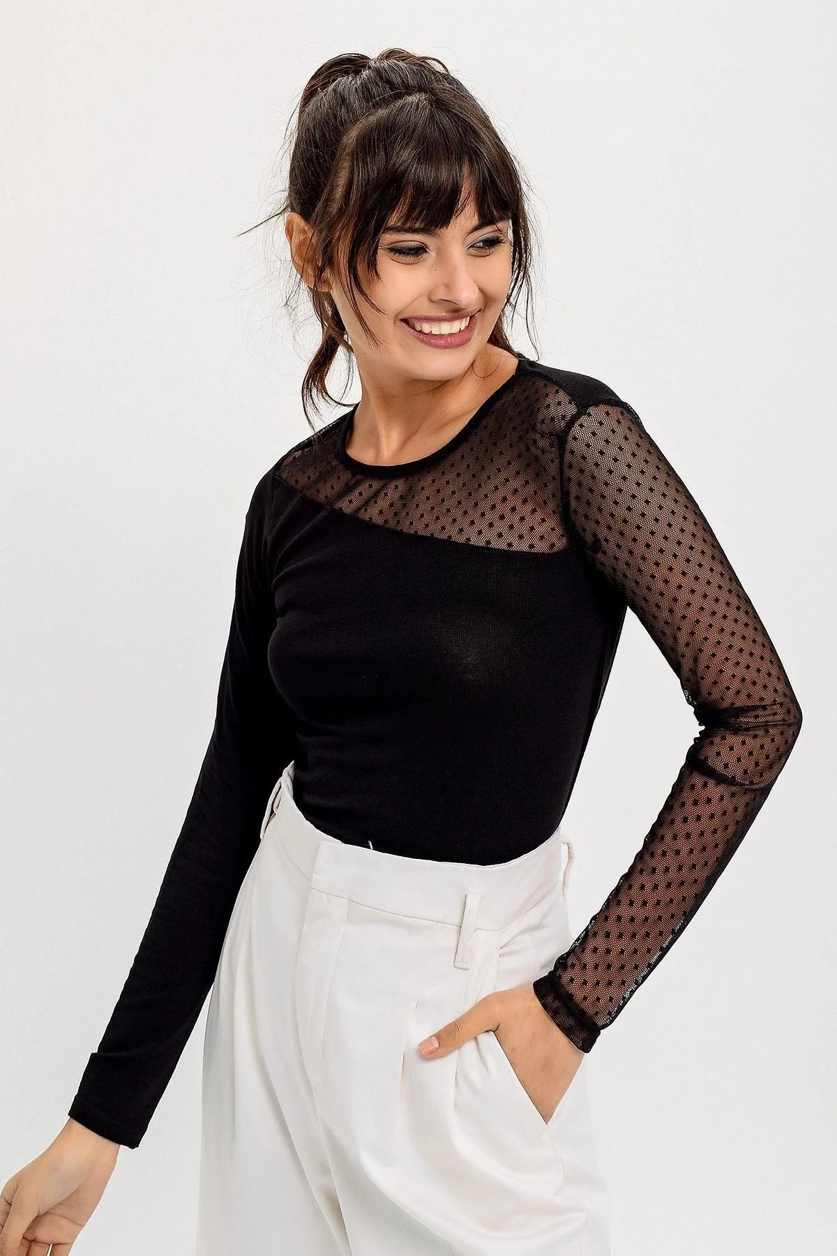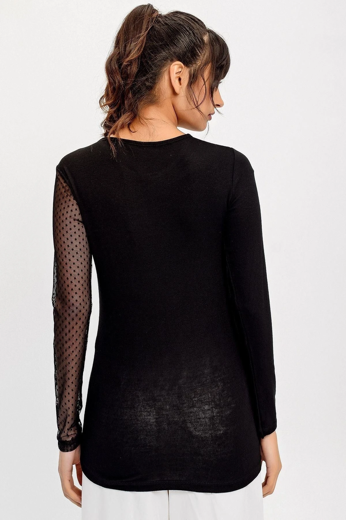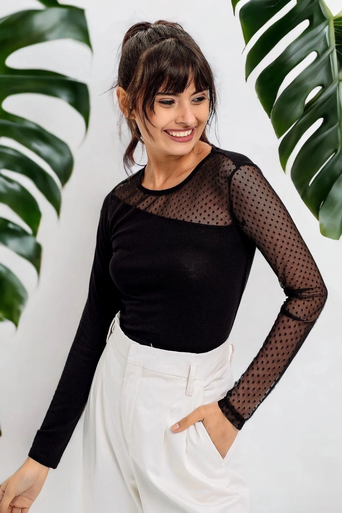 Kadın Siyah Yuvarlak Yaka Desenli Tül Garnili Bluz Uzun Kol Tül Detaylı Regular Kesim Standart Boy