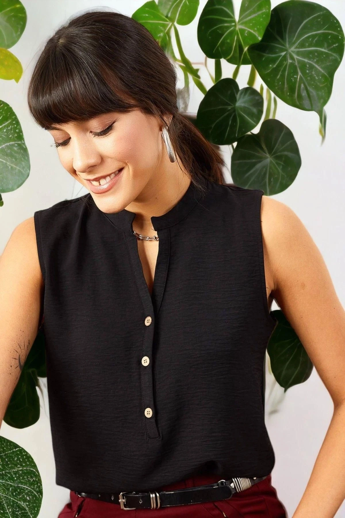 Kadın Siyah Yuvarlak Yaka Sıfır Kol Düğme Detaylı Regular Kesim Standart Boy Bluz