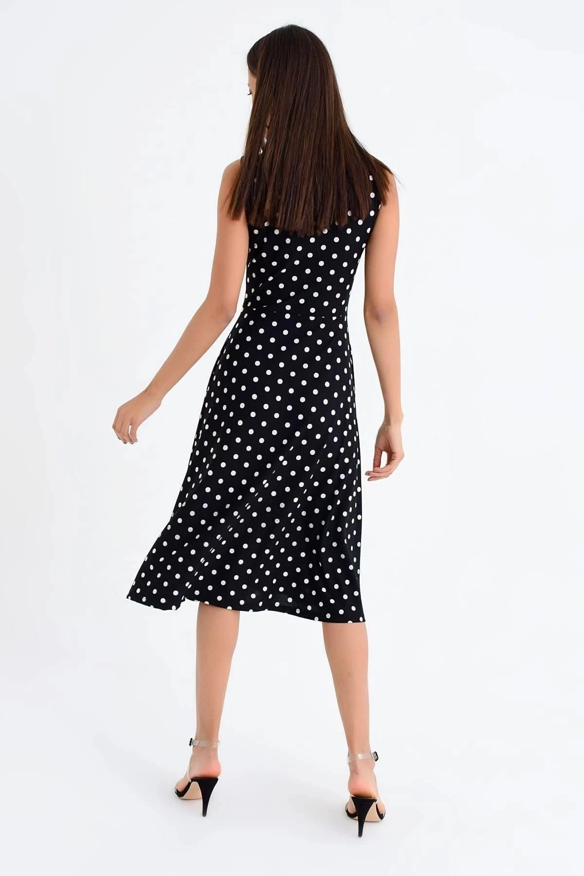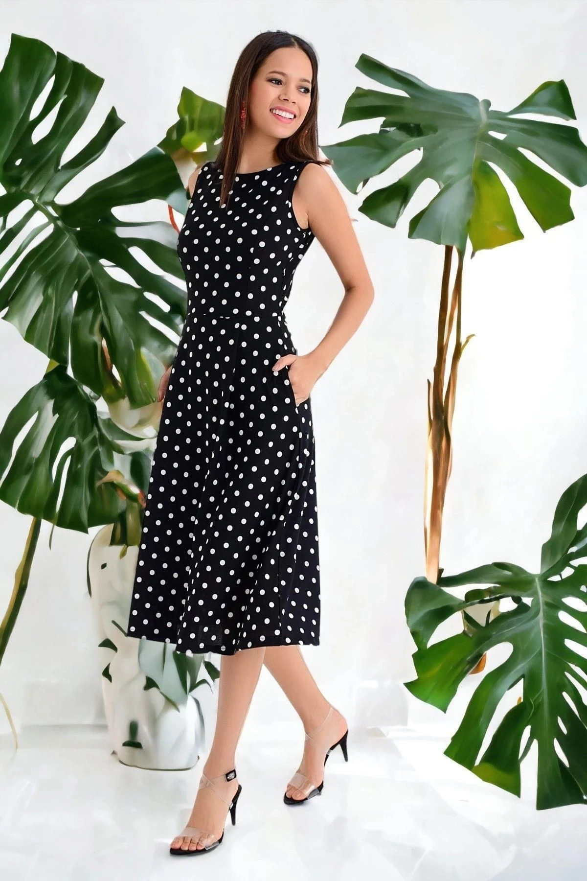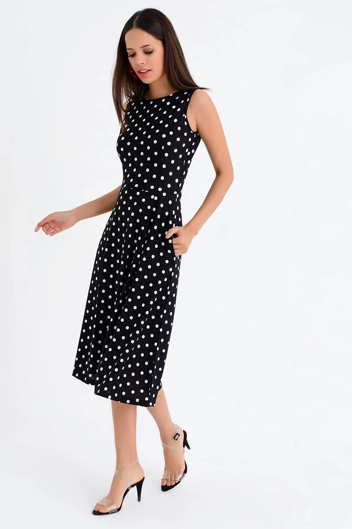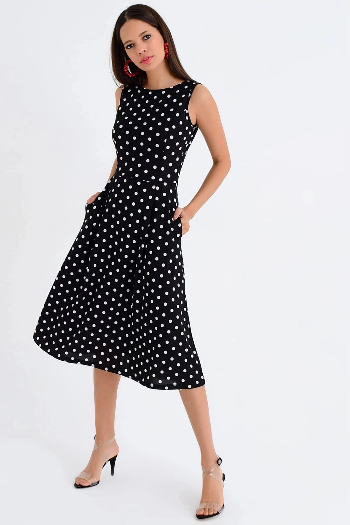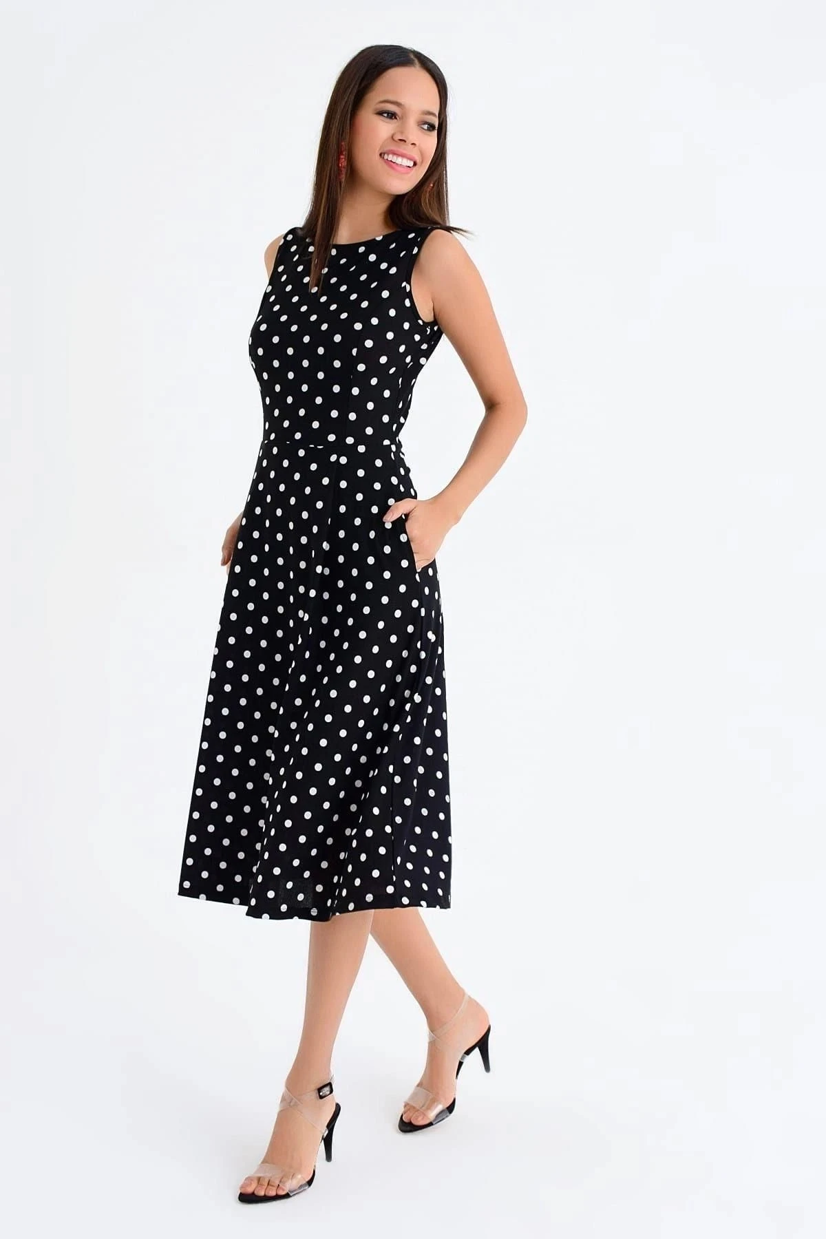Kadın Siyah Yuvarlak Yaka Sıfır Kol Puantiye Desenli Cep Detaylı Midi Boy Diz üstü Elbise