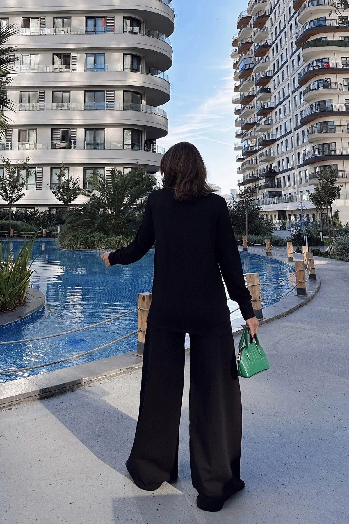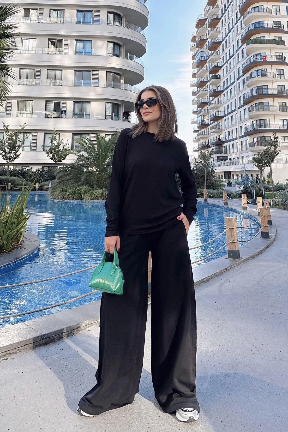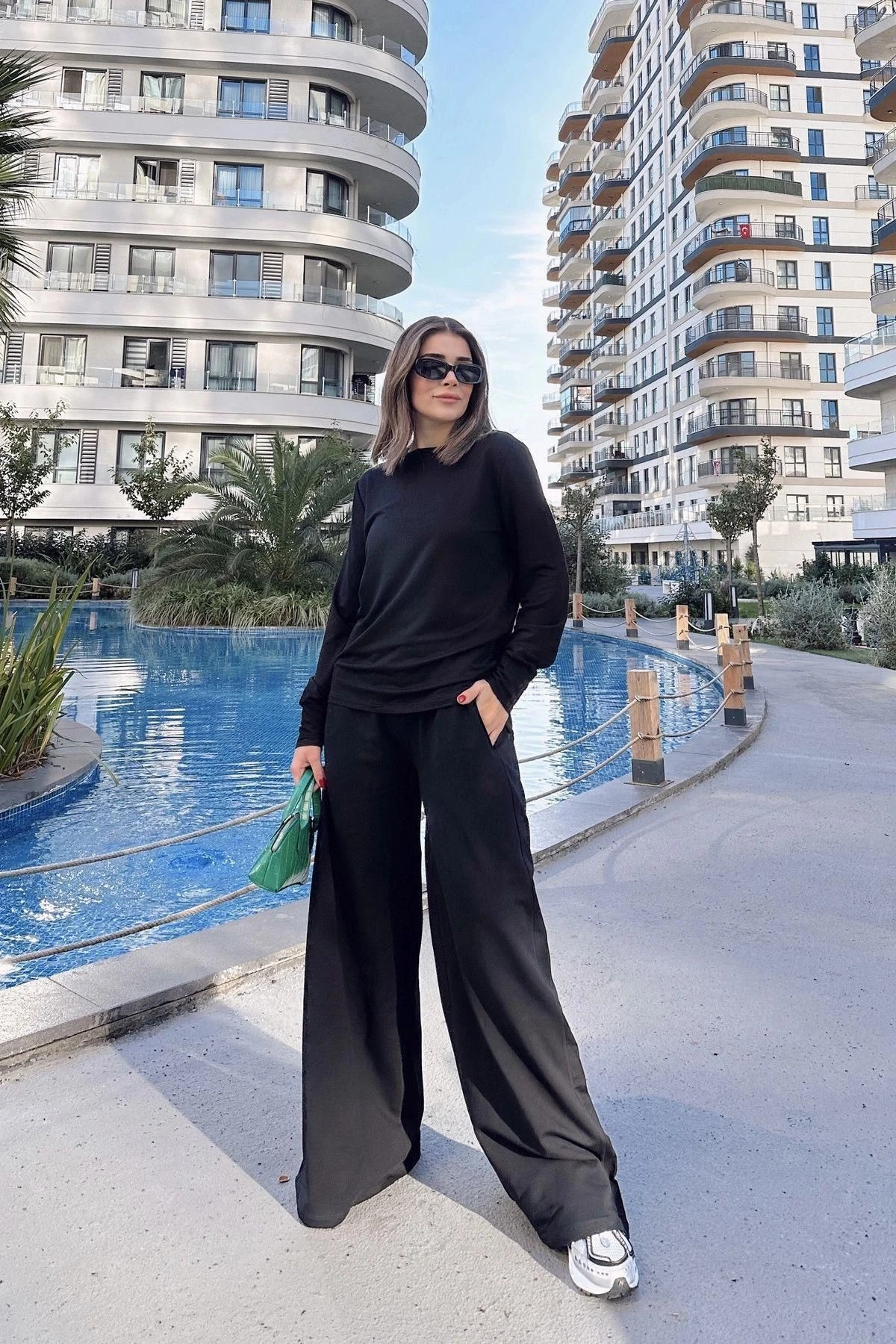 Kadın Siyah Yuvarlak Yaka Sweatshirt & Bol Paça Beli Lastikli Pantolon - Rahat Alt & Üst Takım