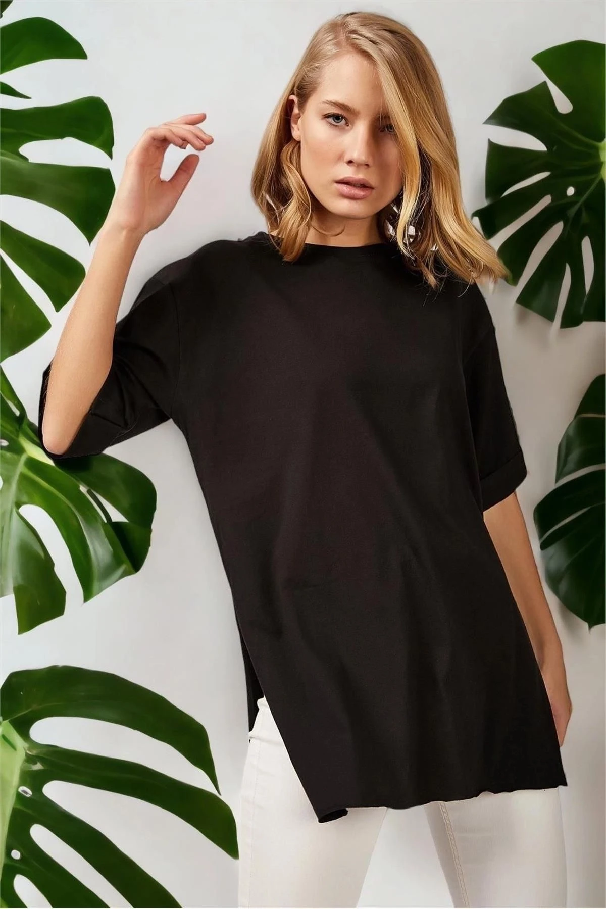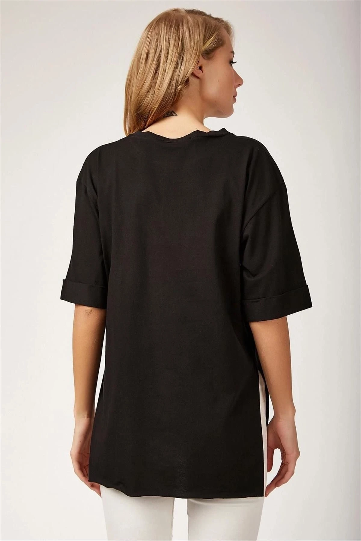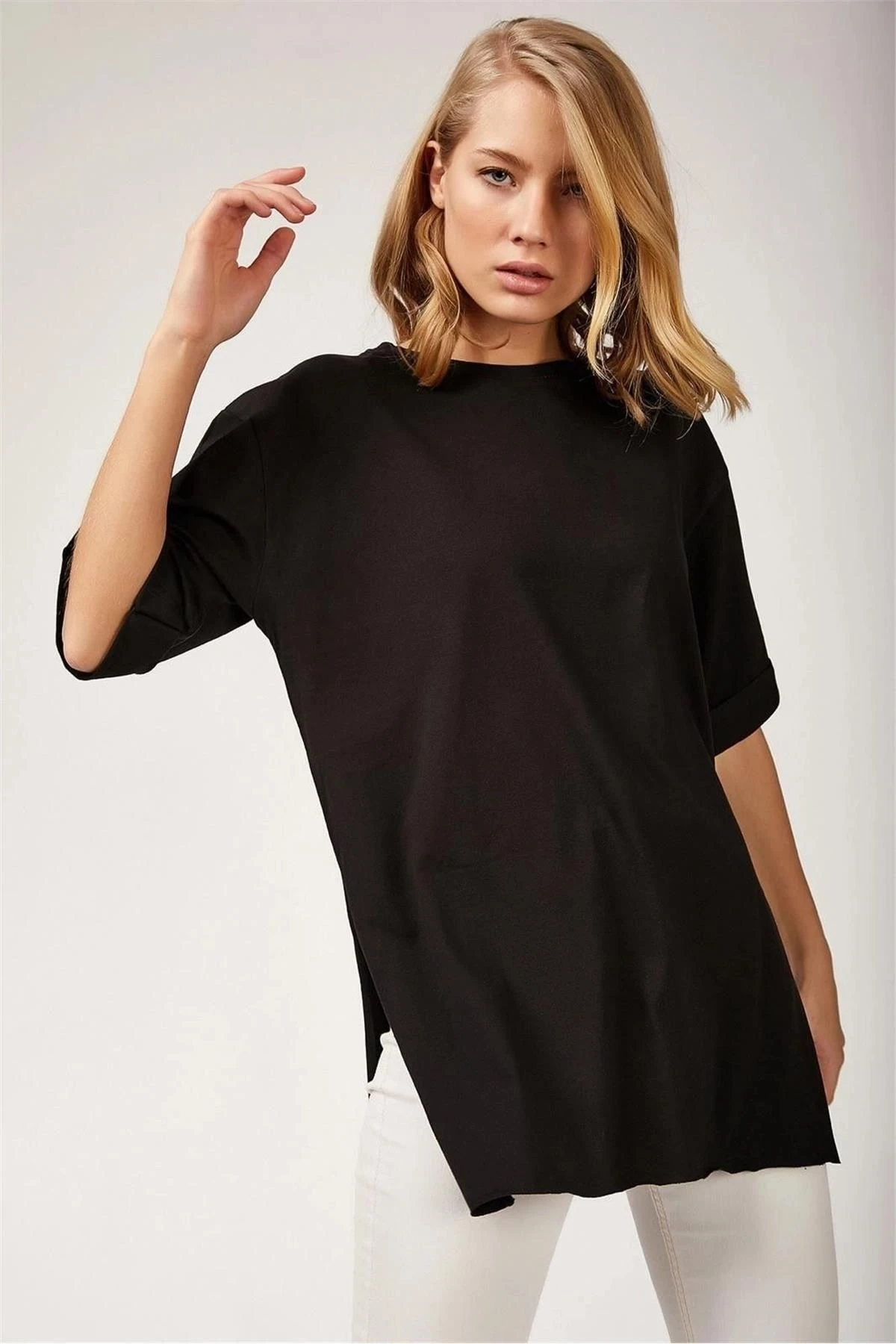 Kadın Siyah Yuvarlak Yaka Truvakar Kol Yırtmaç Detaylı Basic Kaliteli Kumaş Oversize Kesim Bluz