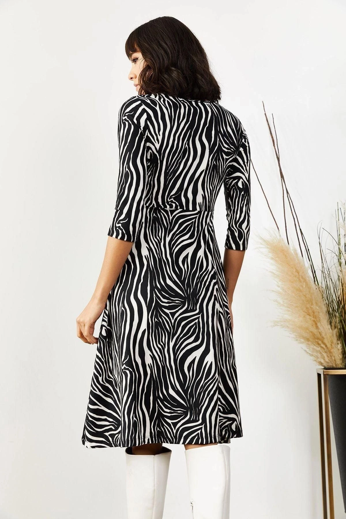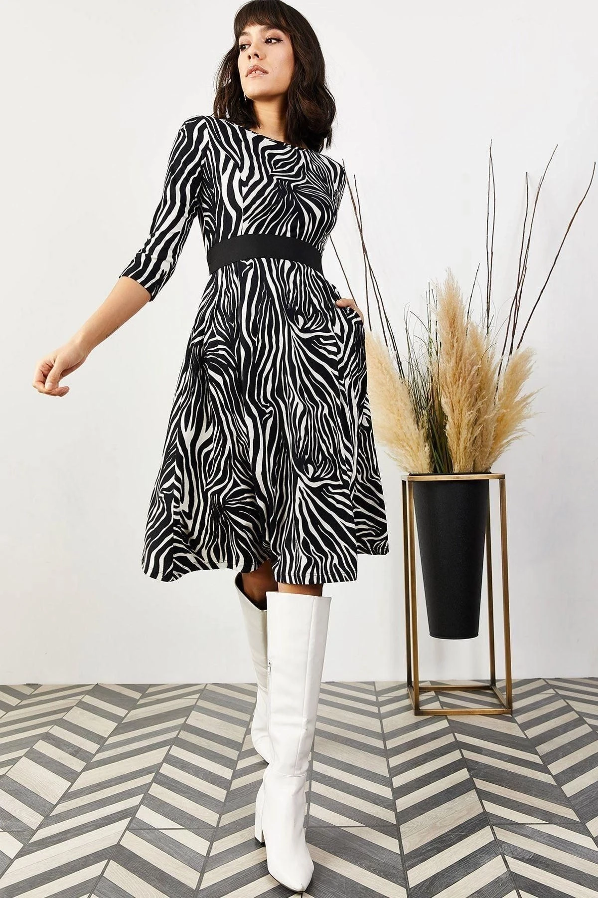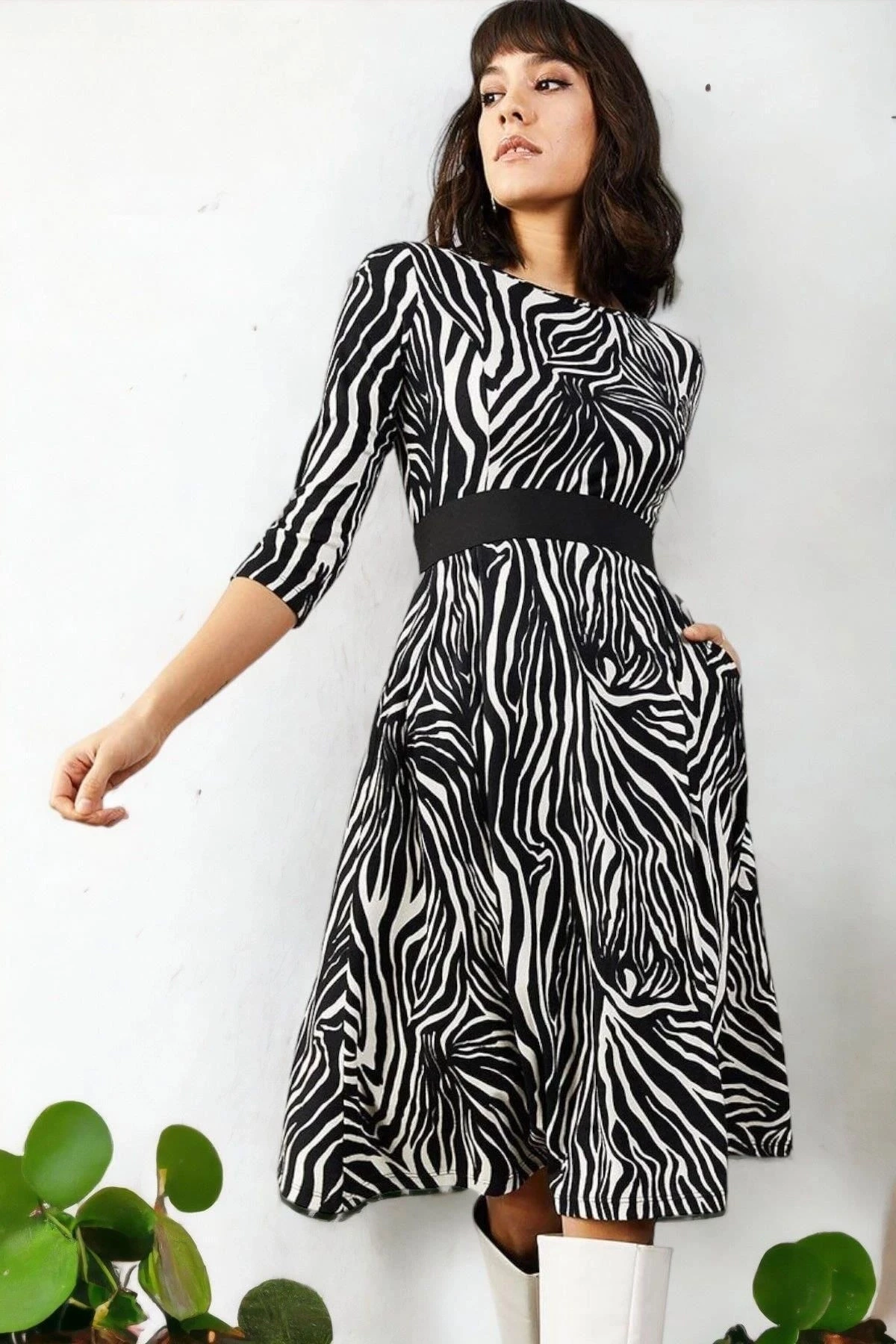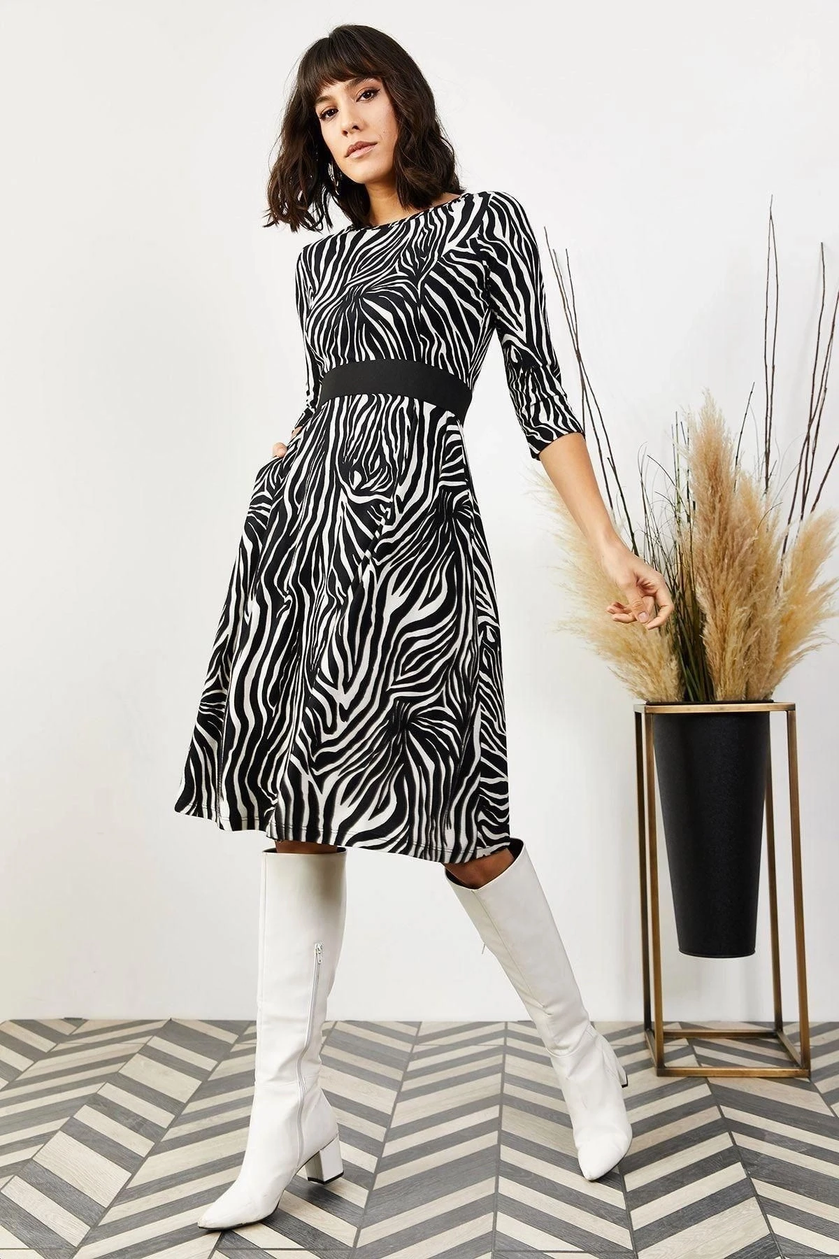 Bu muhteşem elbise, zarif ve şık bir seçenek arayanların beğenisini kazanacak.; Siyah renk, asalet ve şıklığın sembolüdür ve bu elbiseyle tarzınızı ön plana çıkarabilirsiniz.; Yuvarlak yaka tasarımı, feminen bir dokunuş sunarken, truvakar kol detayları modern bir görünüm katıyor.; Zebra desenli kumaş, göz alıcı bir detaydır ve tarzınızı vurgulamak için mükemmel bir seçenektir.; Kaliteli kumaş yapısı, rahat bir giyim deneyimi sunarken, %95 Polyester ve %5 Elastane içeriği, esneklik ve hareket özgürlüğü sağlar.; Bu elbise, midi boyuyla diz üstünde biten bir uzunluğa sahiptir, böylece hem ofis hem de günlük kullanım için uygundur.; Ofiste profesyonel bir görünüm elde etmek isterseniz, bu elbise size şıklık ve özgüven katacaktır.; Günlük kullanımda ise rahatlığı ve şıklığı bir arada sunar, özellikle şık bir akşam yemeği veya arkadaşlarınızla buluşma için idealdir.; Bu elbise, renk, kalıp ve tasarım konusunda mükemmel bir seçenektir.; Siyah rengi, her duruma uyum sağlar ve zamansız bir şıklık sunar.; Yuvarlak yaka ve truvakar kol detayları, modern ve trend bir görünüm yaratır.; Zebra desenli kumaş ise cesur bir tarzın ifadesidir.; Tüm bunlarla birlikte, kaliteli kumaş yapısı ve içeriği sayesinde bu elbise uzun süre dayanıklılığını korur.; %95 Polyester ve %5 Elastane içeriği, esneklik sağlar ve vücuda tam oturur.; Ayrıca, kolay bakım özellikleriyle de pratik bir kullanım sunar.; Bu elbiseyle her anı özel kılabilirsiniz.; Ofiste profesyonel bir görünüm elde etmek, günlük hayatta şık ve rahat olmak için ideal bir seçimdir.; Kendinizi özgüvenli ve şık hissetmek için bu kaliteli kumaşa sahip, siyah renkli, yuvarlak yaka truvakar kol zebra desenli elbiseyi tercih edebilirsiniz.