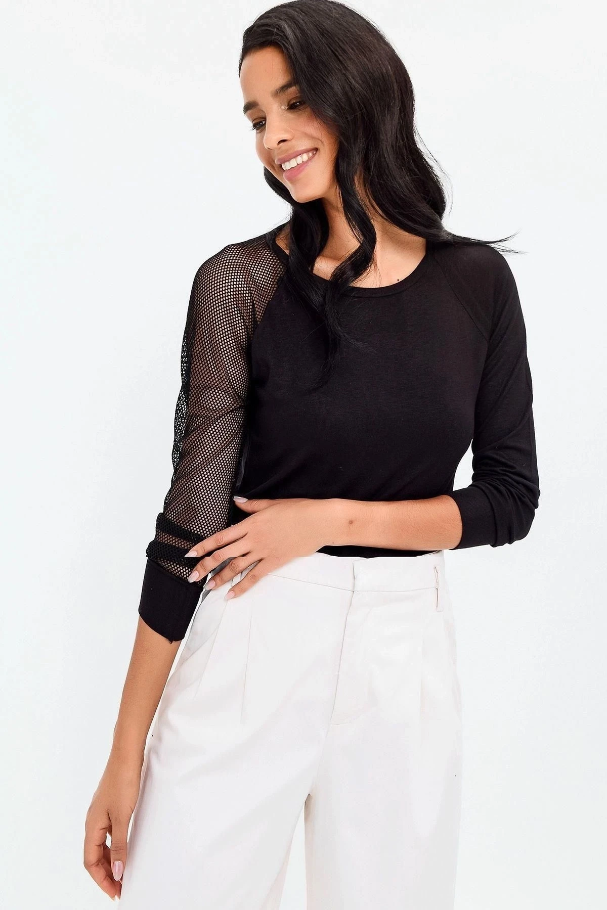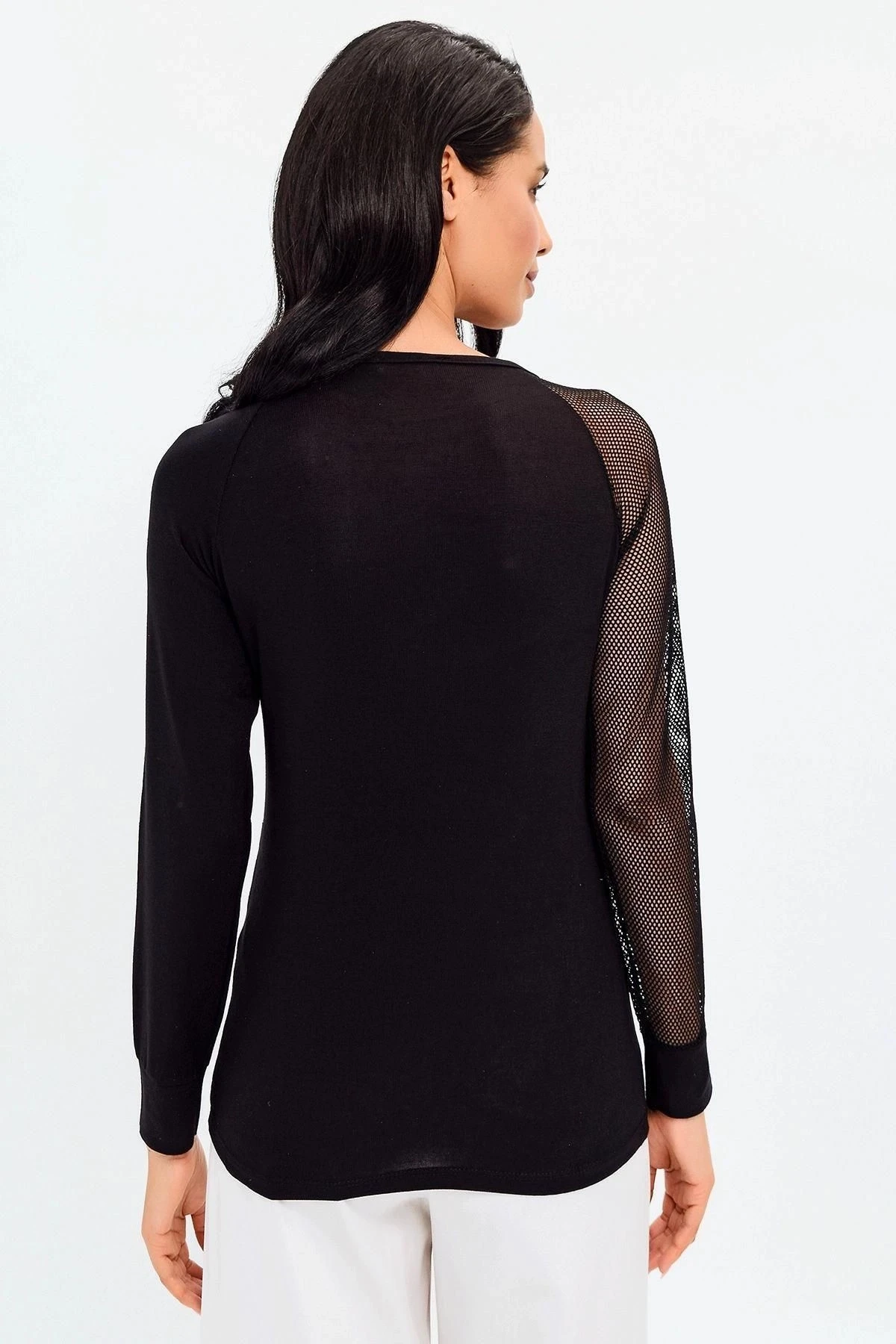 Kadın Siyah Yuvarlak Yaka Tül Detaylı Bluz - Uzun Kol tül detaylı Düz Kesim standart boy