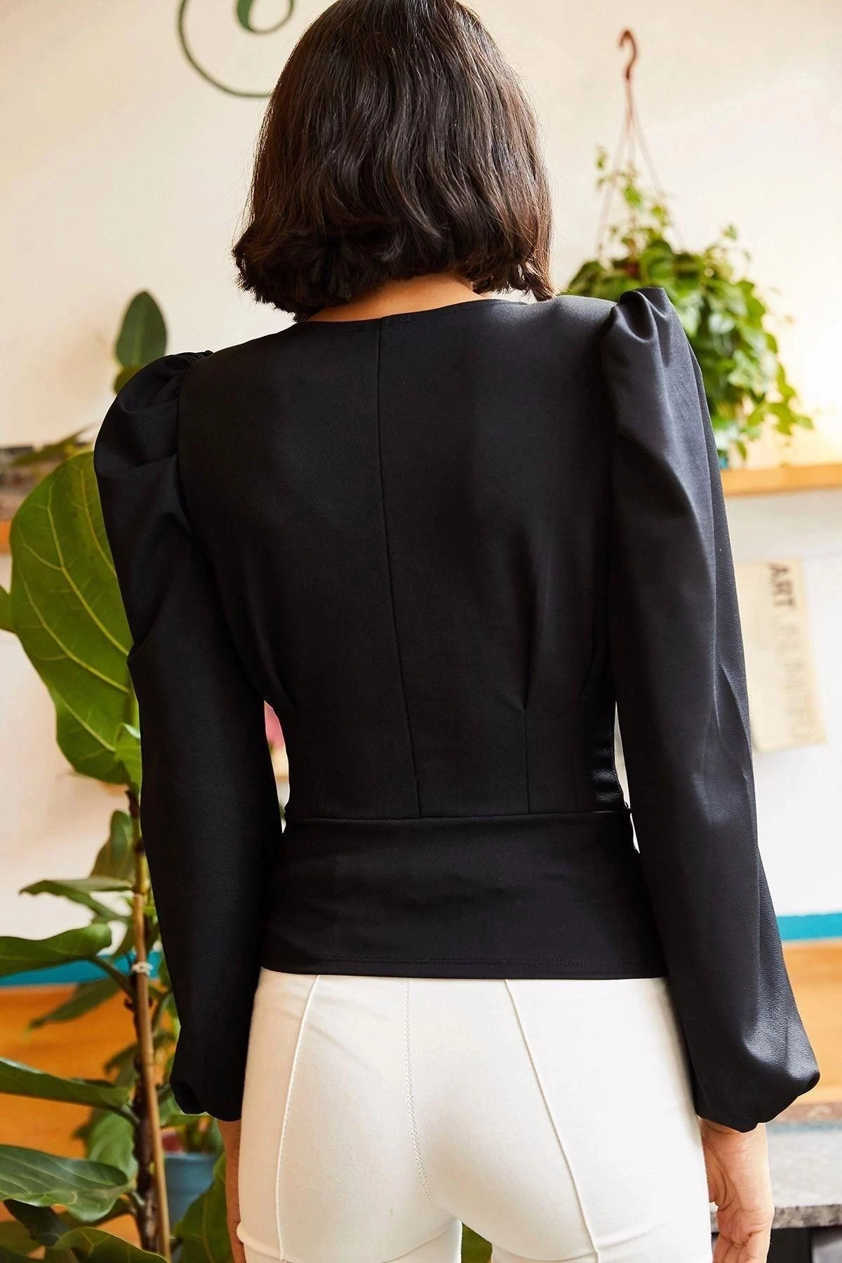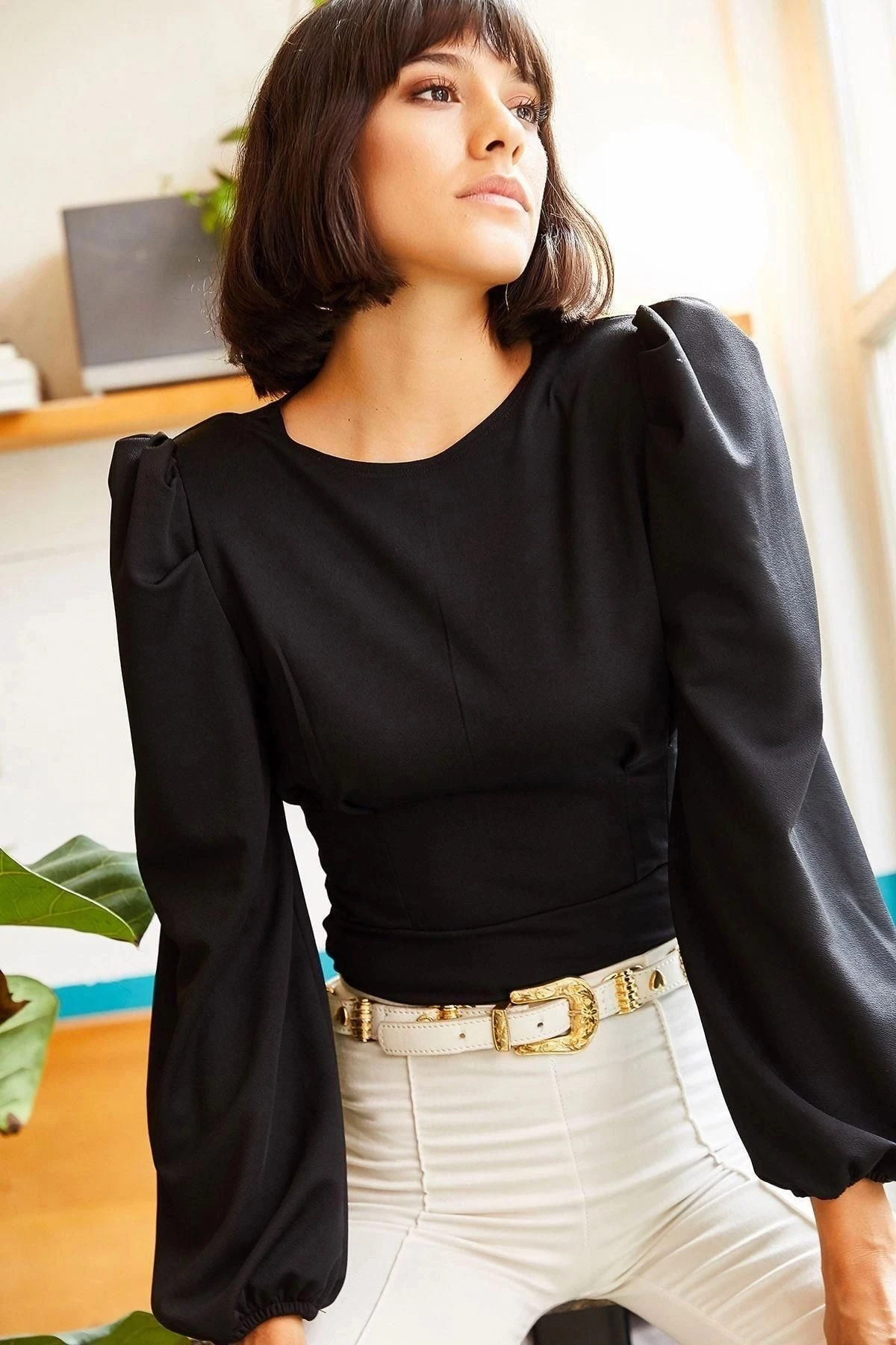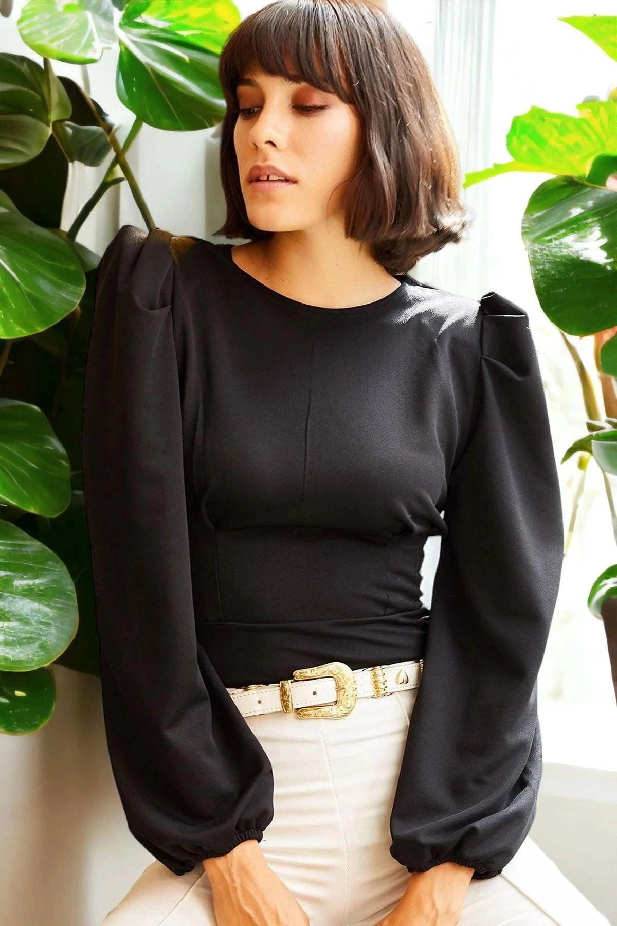 Bu kısa süreliğine Bluz, her gardırobun vazgeçilmez parçası olmaya aday! Siyah renkteki bu bluz, modern bir tarzı yansıtırken aynı zamanda klasik ve zarif bir görünüm sunuyor.; Yuvarlak yakası ve uzun kolları sayesinde rahat bir kullanım sunarken, drapeli omuz detaylarıyla da dikkatleri üzerinize çekiyor.; Kumaş içeriği %95 viskoz ve %5 elastan olan bu bluz, mükemmel bir uyum ve hareket özgürlüğü sağlar.; Viskoz, yumuşak ve hafif dokusuyla cildinize nazik bir şekilde temas ederken elastan, esneklik katıp konforlu bir giyim deneyimi sunar.; Bluzun regular kesimi ve standart boyu, her bedene uyum sağlamak üzere tasarlanmıştır.; Rahat bir oturuşa sahip olan bluz, vücut hatlarınızı kusursuzca sararken aynı zamanda ferah bir görünüm elde etmenizi sağlar.; Kollarında bulunan lastik detayları ise ekstra bir şıklık katarken, bluzun daha özgün ve feminen bir tarz sergilemesini sağlar.; Bu bluz, her mevsimde ve herhangi bir stil ile mükemmel bir şekilde kombinlenebilir.; Şık bir iş görünümü için kumaş pantolon ve topuklu ayakkabı ile birlikte kullanabilir, ya da günlük bir görünüm için kot pantolon ve spor ayakkabıyla tamamlayabilirsiniz.; Çeşitli aksesuarlarla da kolayca tamamlanabilen bu bluz, gardırobunuzun vazgeçilmez bir parçası olacak.; Kısacası, siyah renkli, yuvarlak yaka, uzun kollu, drapeli omuz detaylı, kolları lastikli, regular kesim ve standart boy bluz, şıklığı ve rahatlığı bir araya getiriyor.; Viskoz ve elastan karışımı kumaşıyla da kullanım kolaylığı sağlayan bu bluz, tarzınızı tamamlayacak mükemmel bir seçimdir.