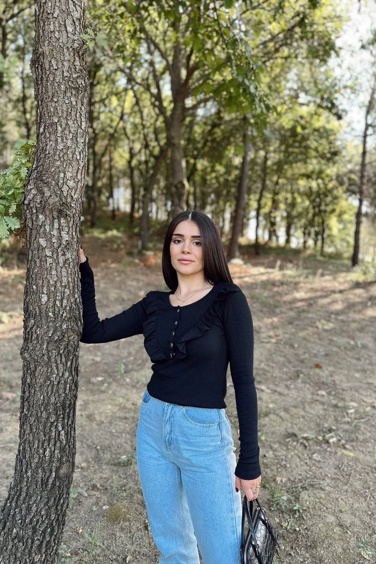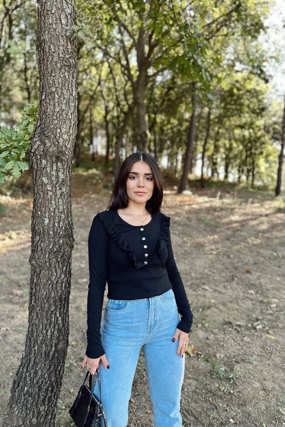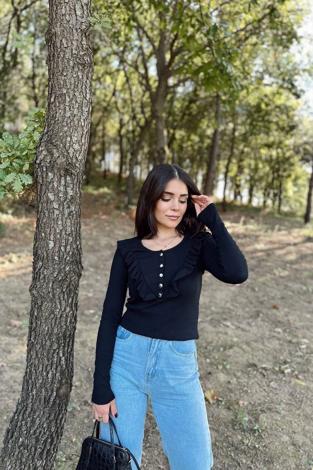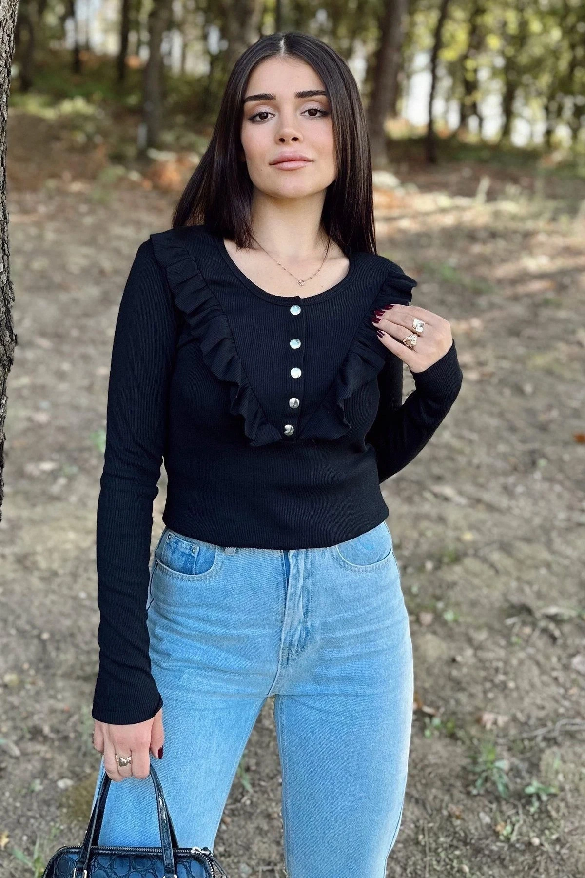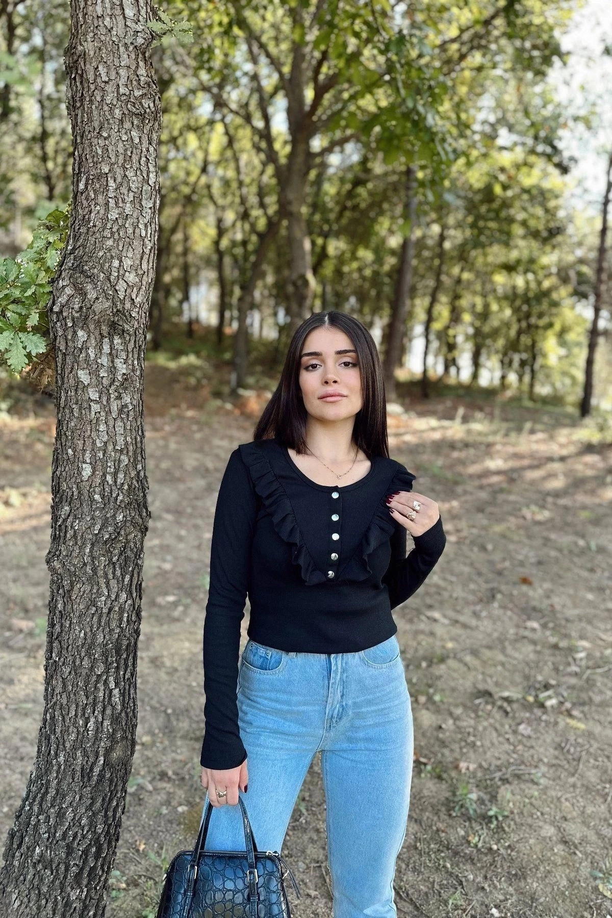Kadın Siyah Yuvarlak Yaka, Uzun Kol, Fırfır Detaylı Yarım Patlı Çıtçıtlı Kaşkorse Bluz