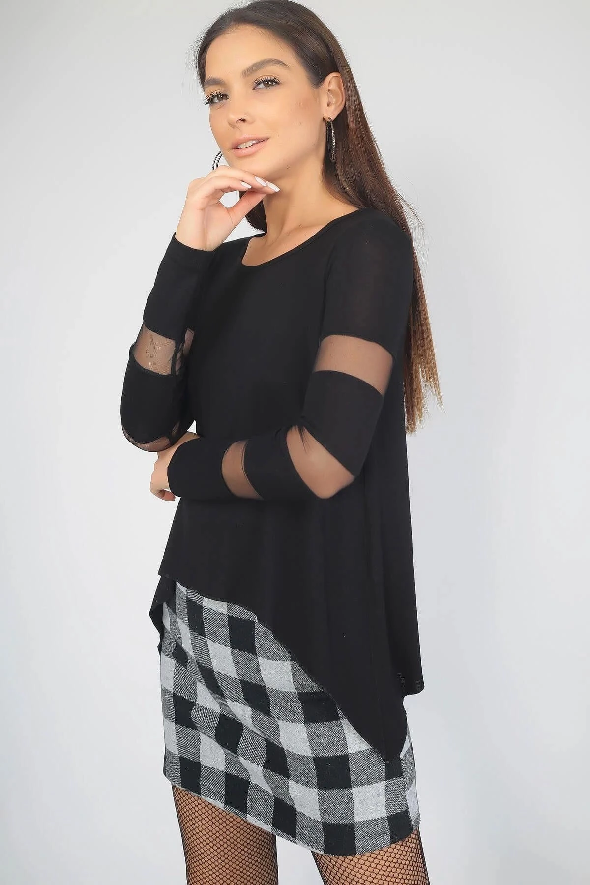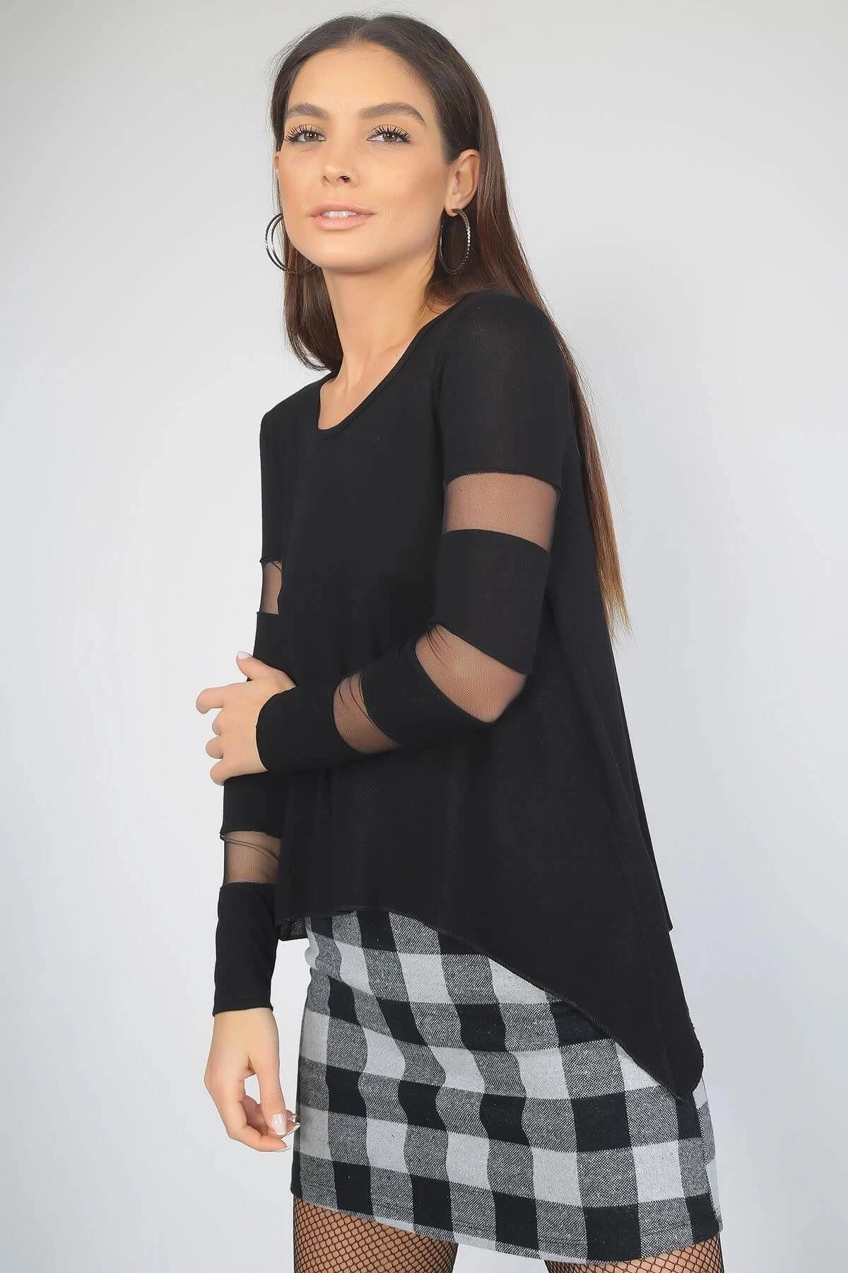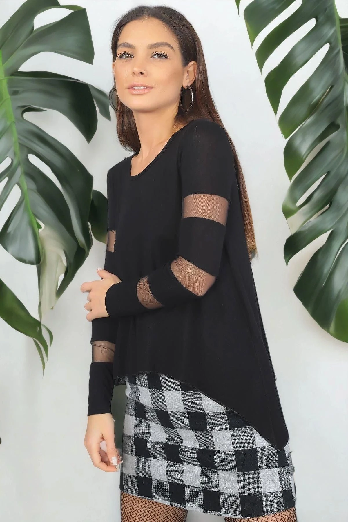 Bu zarif ve şık bluz, mükemmel bir seçenek arayanların beğenisini kazanacak.; Siyah renk, herhangi bir kombinde kullanılabilen klasik bir seçimdir.; Yuvarlak yaka ve uzun kollu tasarımıyla, rahatlık ve tarzı bir araya getiriyor.; Bluzun kollarında bulunan şerit tül detayları, tasarıma sofistike bir dokunuş katıyor.; Bu detaylar, bluza zariflik ve feminenlik katıyor.; Regular kesimi ve standart boyu, her beden için mükemmel bir uyum sağlıyor.; Kumaş içeriği, %95 polyester ve %5 elastandır.; Bu kombinasyon, bluza esneklik ve dayanıklılık katıyor.; Polyester, kırışıklıklara karşı dirençli olup, bluzunuzun her zaman kusursuz görünmesini sağlar.; Elastan, bluzun rahat bir şekilde vücudunuza uyum sağlamasına yardımcı olur.; Bu bluz, herhangi bir mekanda şıklık ve tarz arayanlar için mükemmel bir seçenek.; Şık tasarımı, dikkat çekici tül detayları ve rahat kesimiyle, gardırobunuzda özel bir yere sahip olacak.; Kombinleyeceğiniz farklı parçalarla farklı tarzlara bürünebilir ve her zaman şık görünebilirsiniz.