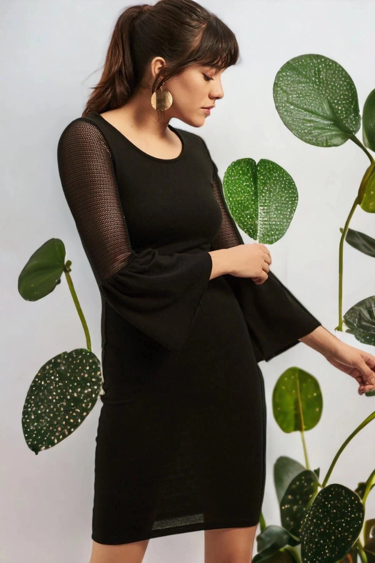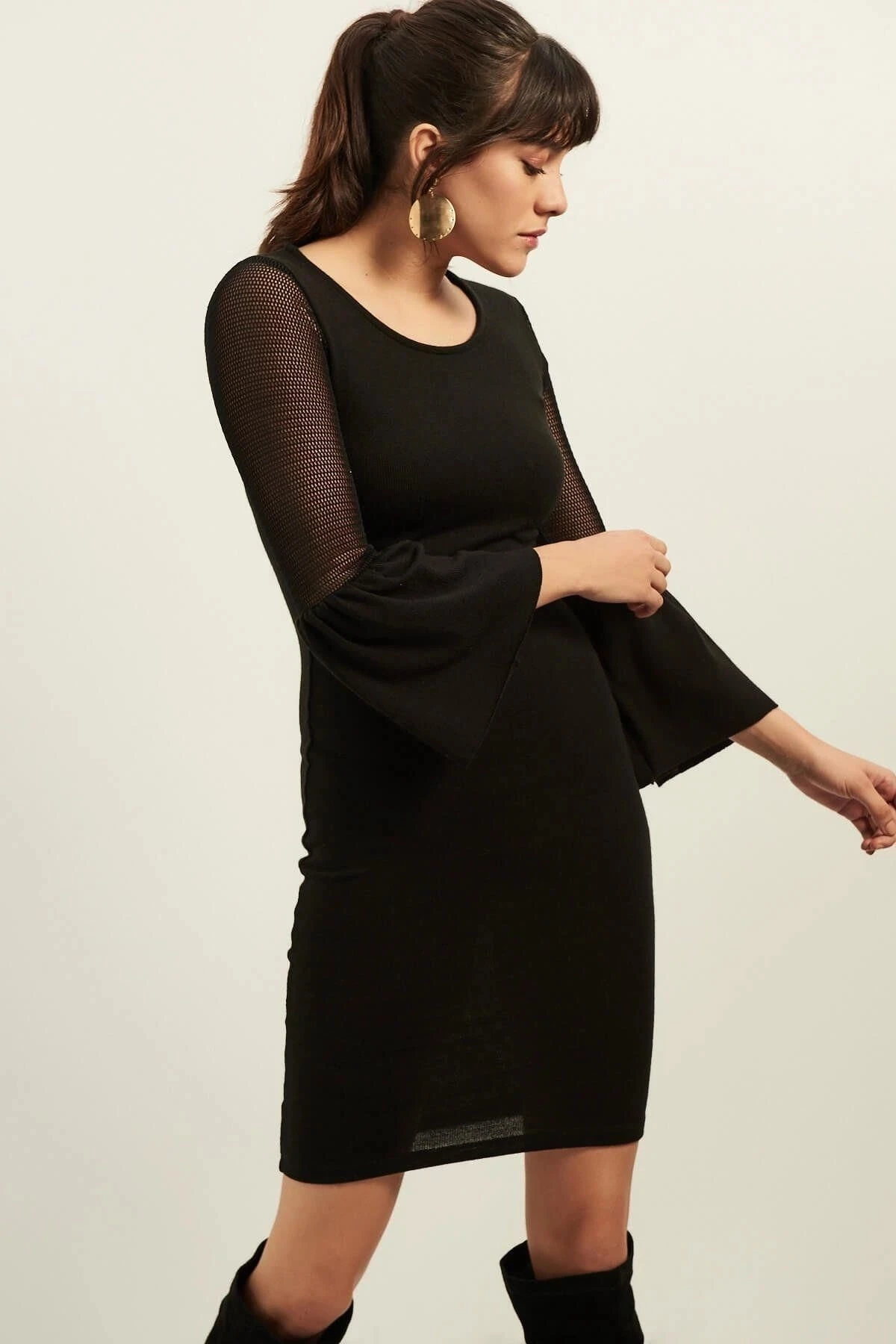 Bu şık ve zarif elbise, siyah renkte ve yuvarlak yaka tasarıma sahiptir.; Uzun kollu ve volan detaylarıyla hareketlendirilen bu elbise, kadınsı bir görünüm sağlar.; Tül garnili yumuşak dokulu kaliteli kumaş kullanılarak üretilmiştir, böylece giyen kişiye maksimum konfor sağlar.; Bu düz kesimli midi boy elbise, diz üstü uzunluğuyla ofis ortamında ve günlük hayatta şık bir seçenek sunar.; %95 polyester ve %5 elastan kumaş içeriği, dayanıklılık ve esneklik sunar, böylece elbise uzun süre boyunca formunu korur.; Siyah rengi, her türlü duruma uyum sağlayabilen bir klasik olarak bilinir ve aynı zamanda incelik ve zarafetin sembolüdür.; Bu elbise, siyahın gücünü ve sofistike görünümünü yansıtır.; Yuvarlak yaka tasarımı, boyun bölgesindeki zarif bir detaydır ve elbisenin üzerine takacağınız şık bir kolyeyle tamamlanabilir.; Uzun kollar, sıcak tutmanın yanı sıra elbiseye biraz gizemli bir hava katar.; Elbisenin volan detayları, hareket ve romantizm katmanı oluşturur.; Bu zarif dokunuş, elbisenin etek kısmına hareketlilik ve hafif bir dokunuş getirir.; Tül garnili yumuşak dokulu kumaş, elbisenin lüks ve kadınsı bir his yaratmasını sağlar.; Bu kaliteli kumaş, giyildiğinde pürüzsüz bir doku sunar ve vücut hatlarını hoş bir şekilde kucaklar.; Düz kesimli midi boy elbise, her vücut şekline uyum sağlayan bir kesime sahiptir.; Midi boyu, modern ve zarif bir stil sunarken diz üstü uzunluğu, hem formel ortamlarda hem de günlük hayatta rahat bir kullanım sağlar.; Bu elbise, ofis ortamında profesyonel bir görünüm elde etmek için mükemmel bir seçenektir.; Aynı zamanda günlük hayatta da kullanılabilir ve farklı kombinasyonlarla tarzınızı yansıtmanızı sağlar.; Bu ürün, %95 polyester ve %5 elastan içeriğiyle kolay bakım sağlar.; Yıkandıktan sonra bile formunu koruyarak uzun ömürlü bir kullanım sunar.; Bu siyah renkli, yuvarlak yaka, uzun kol, volan detaylı, tül garnili ve kaliteli kumaşa sahip midi boy elbise, zarif ve modern bir tarz arayan kadınlar için mükemmel bir seçimdir.