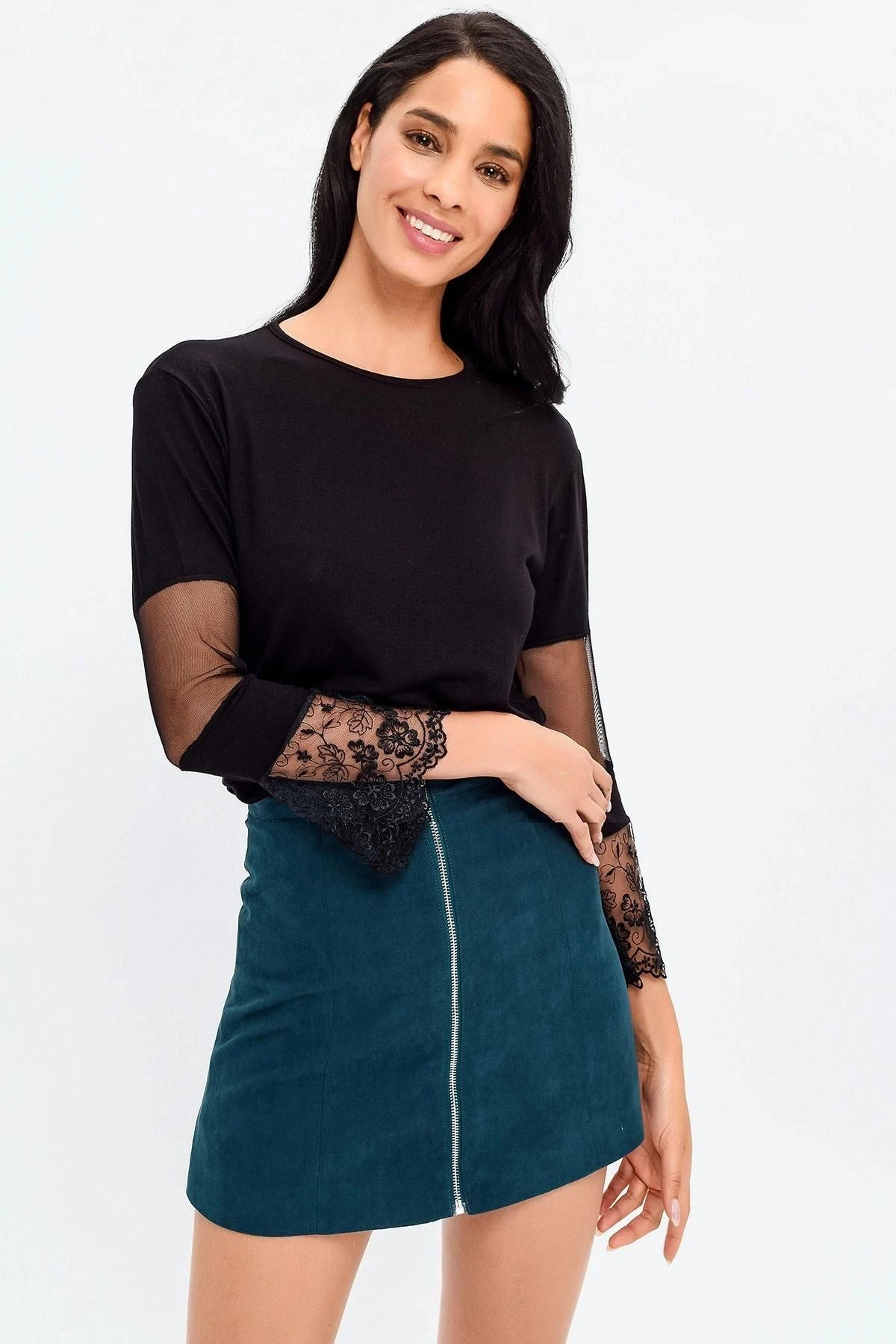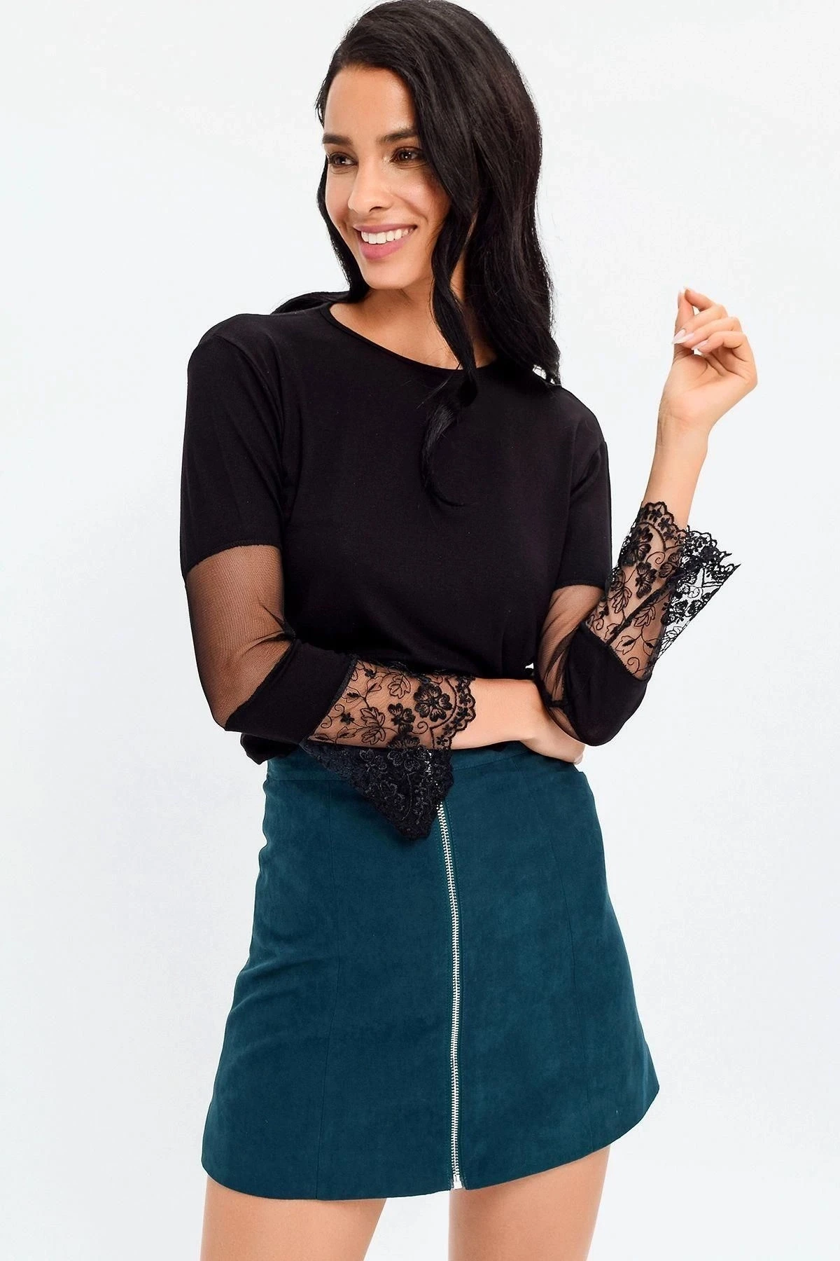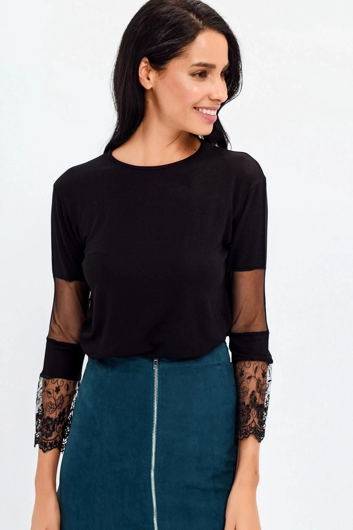 Kadın Siyah Yuvarlak Yaka, Viskon Kolları, Tül Dantel Detaylı, Uzun Kollu Bluz