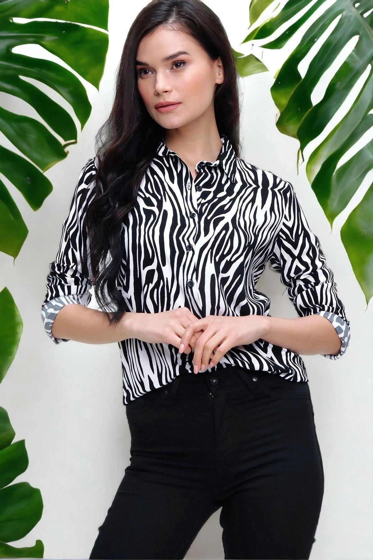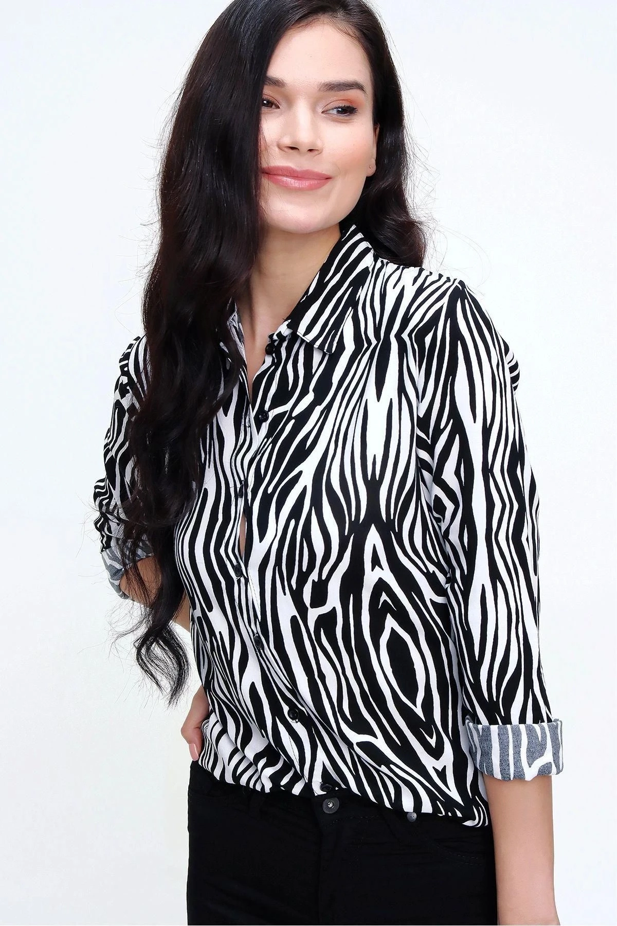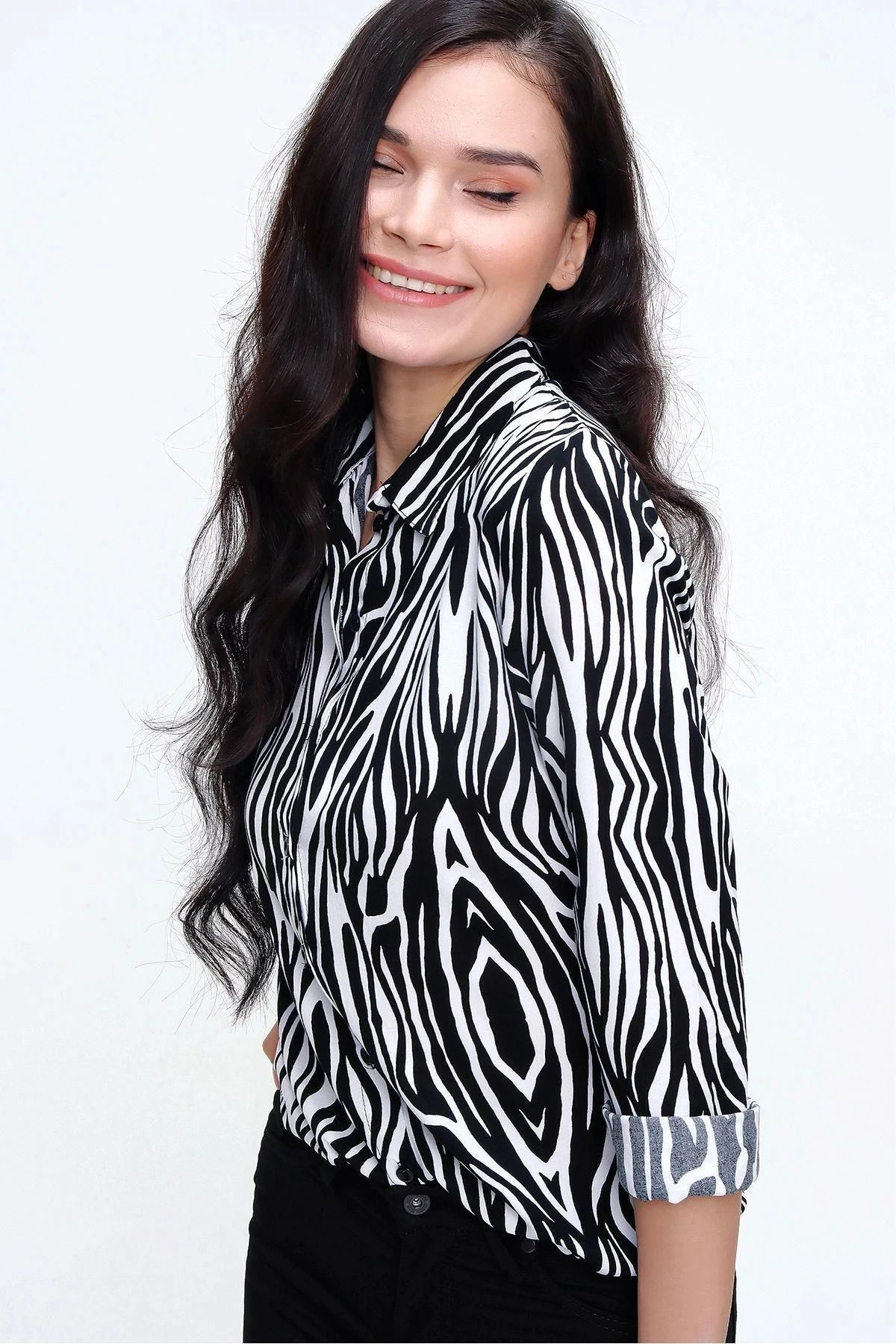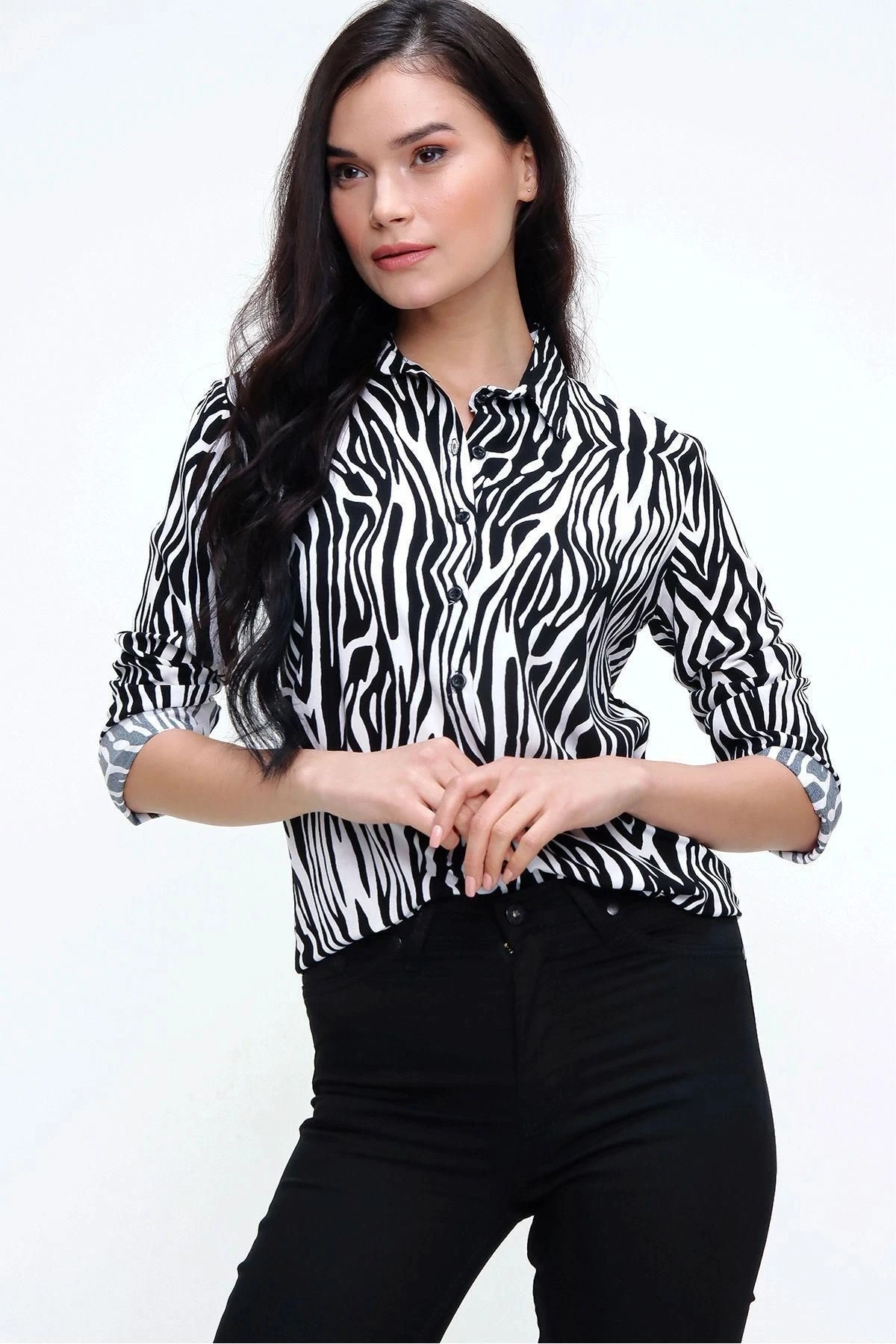 Kadın Siyah Zebra Desenli Klasik Yaka Uzun Kol Gömlek, Regular Kesim ve Standart Boy