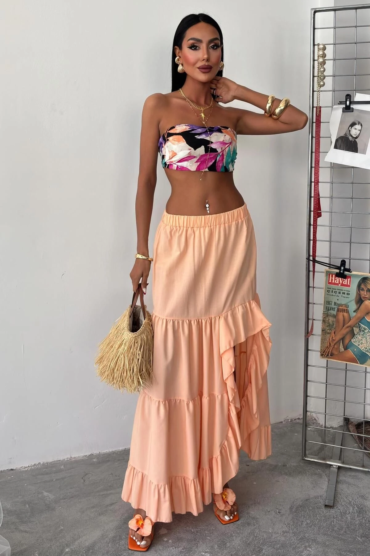 Kadın Somon Dokuma Uzun Yırtmaçlı Etek