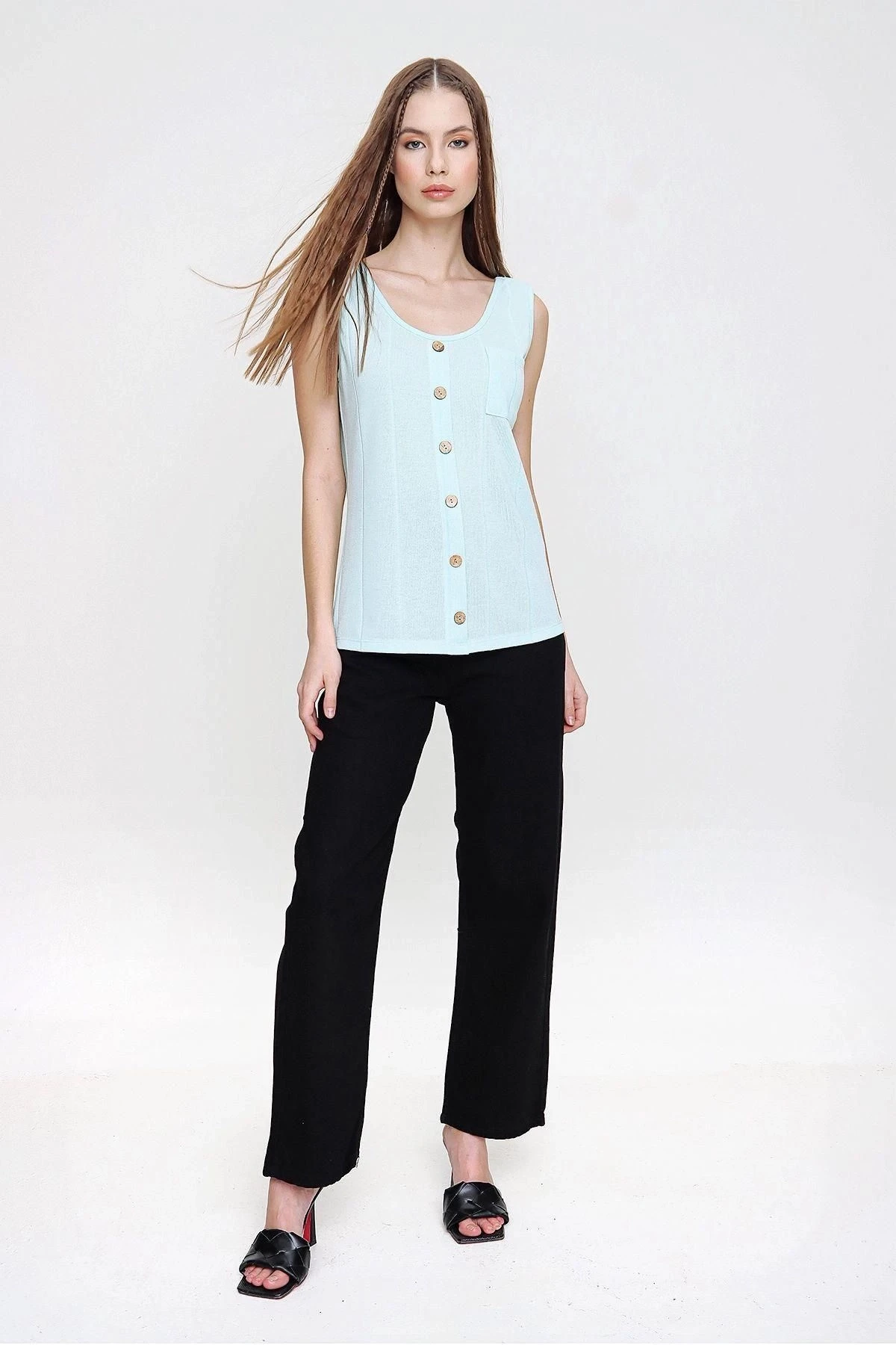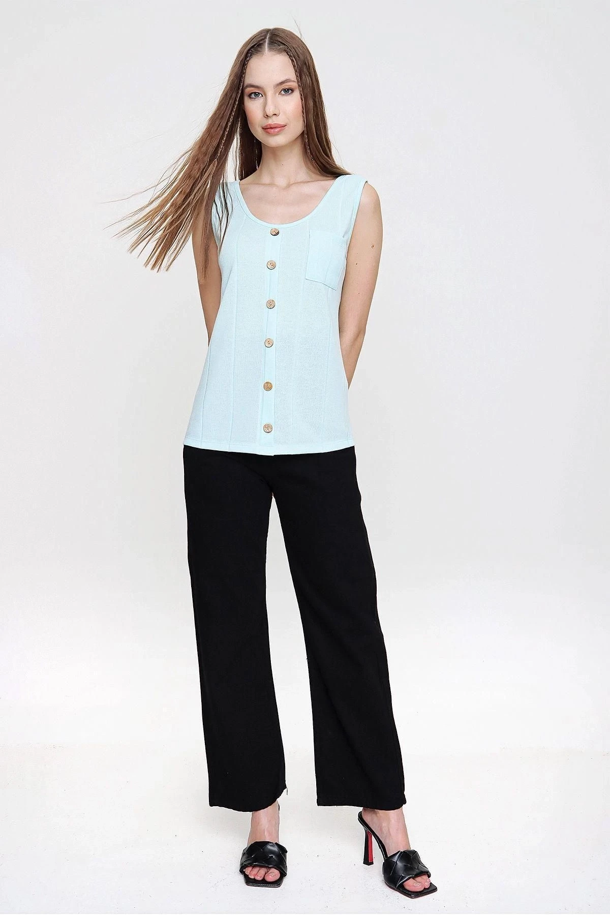Kadın Su Mavisi Sıfır Kol detaylı Regular Kesim Standart Boy Askılı Düğmeli İnce Örme Triko Bluz