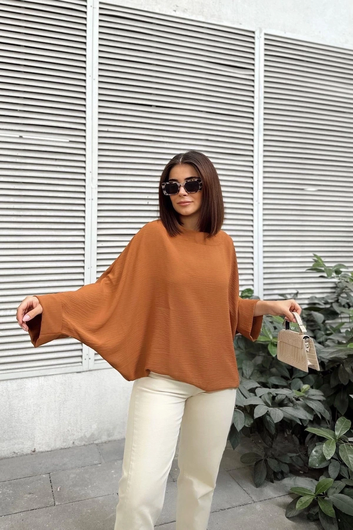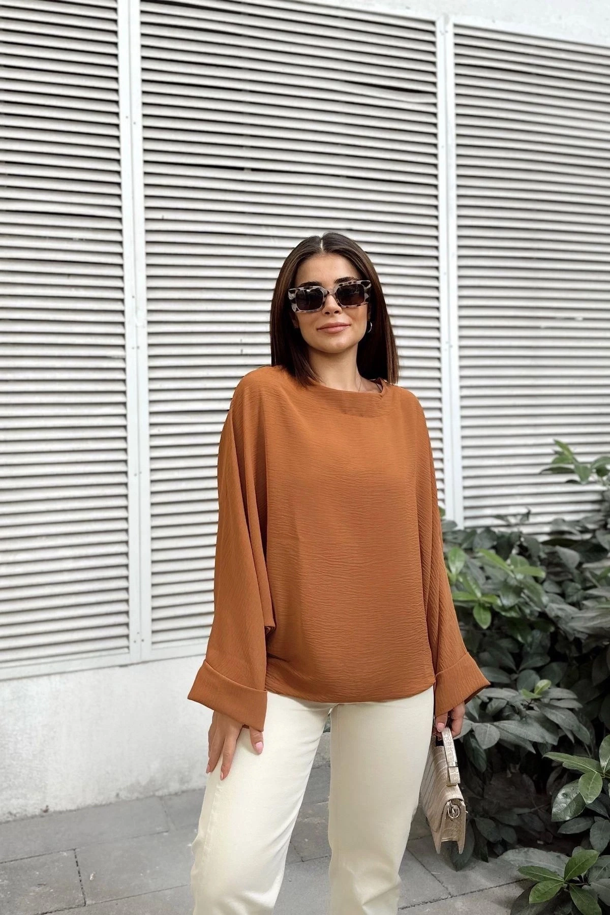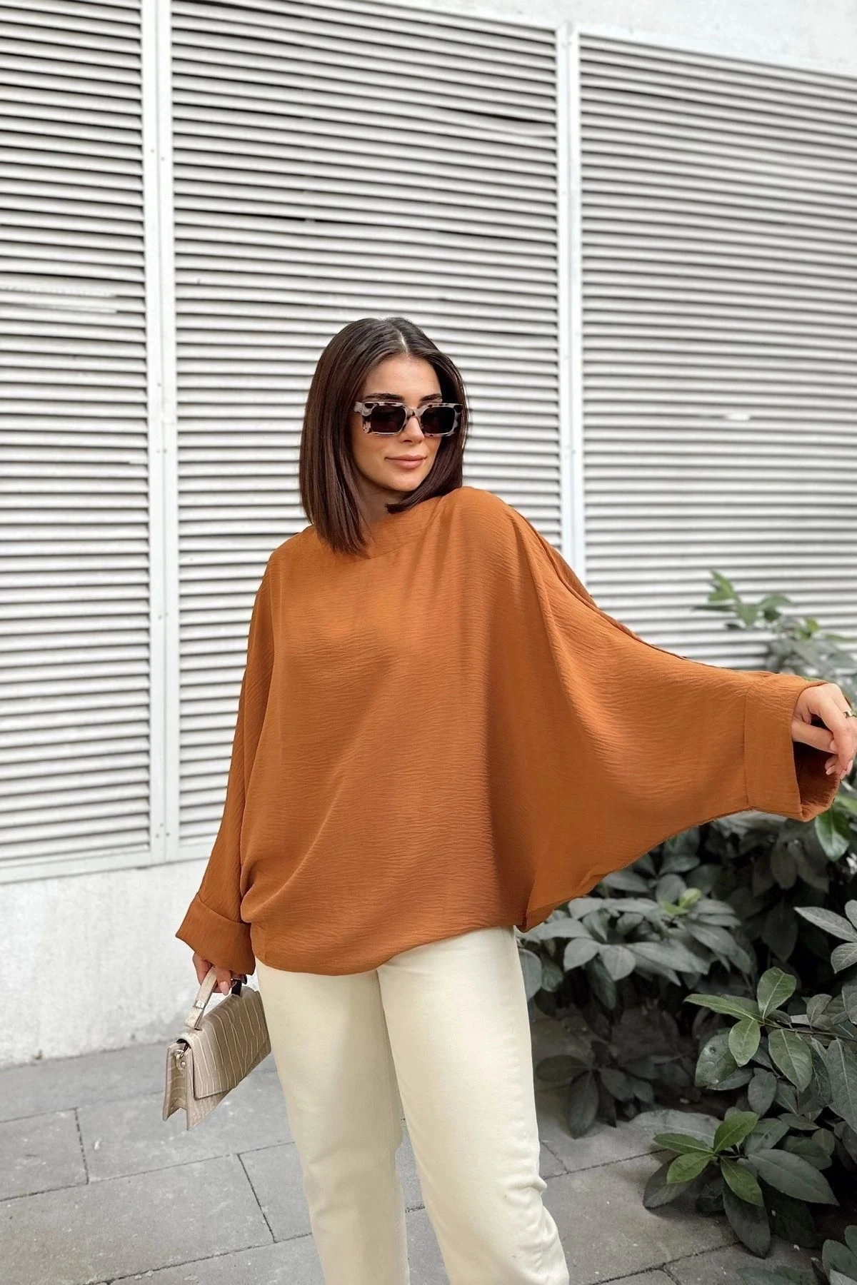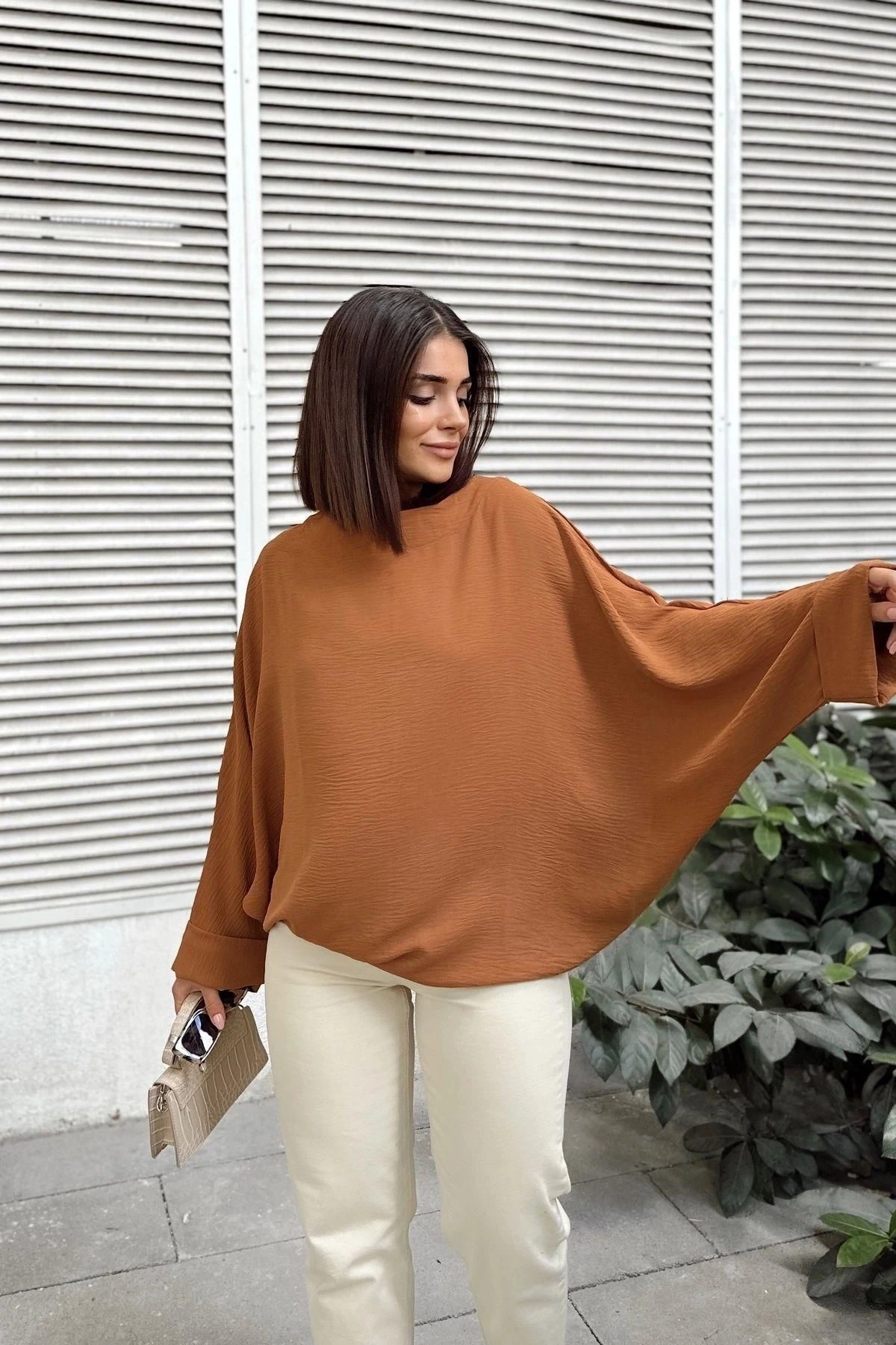 Kadın Taba Airobin Yarasa Duble Kol Salaş Bluz Ekstra Oversize Yuvarlak Yaka - Tesettüre Uygun