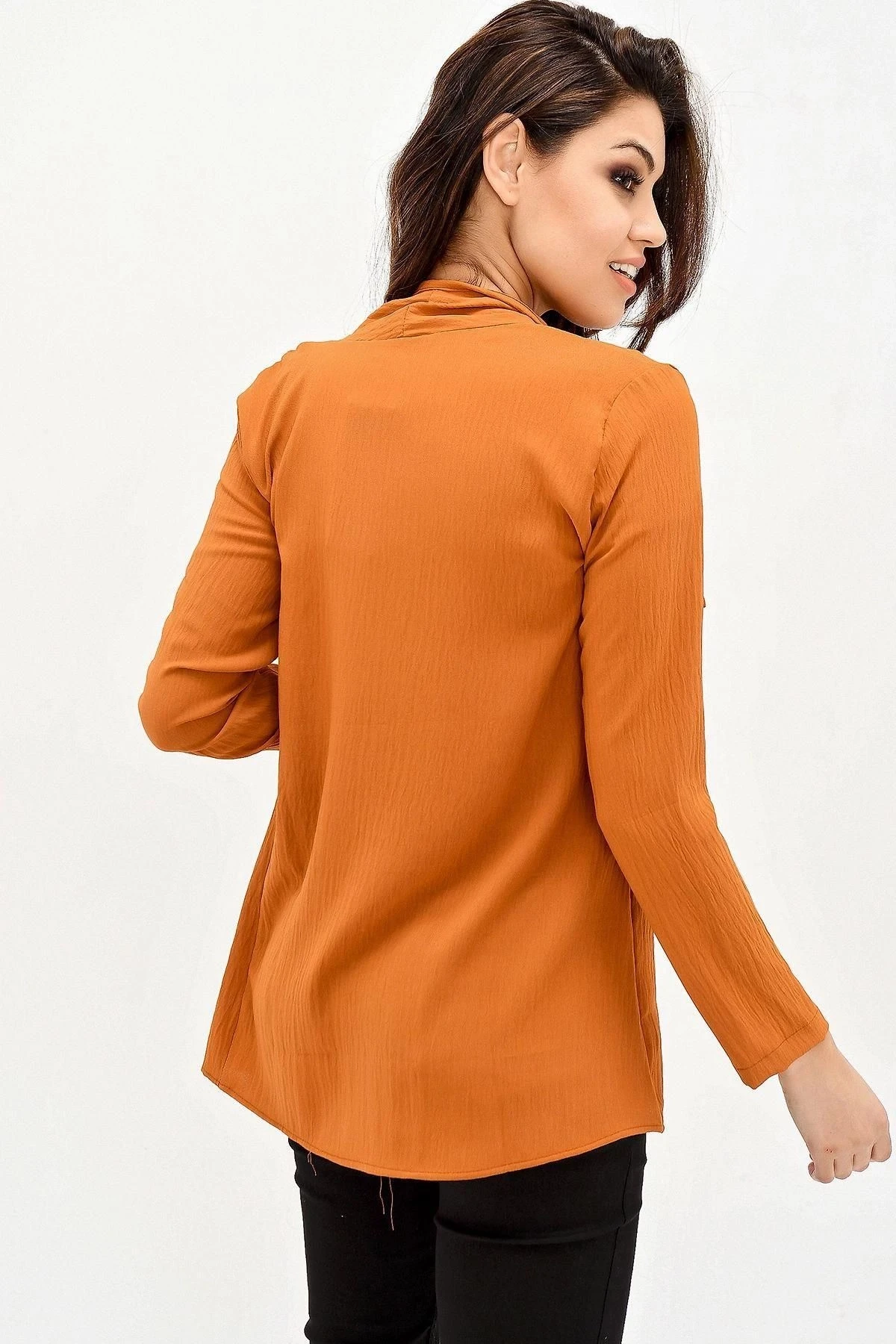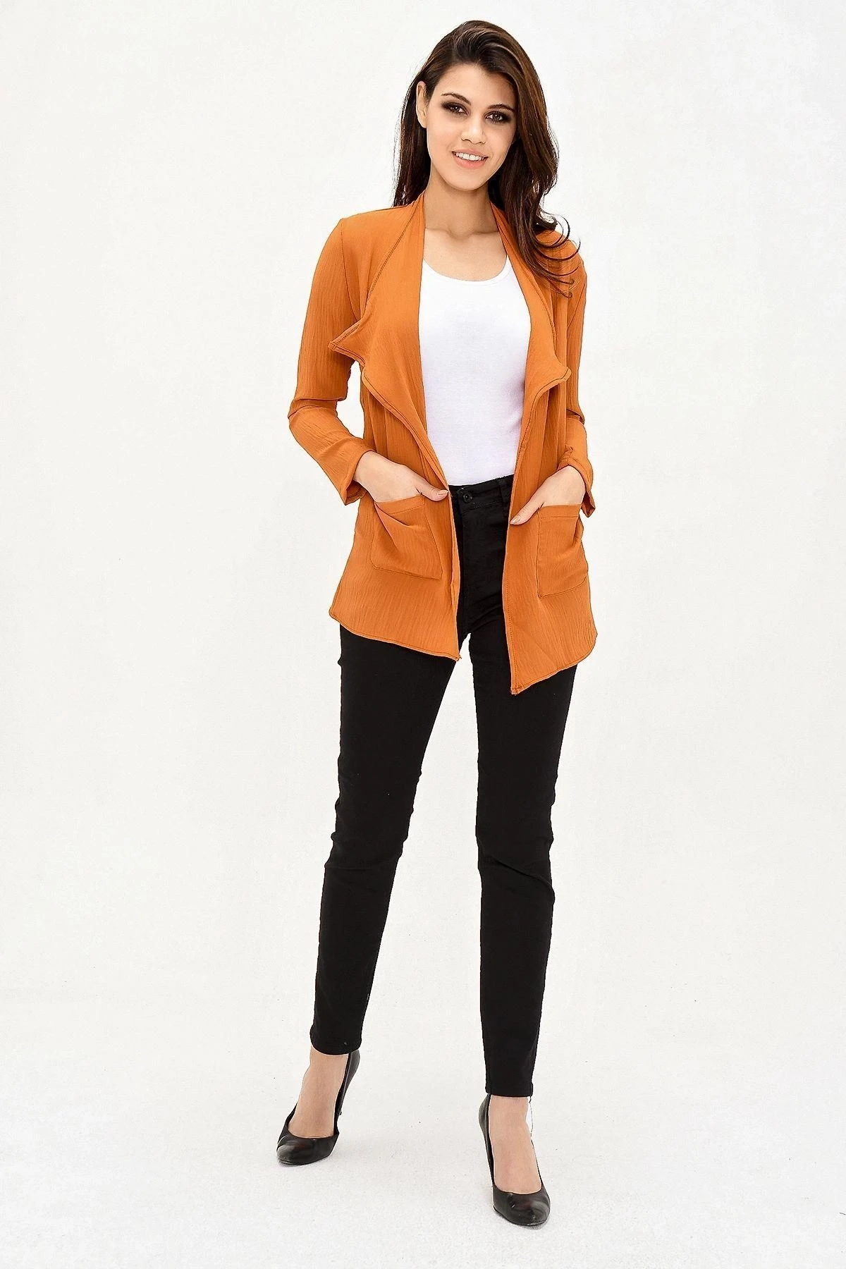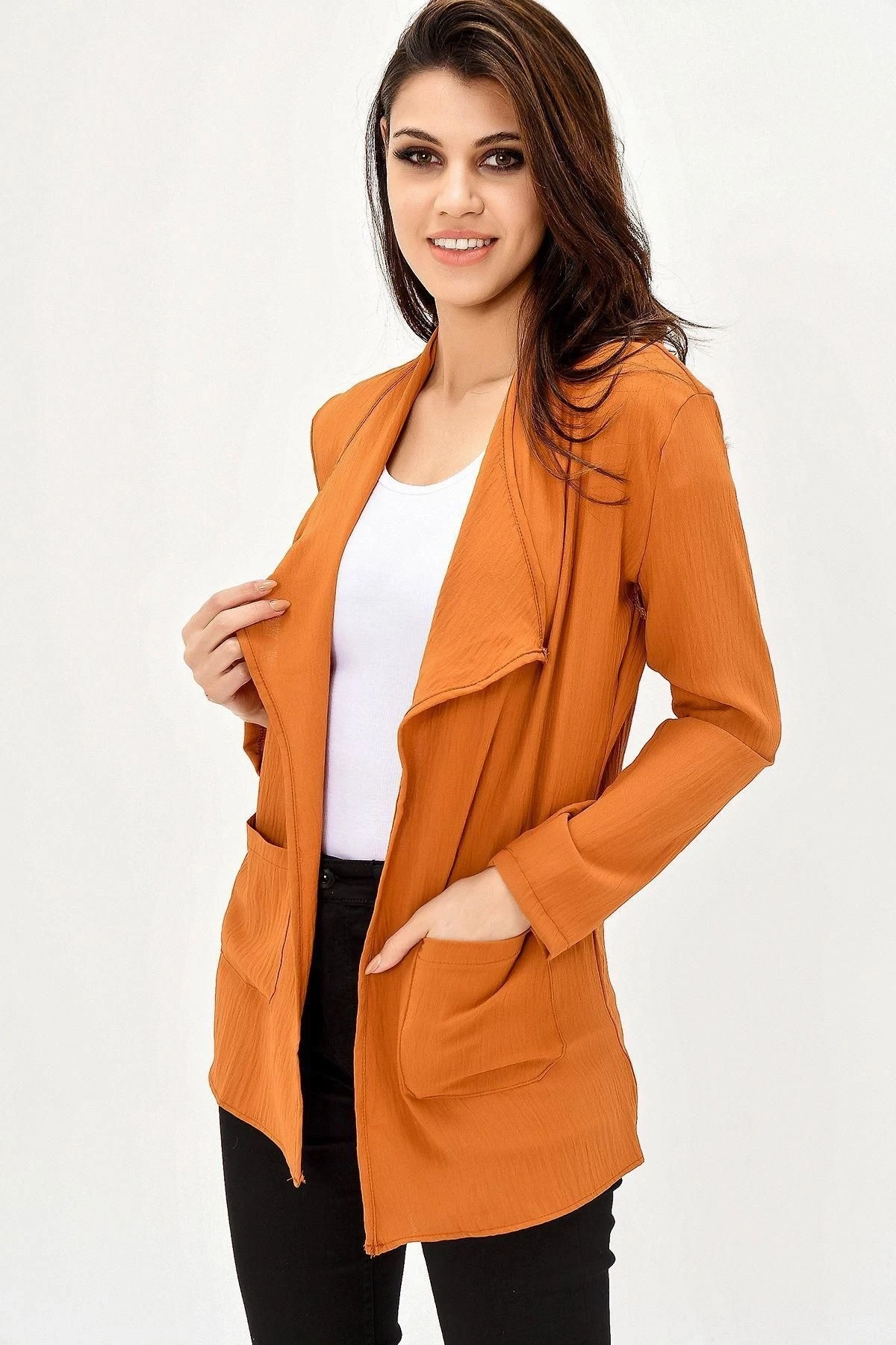 Kadın Taba Şal Yaka, Uzun Kol Cep Detaylı, Regular Kesim Ceket Standart Boy - Tesettüre Uygun