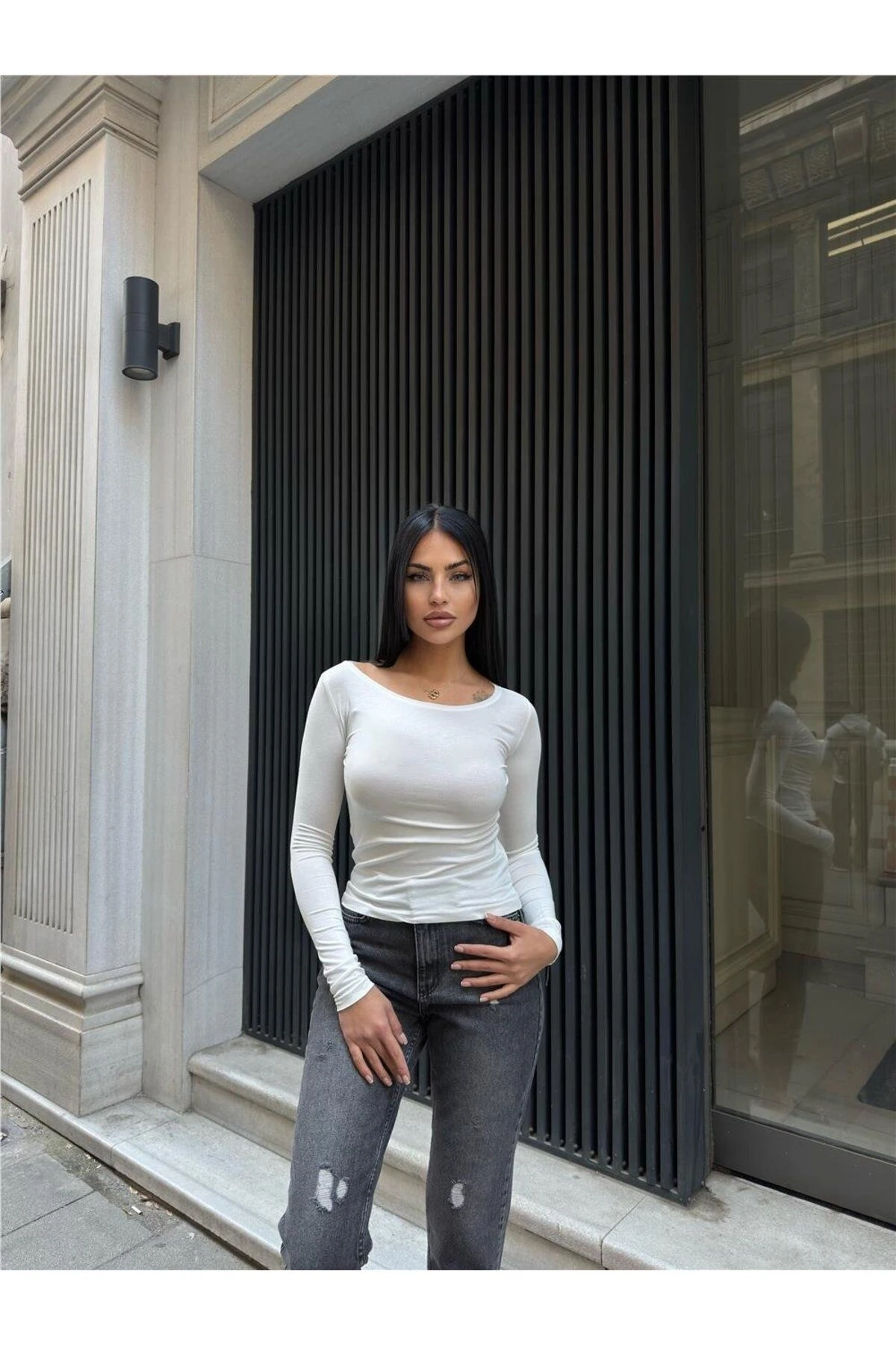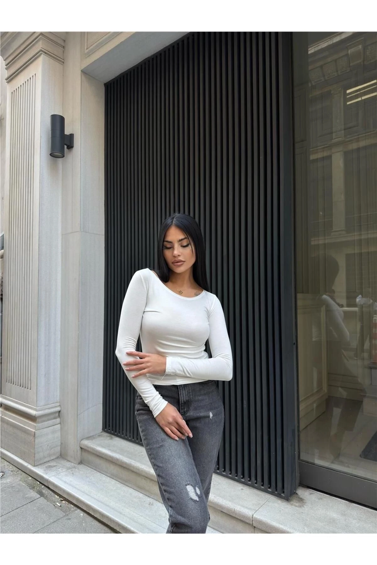 Kadın Taş Bisiklet Yaka Uzun Kollu Parmak Geçmeli Viskon Badi Tişört