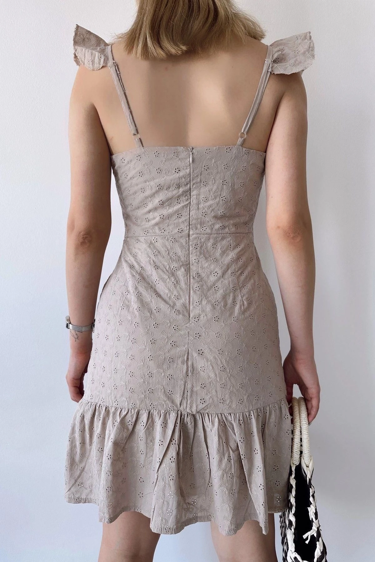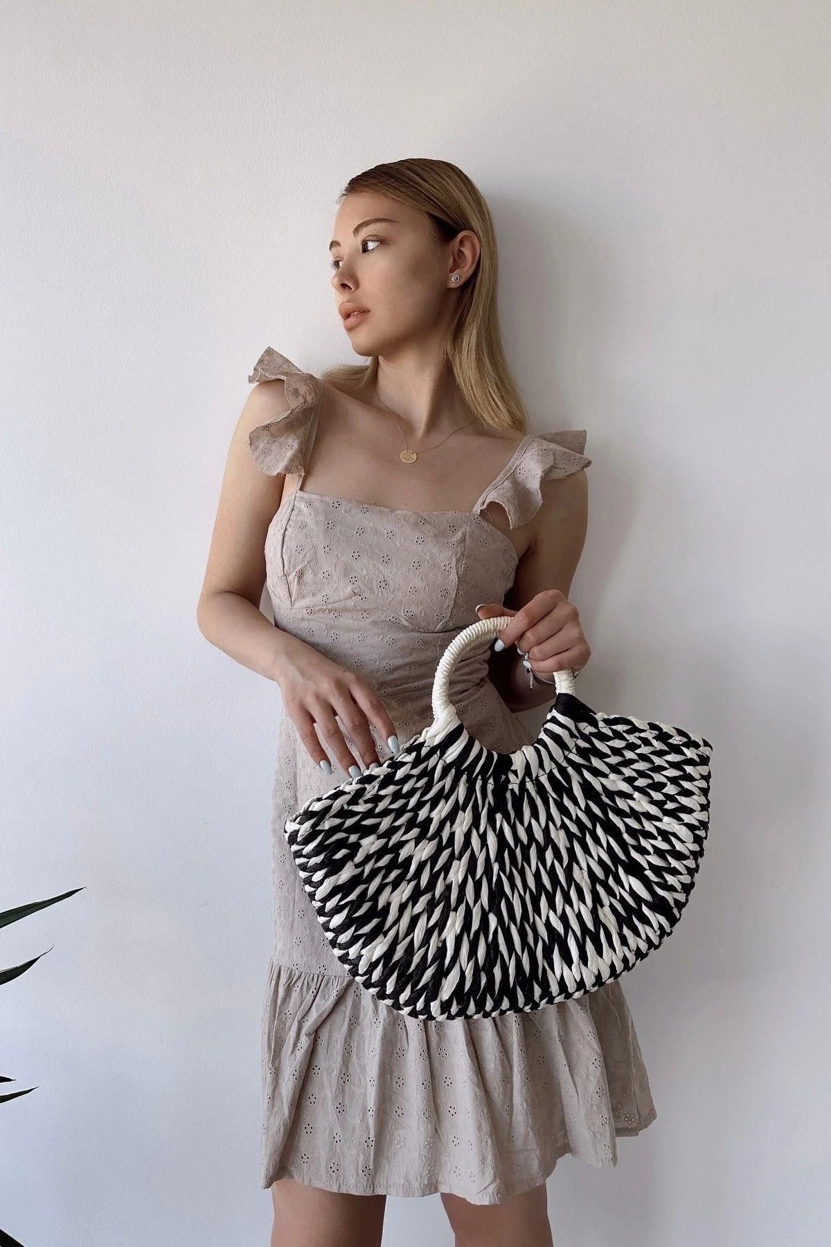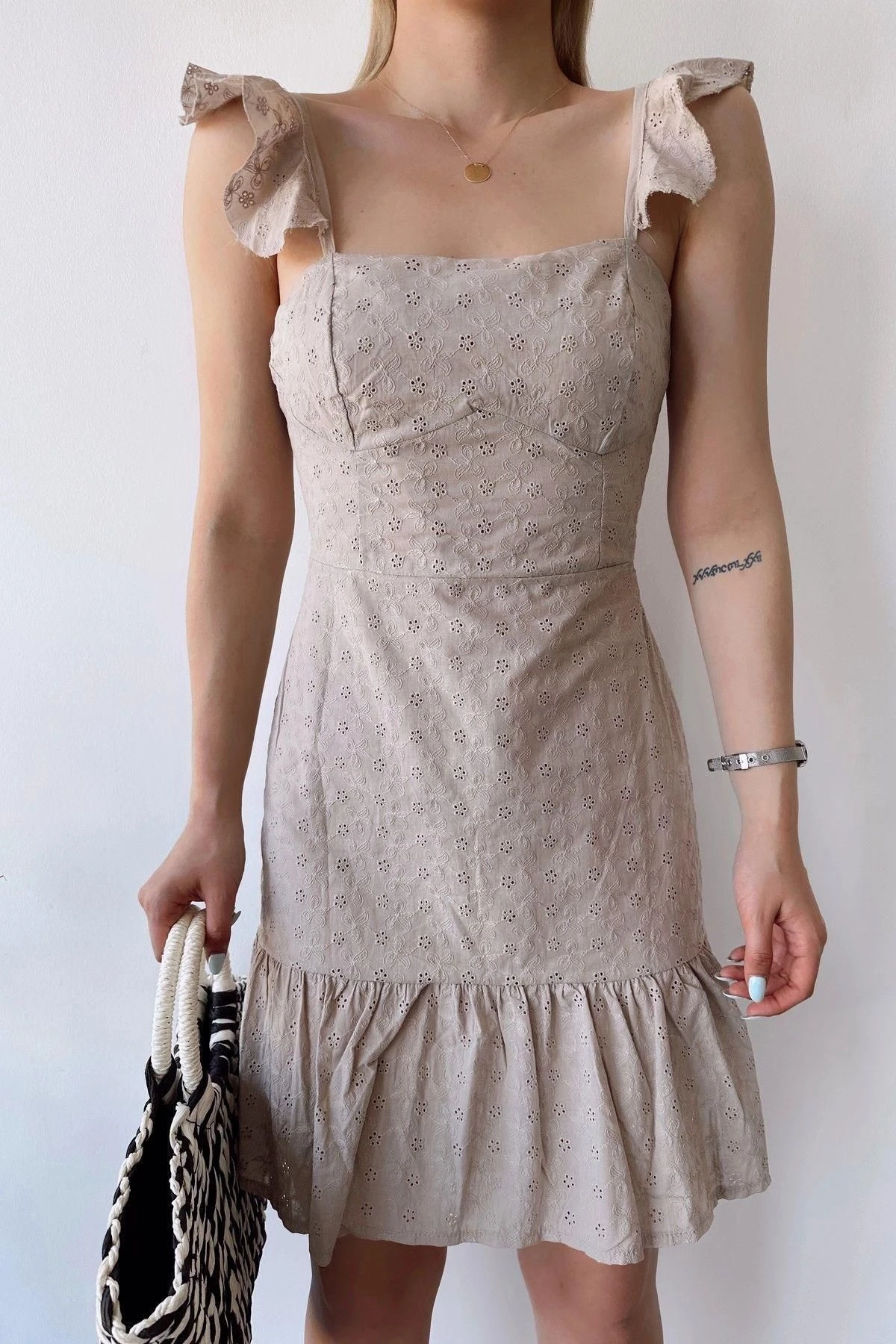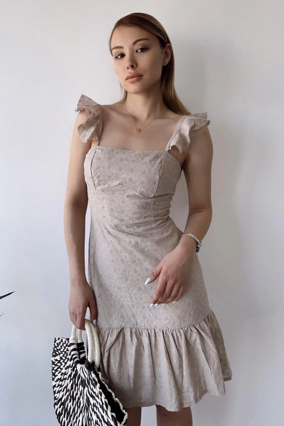 Bu kadın taş rengi ince askılı kare yaka dantel/güpür desenli A-line kalıp/kesim midi fisto elbise, zarafeti ve feminenliği bir araya getiriyor.; Elbisenin kumaşı %53 polyester ve %47 pamuk içeriğe sahiptir, bu da hem dayanıklılık hem de rahatlık sağlar.; İnce askılı tasarım, omuzları güzel bir şekilde ortaya çıkarır ve yaz aylarında serinlik sağlar.; Kare yaka, modern ve zarif bir görünüm sunar, aynı zamanda dantel/güpür desen detaylarıyla da dikkat çeker.; A-line kalıp/kesim, bel bölgesinden aşağı doğru genişleyen bir siluet oluşturur.; Bu kesim, vücuda hoş bir şekilde oturur ve kadınsı bir siluet yaratır.; Ayrıca, hareket özgürlüğü sunar ve rahat bir giyim deneyimi sağlar.; Midi boyu, diz üzerine kadar uzanan bir uzunlukta olup, hem gündüz hem de gece etkinlikleri için mükemmel bir seçenektir.; Bu uzunluk, zarif bir görünüm sağlarken aynı zamanda rahatlık sunar.; Fisto kumaş, hafif ve akıcı bir dokuya sahiptir.; Bu sayede elbise, rahatlıkla giyilebilir ve hareket özgürlüğü sağlar.; Aynı zamanda, dantel/güpür desen detaylarıyla da şıklığı artırır.; Bu taş rengi ince askılı kare yaka dantel/güpür desenli A-line kalıp/kesim midi fisto elbise, şıklık ve rahatlığı bir araya getirir.; %53 polyester ve %47 pamuk kumaş içeriği, dayanıklılık ve konfor sağlar.; İnce askılı tasarım omuzları güzel bir şekilde ortaya çıkarırken kare yaka modern bir görünüm sunar.; A-line kalıp/kesim beli vurgular ve kadınsı bir siluet oluşturur.; Midi boyu hem gündüz hem de gece etkinlikleri için uygundur.; Fisto kumaş hafif ve akıcıdır, hareket özgürlüğü sağlar ve dantel/güpür desen detaylarıyla şıklığı artırır.; Bu elbise, özel anlarınızda size zarif bir görünüm kazandıracak harika bir seçenektir.