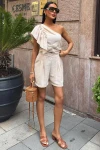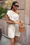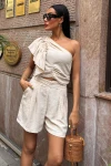 Kadın Taş Keten Tek Omuz Fırfırlı Asimetrik Takım