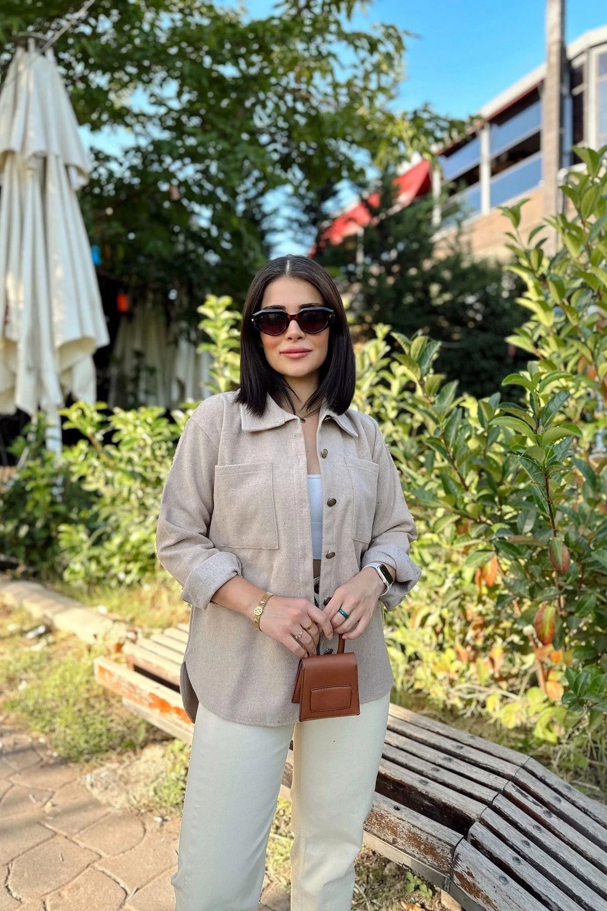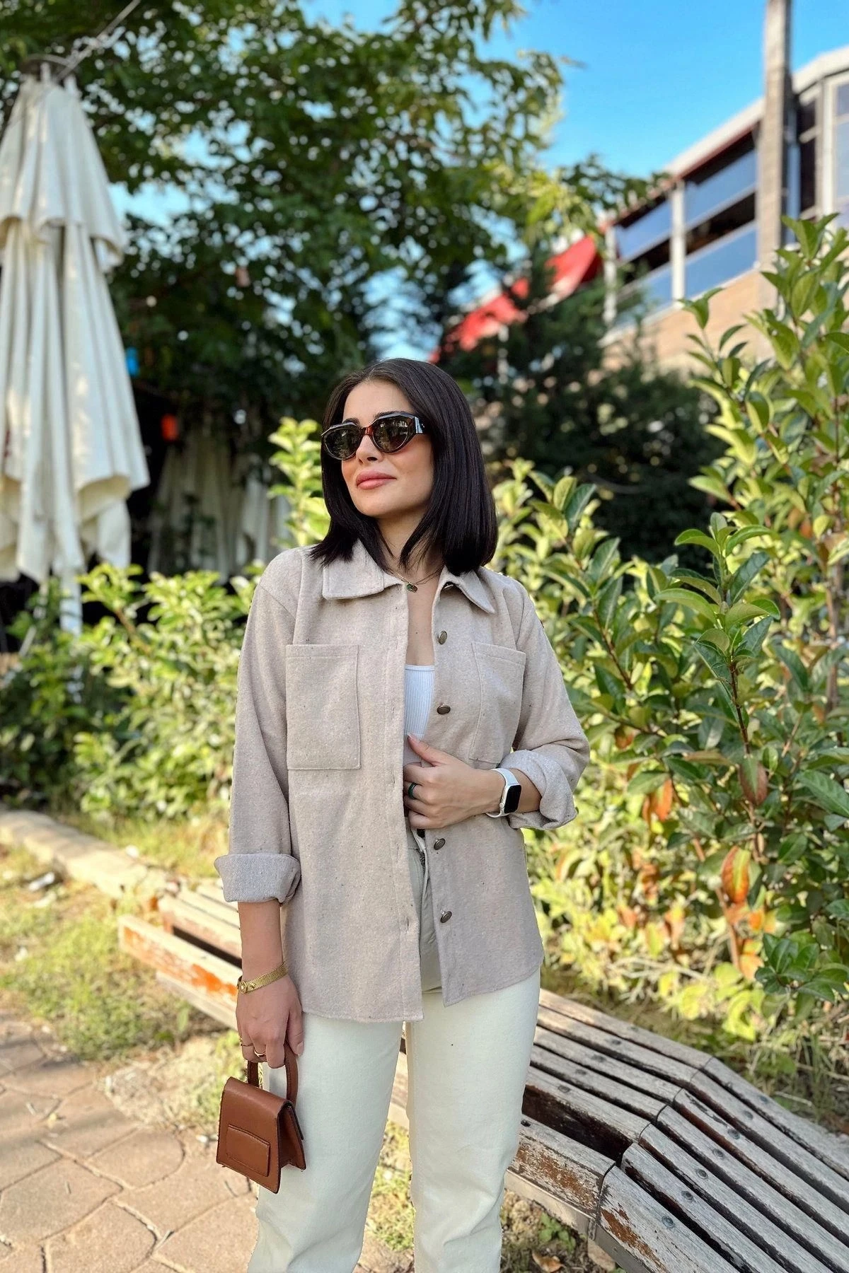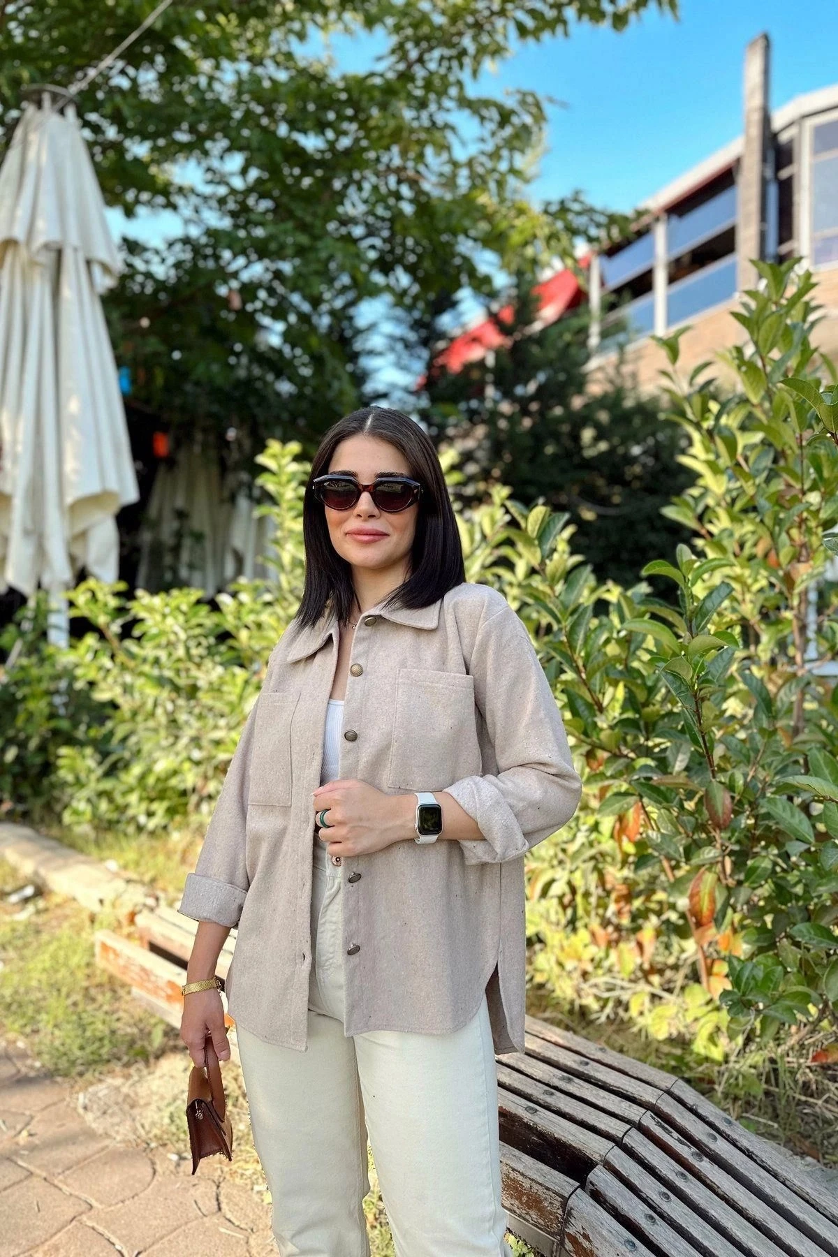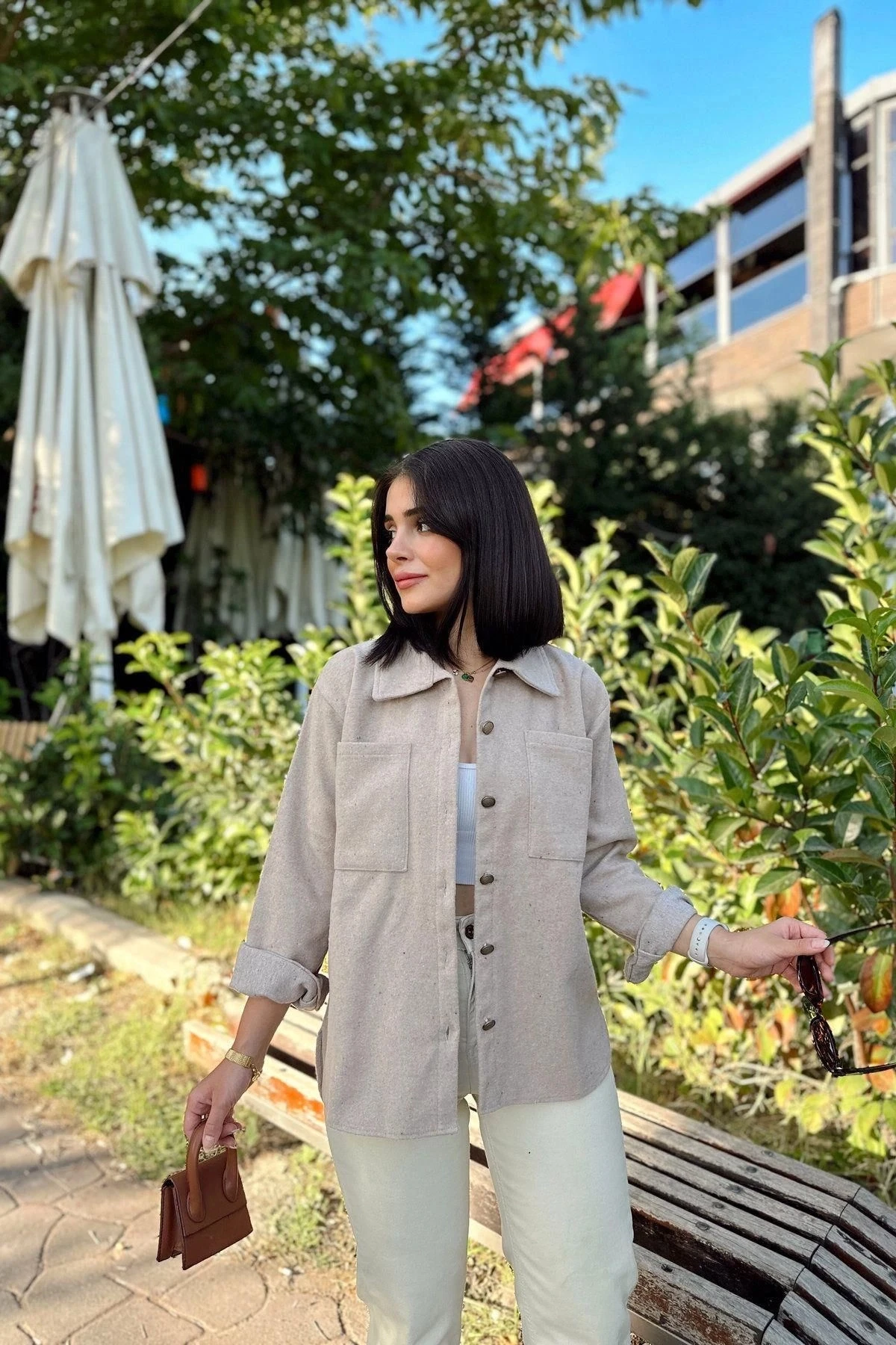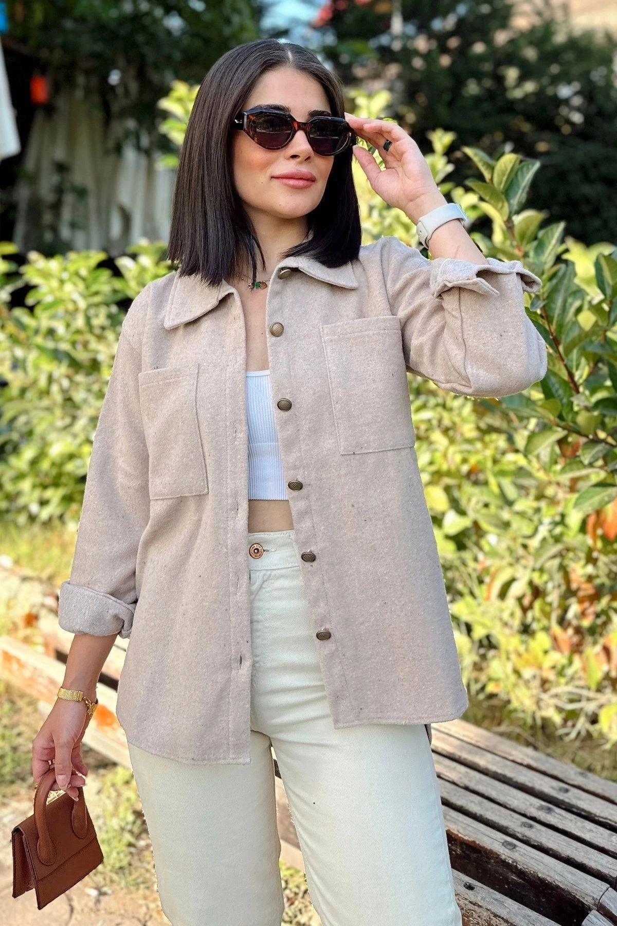 Kadın Taş Rengi Uzun Kol, Çift Cepli, Eteği Oval Kesim, Kaşe Gömlek Ceket