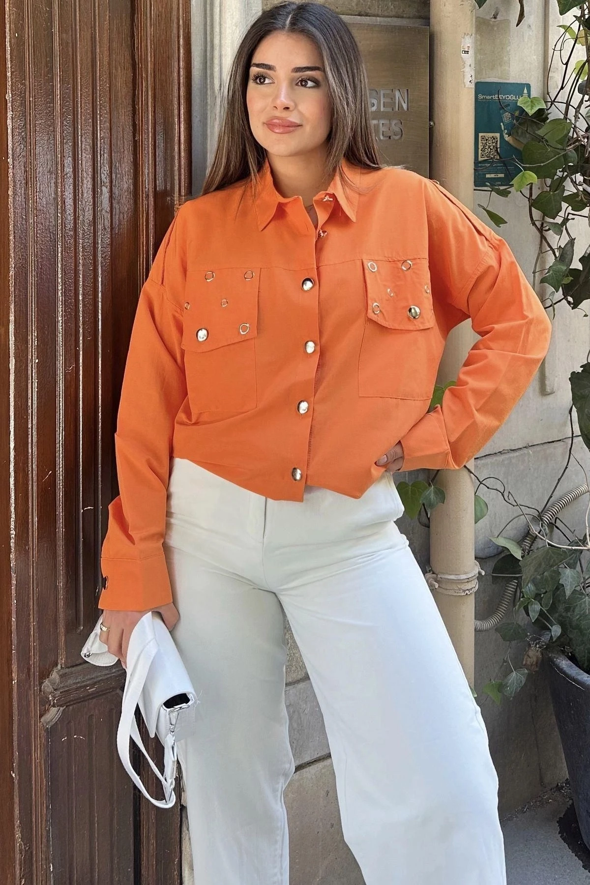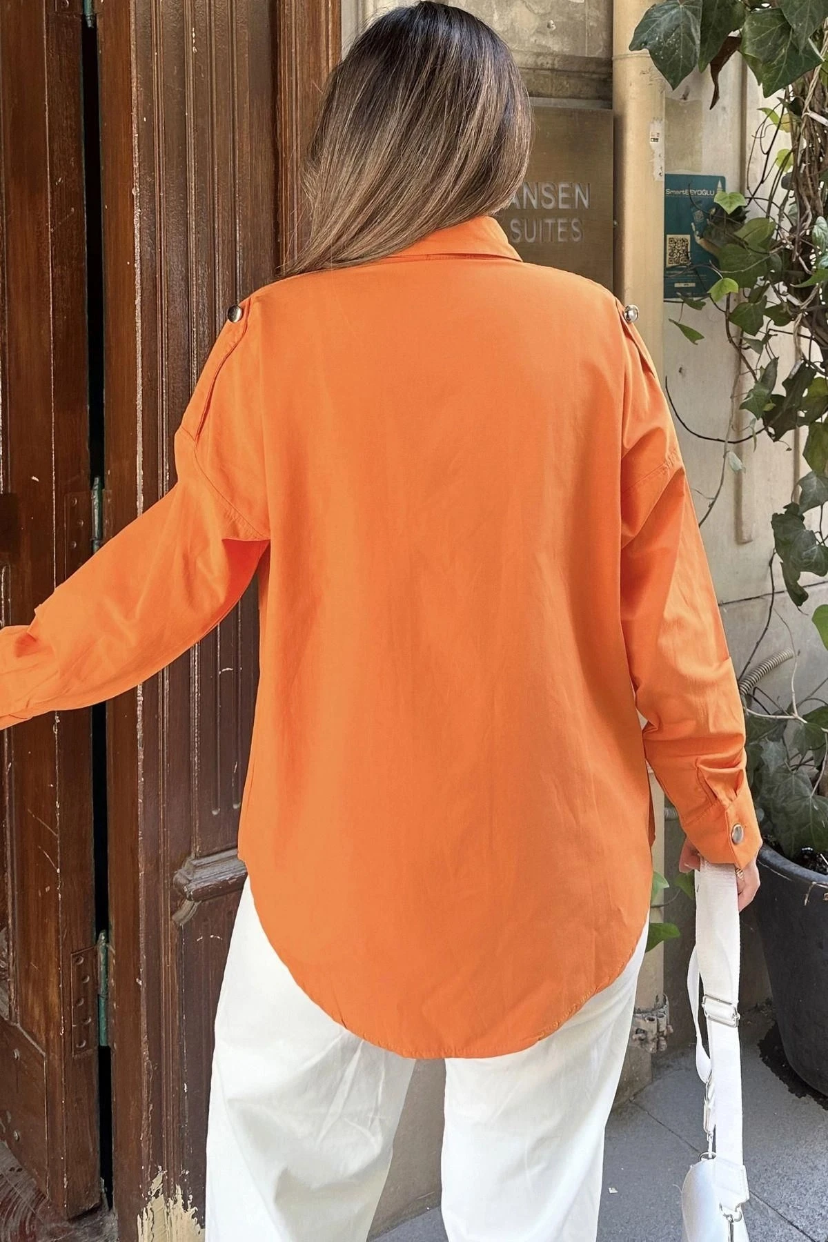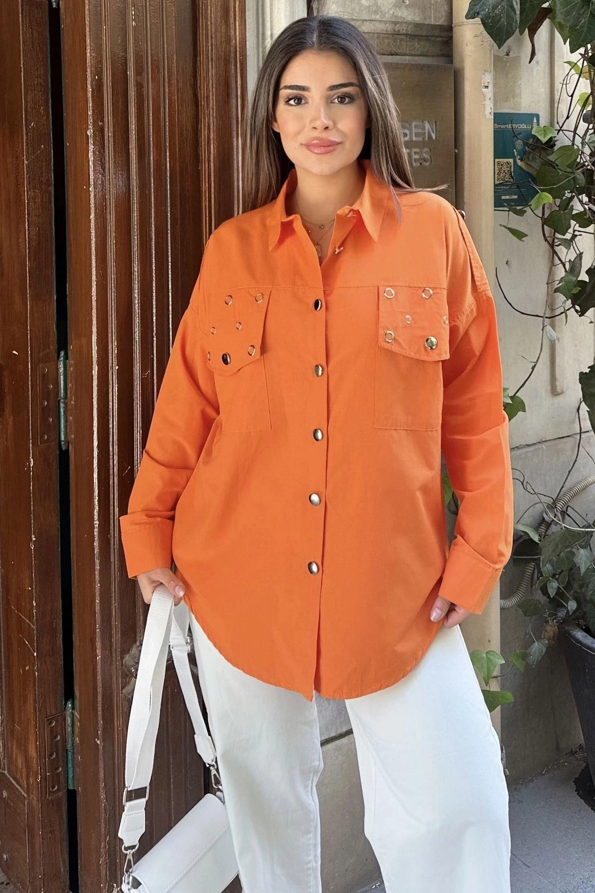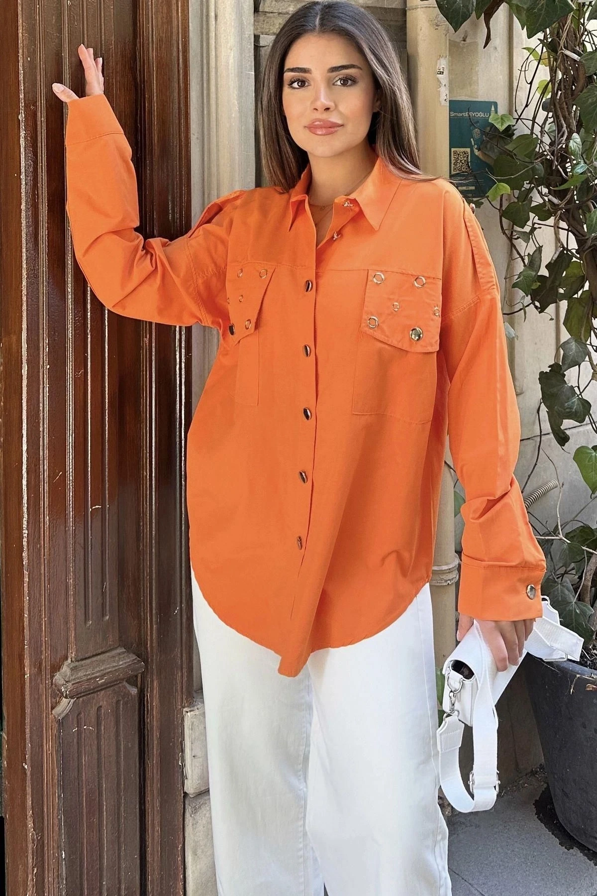 Kadın Turuncu Apolet Ve Zımba Detaylı, Salaş Kesim, Terletmez, Poplin Gömlek