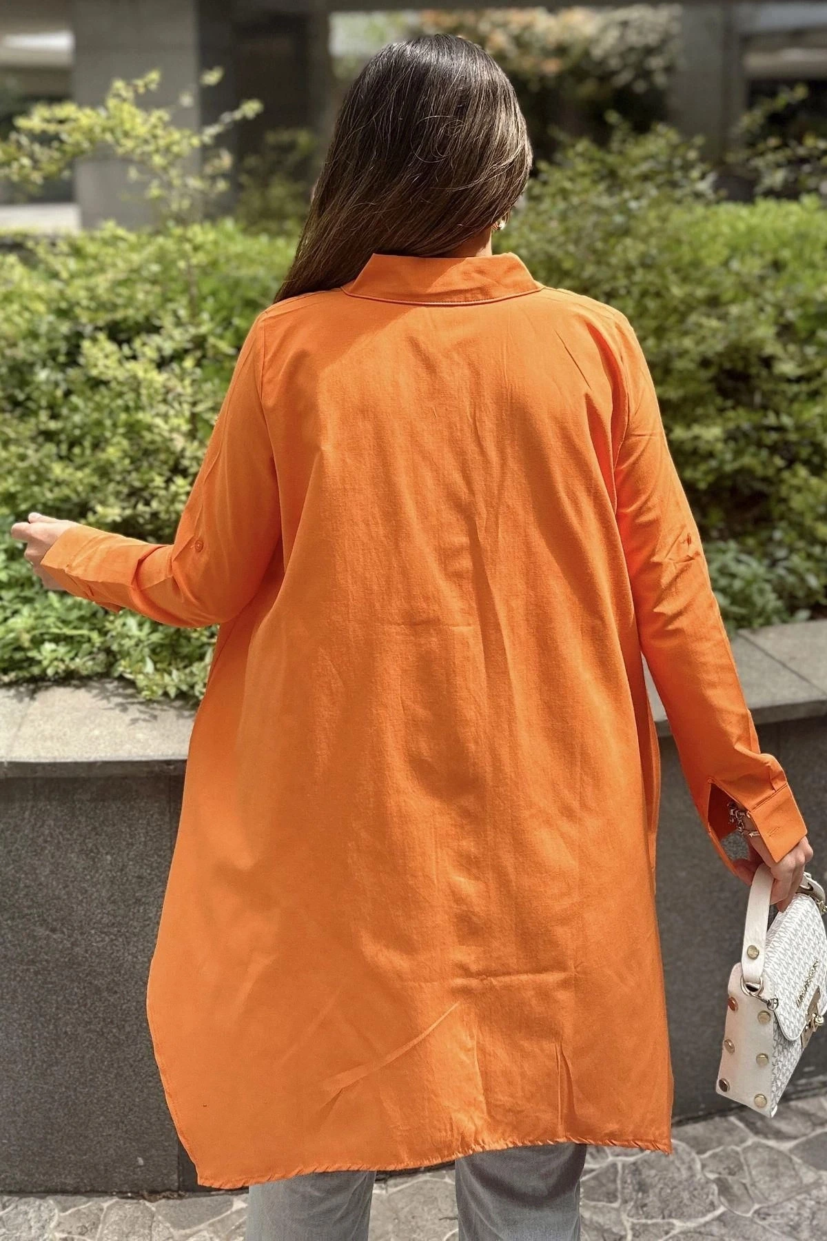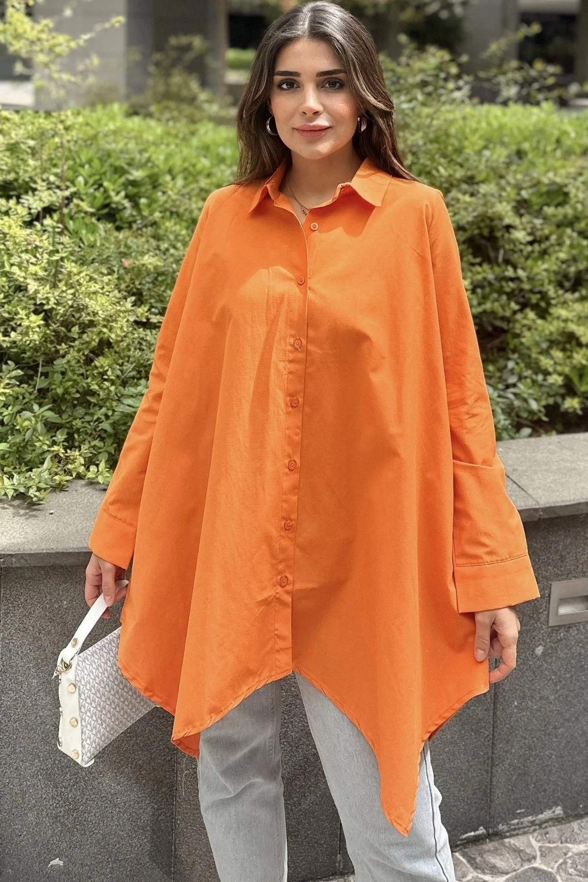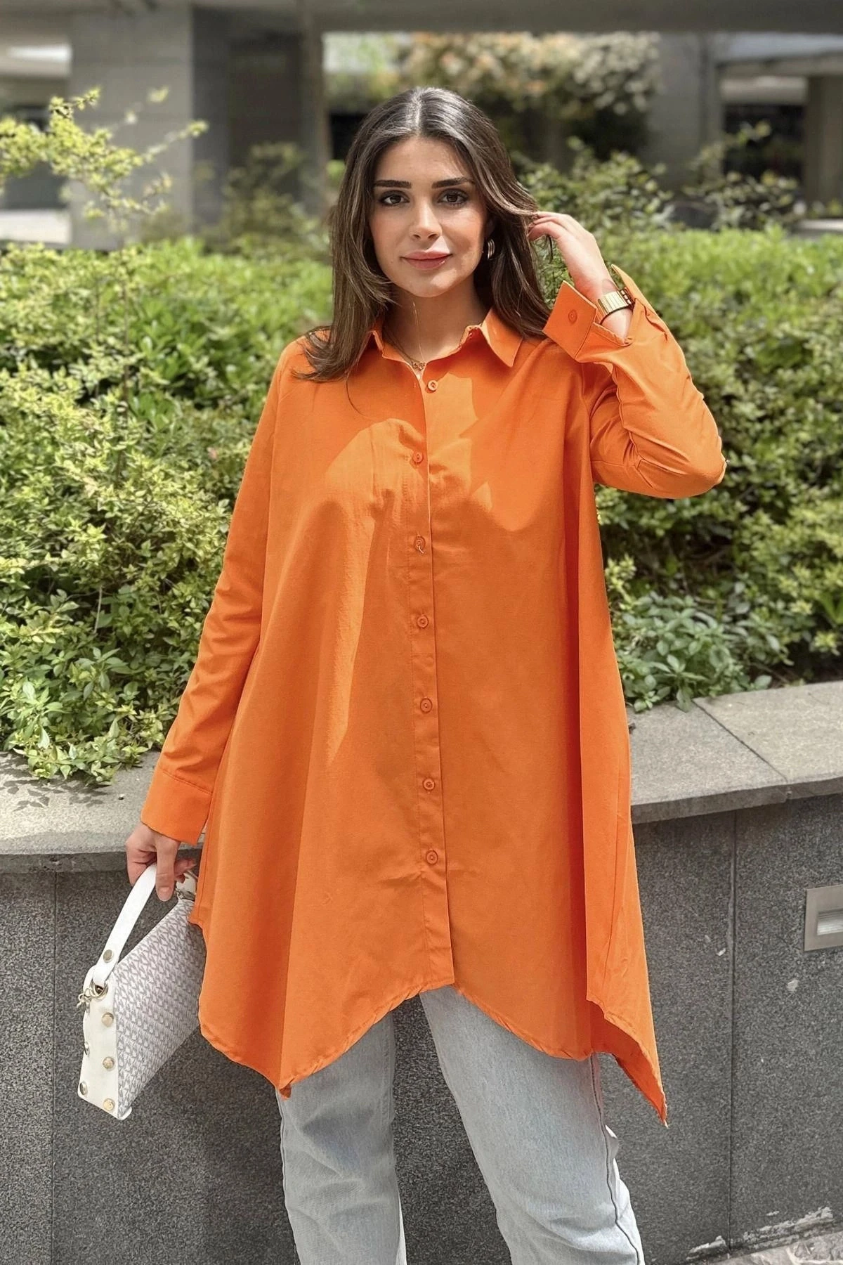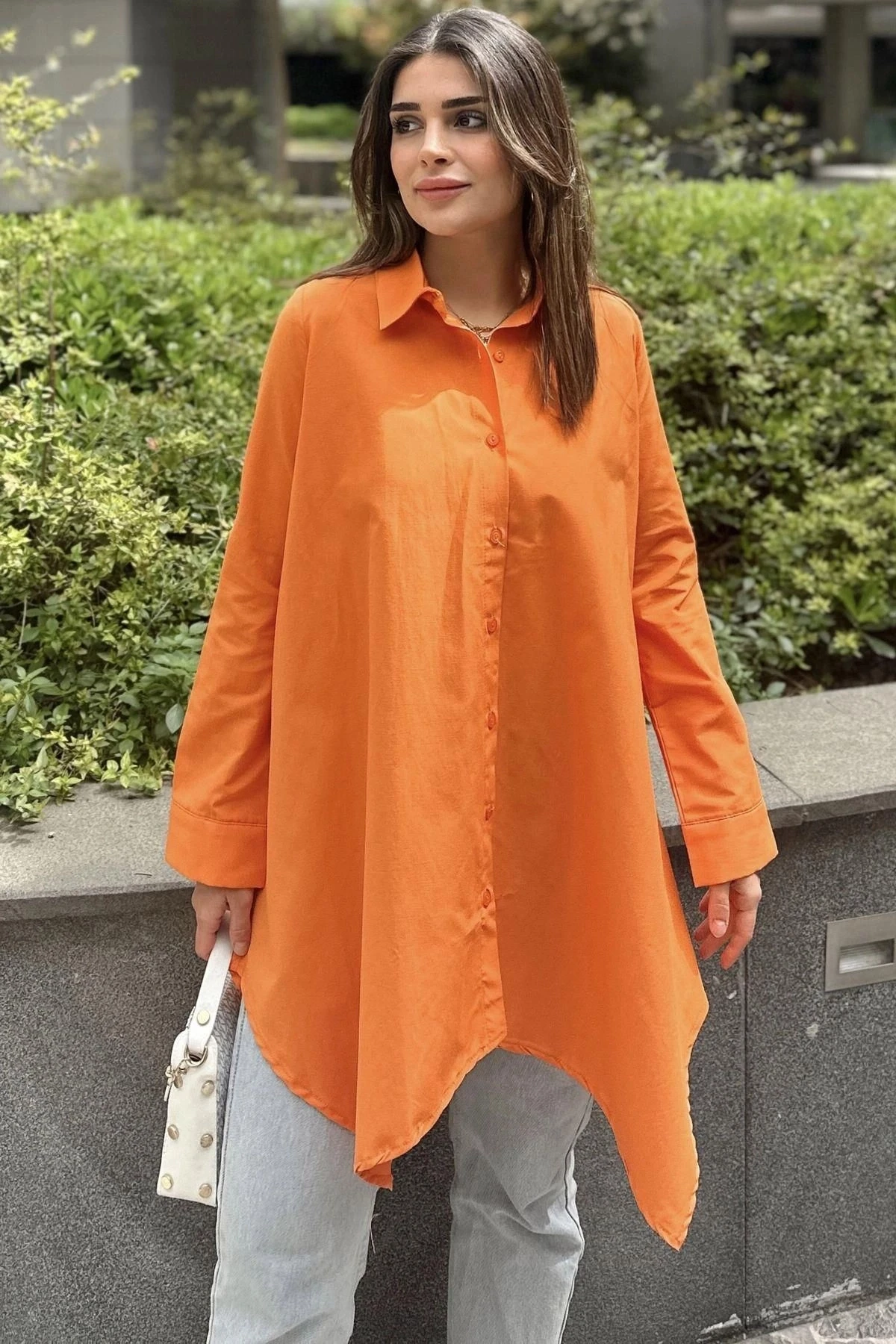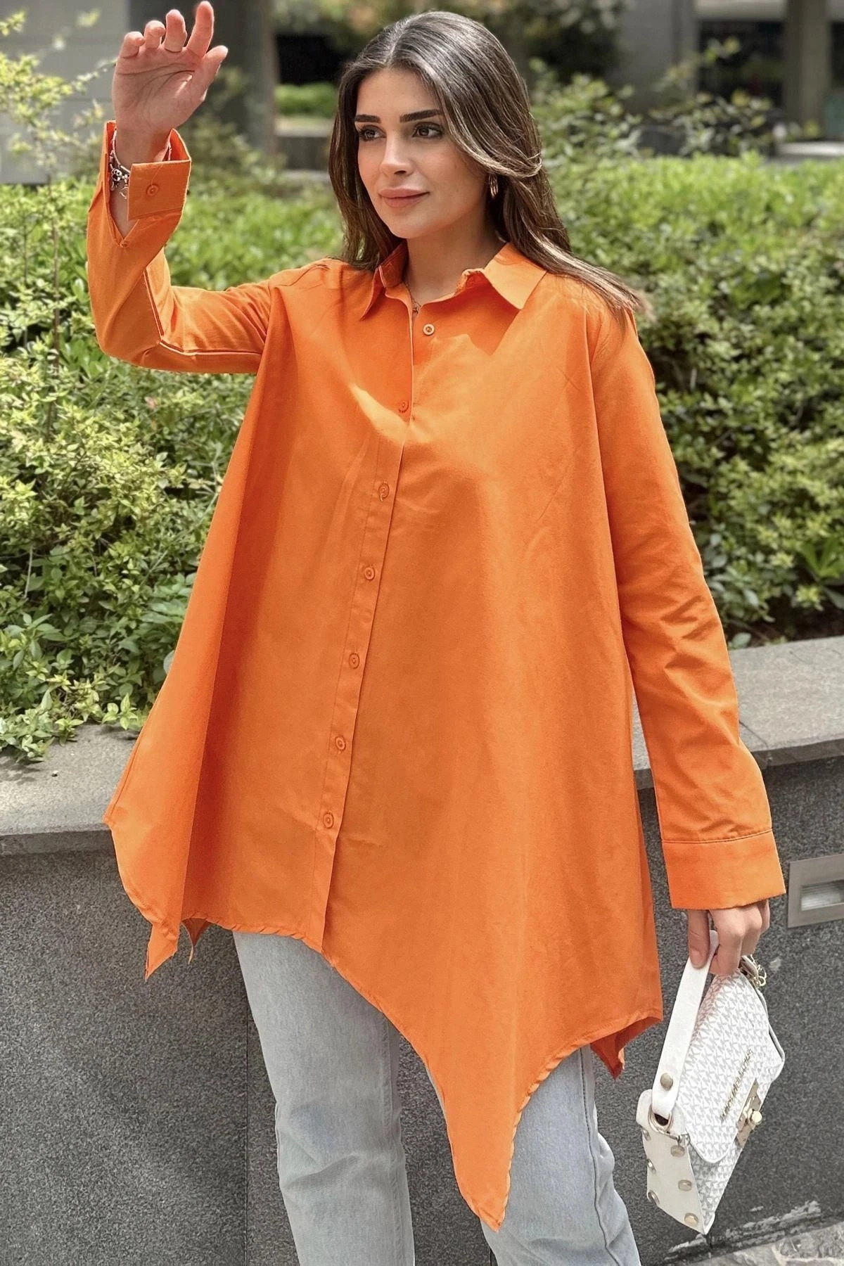 Kadın Turuncu Asimetrik Kesim, Uzun Kollu, Pamuklu Salaş Tunik Gömlek
