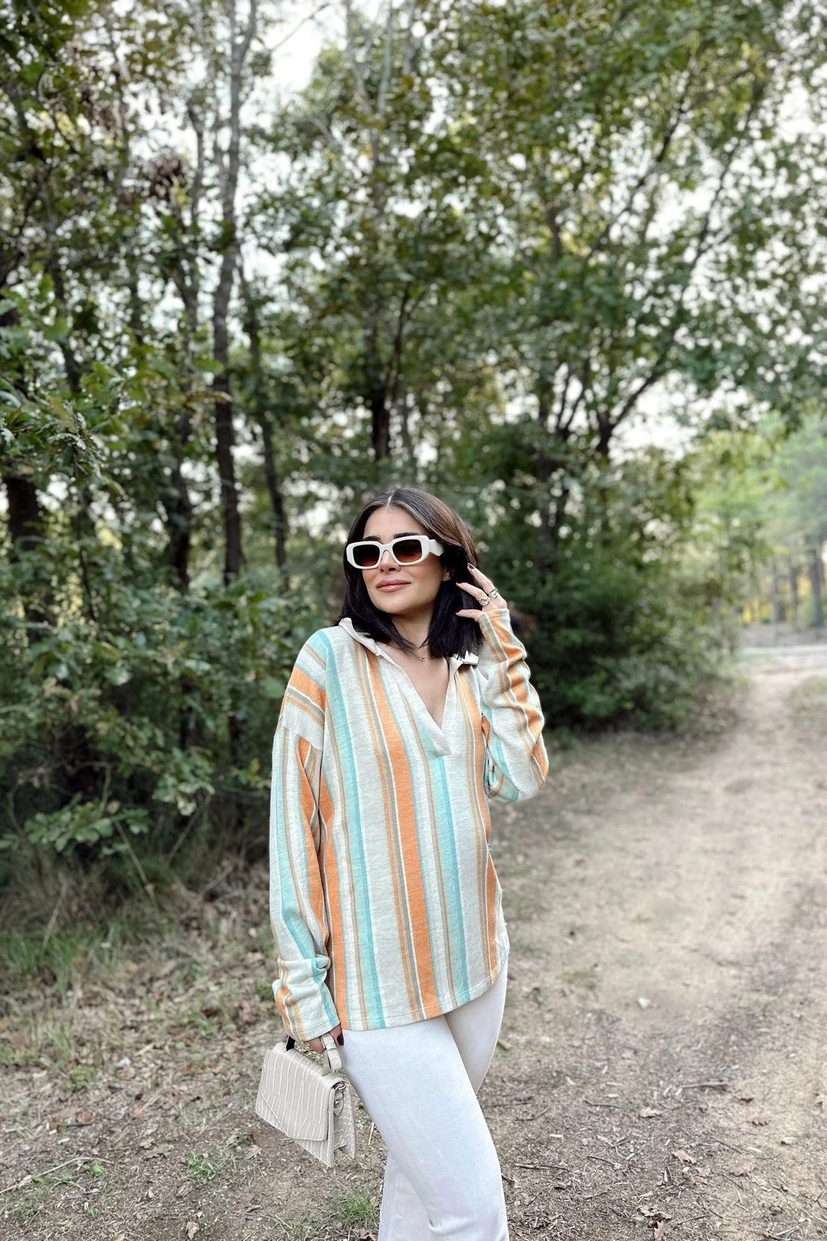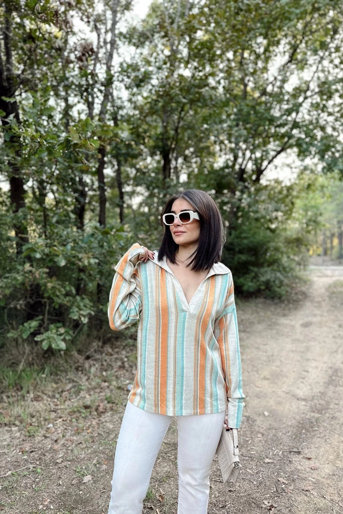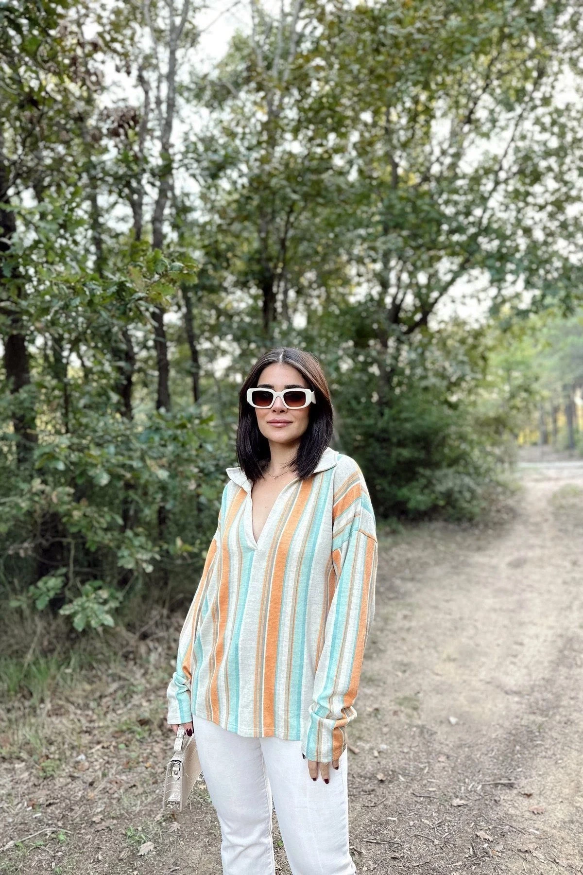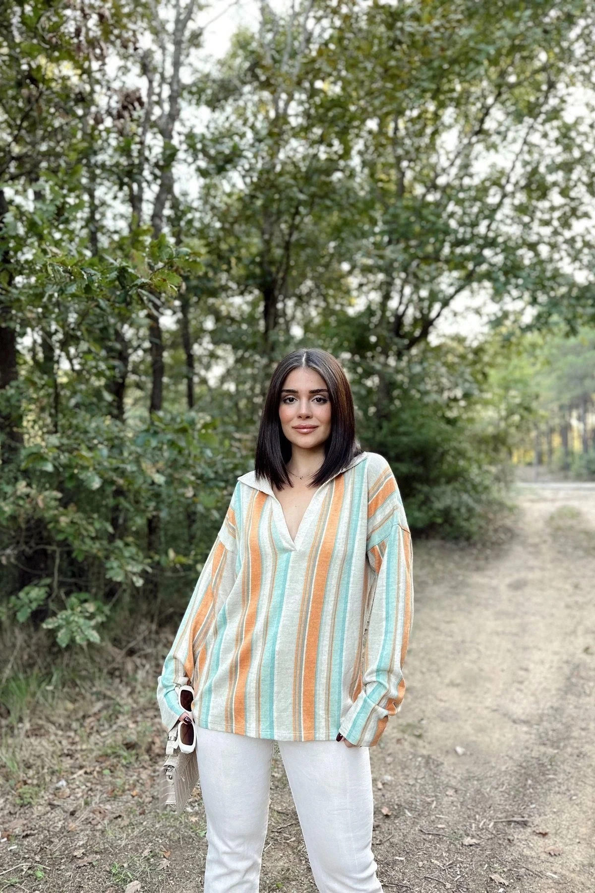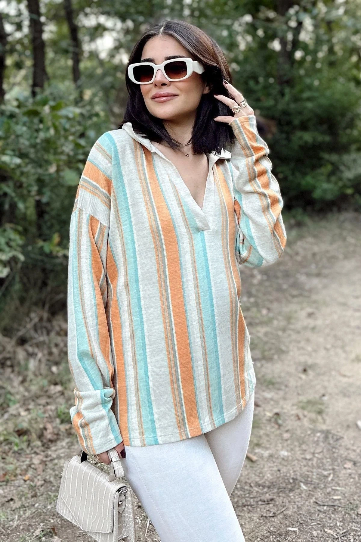 Kadın Turuncu & Bej Polo Yaka, Uzun Kollu, Çizgili, Salaş Dokuma Bluz