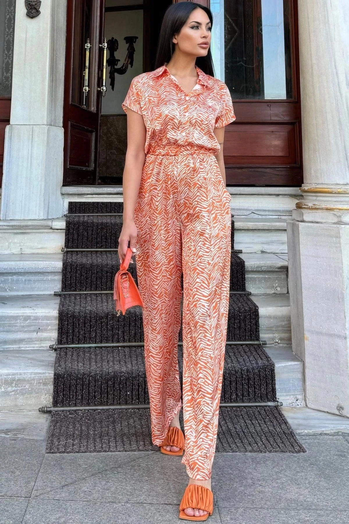 Kadın Turuncu Desenli, Yarım Kol Ve Yarım Patlı Gömlek Yaka, Beli Lastikli, Salaş Uzun Saten Tulum