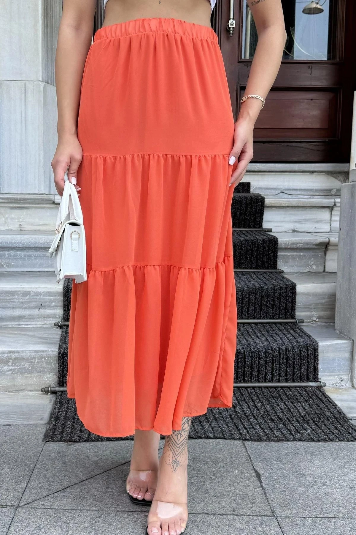 Kadın Turuncu Kat Kumaşlı, Rahat Kesim, Bel Lastikli, Uzun Şifon Etek